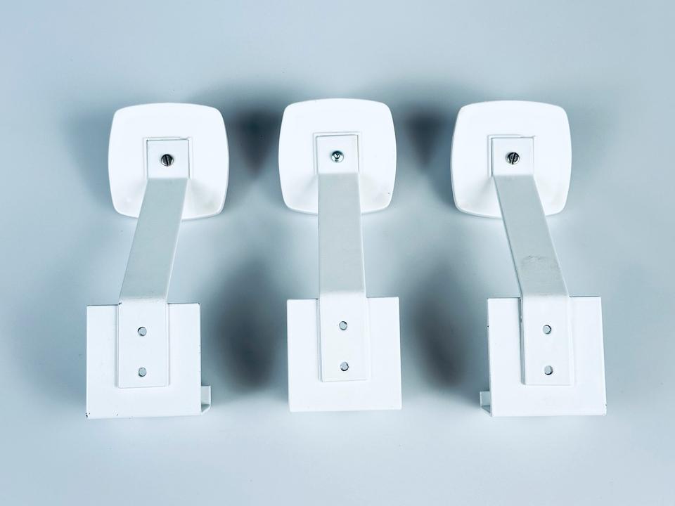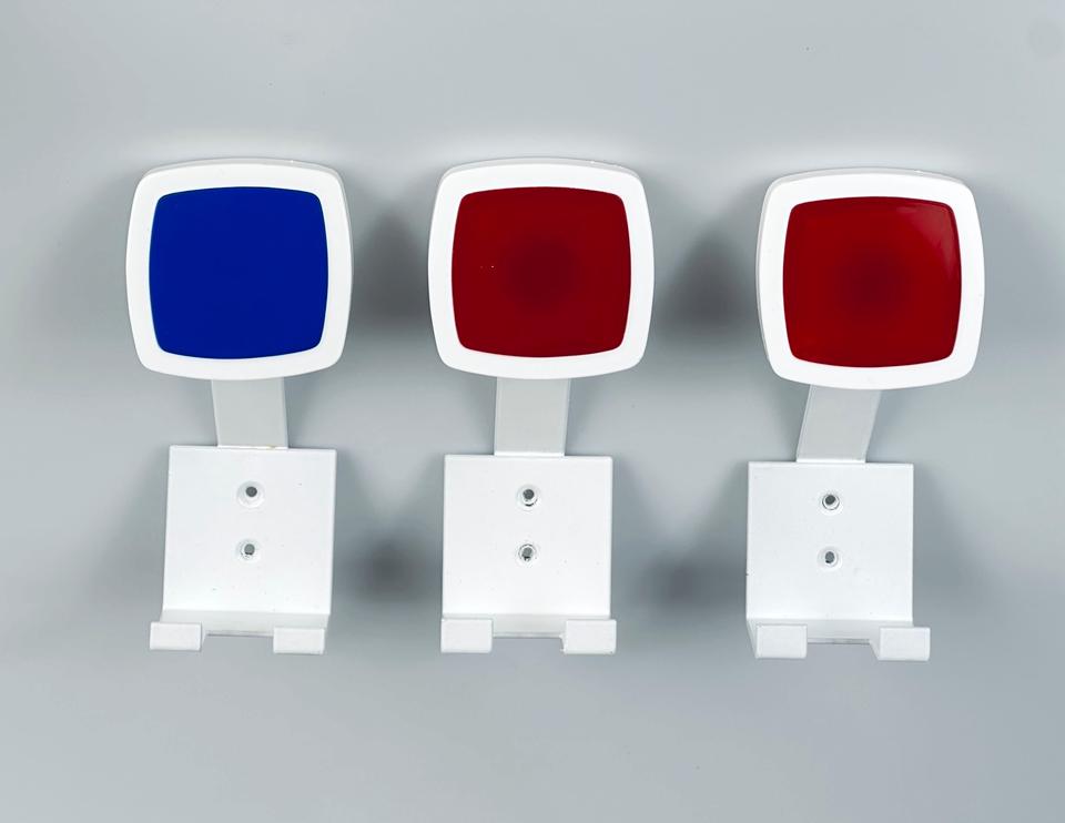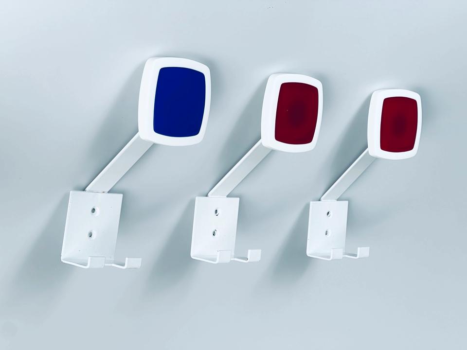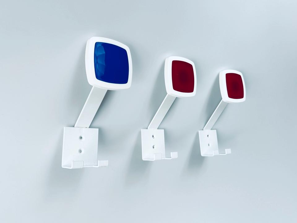 3 Garderobenhaken, hergestellt in den 1970er Jahre, aus weiss lackiertem Metall mit Plexigkaseinlage in rot und blau.
