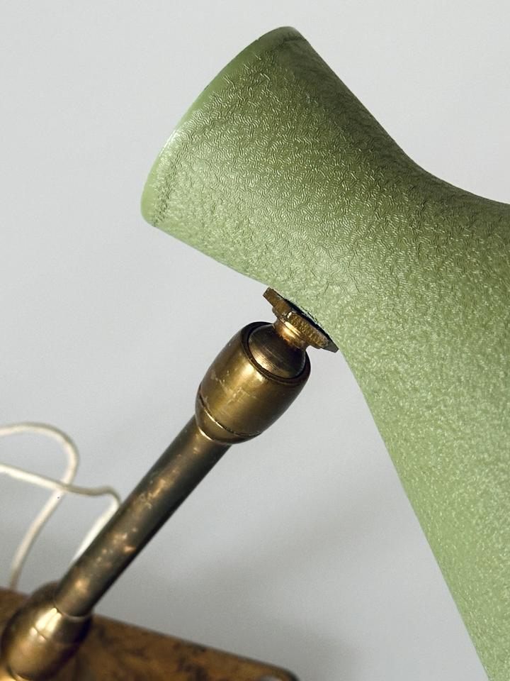 Kleine Wandleuchte, Italien, 1950er Jahre. Für die 50er typische Formgebung mit olivgrünem Schrumpflack, verstellbarem Messinghals mit Kugelgelenk, und Wandplatte zur Befestigung, ebenfalls aus Messing.