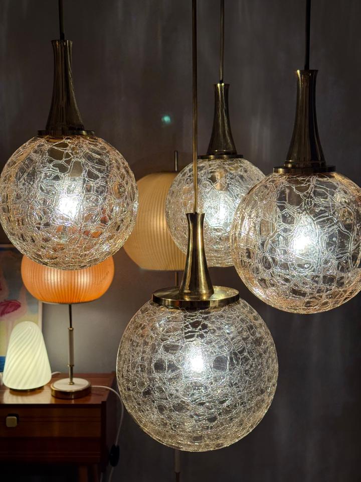 4 Pendel aus funkelndem Glas versehen mit hochwertigen goldenen Messing-Halterungen zaubern ein gleichzeitig edles und modernes Ambiente in jeden Raum. Die Kaskadenleuchte von Bankkamp, Deutschland, 1970er Jahre, ist hochwertig verarbeitet und in sehr gutem Zustand, das leicht bernsteinfarben getönte, handgefertigte Craquelé- Glas ist ohne jeden Makel, die Fassungshalterungen aus Messing zeigen wenige Gebrauchsspuren, ebenso der Baldachin aus Messing. Die Pendel können individuell in Höhe/ Länge angepasst werden. Sie sind jeweils mit einer E 27 Fassung versehen und können mit handelsüblichen LED-Leuchtmitteln bestückt werden.