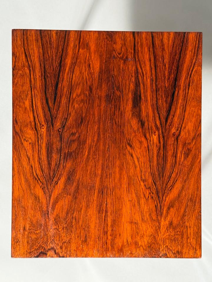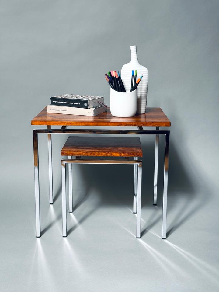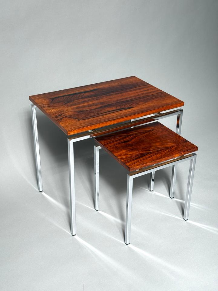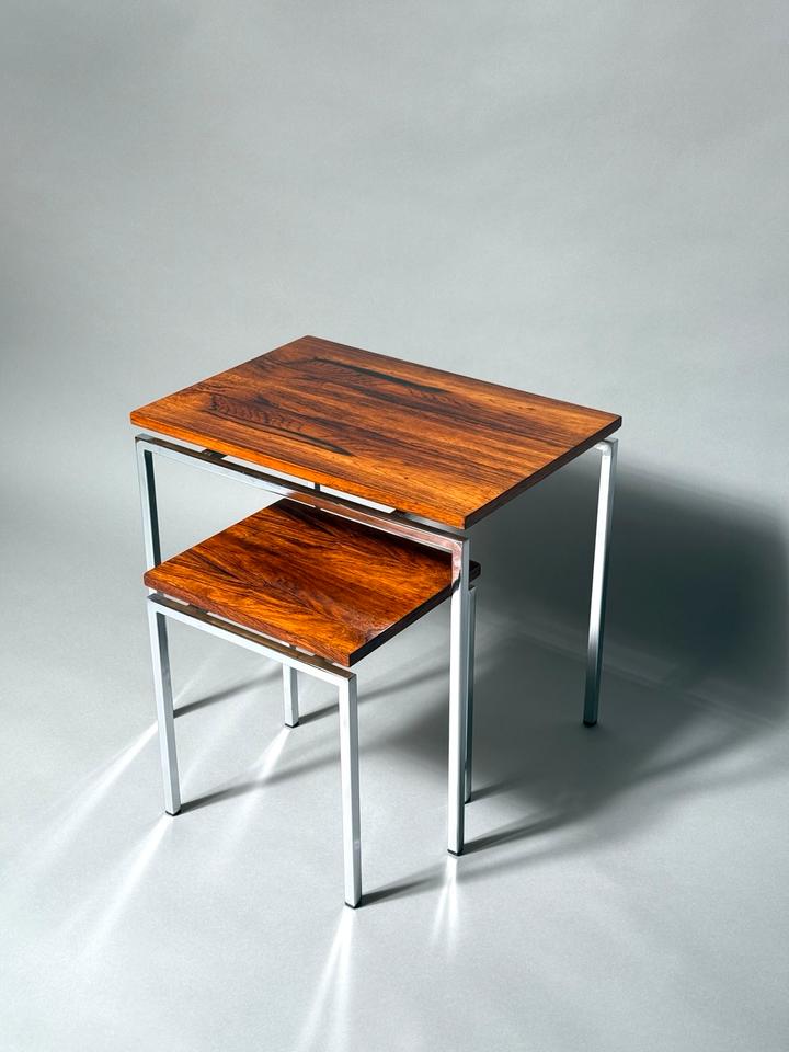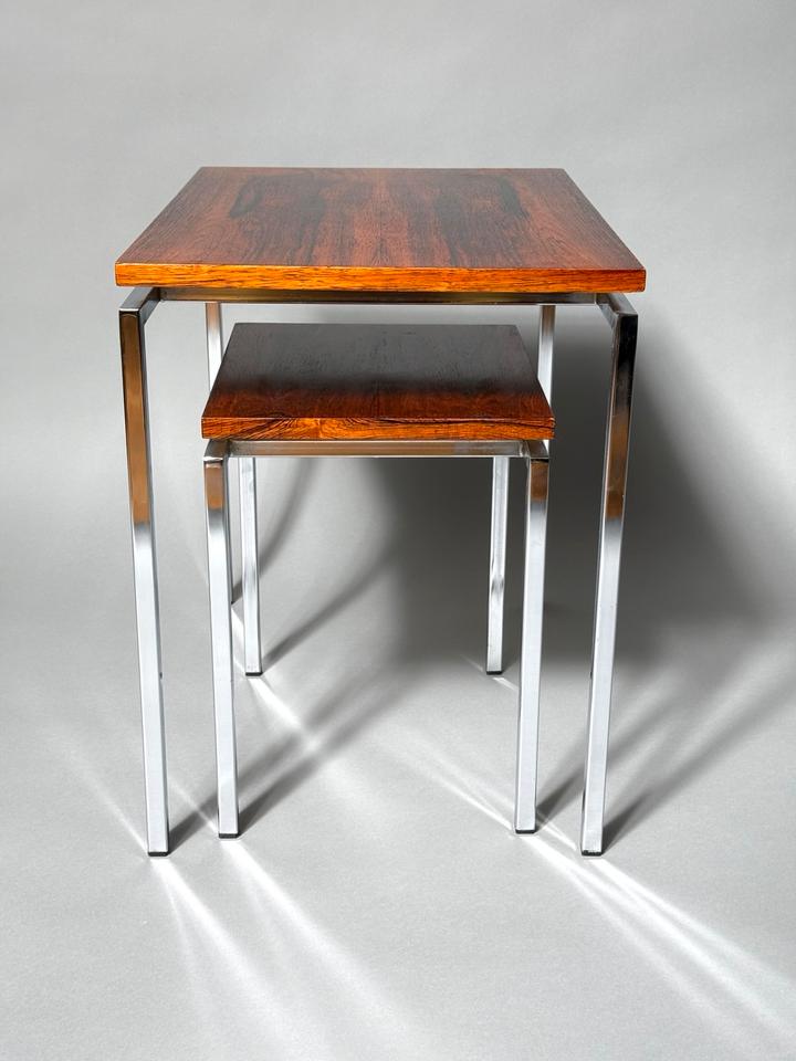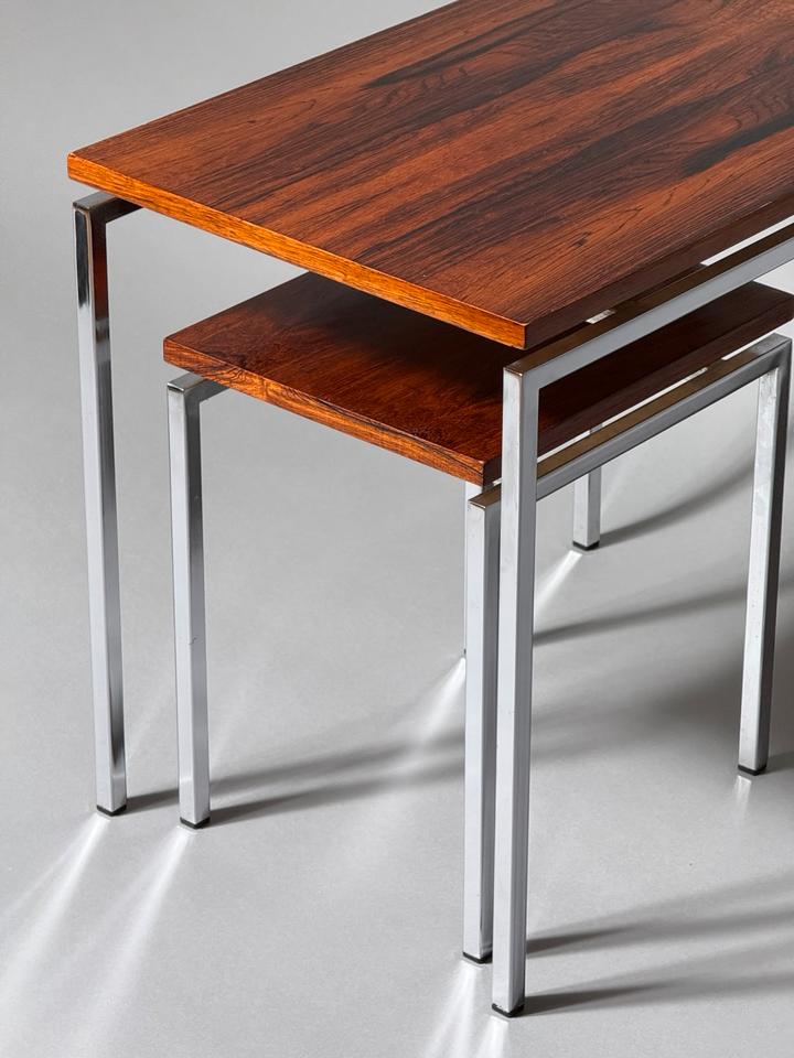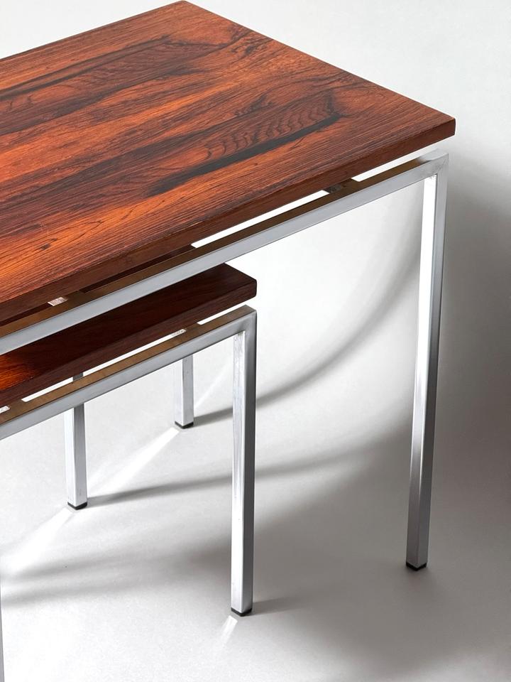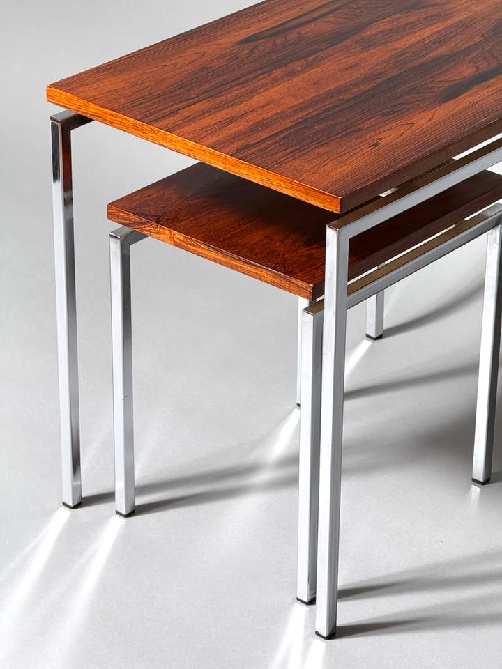 Set aus zwei Beistelltischen, Niederlande, 1970er. Die rechteckigen Tische bestehen aus jeweils einer aus Palisanderholz furnierten Platte auf einem verchromten Metallgestell. Die Platten scheinen über den Gestellen zu schweben. Ein minimalistisches und elegantes Design. Der Zustand ist sehr gut, das Holz wurde überarbeitet, geölt und gewachst.