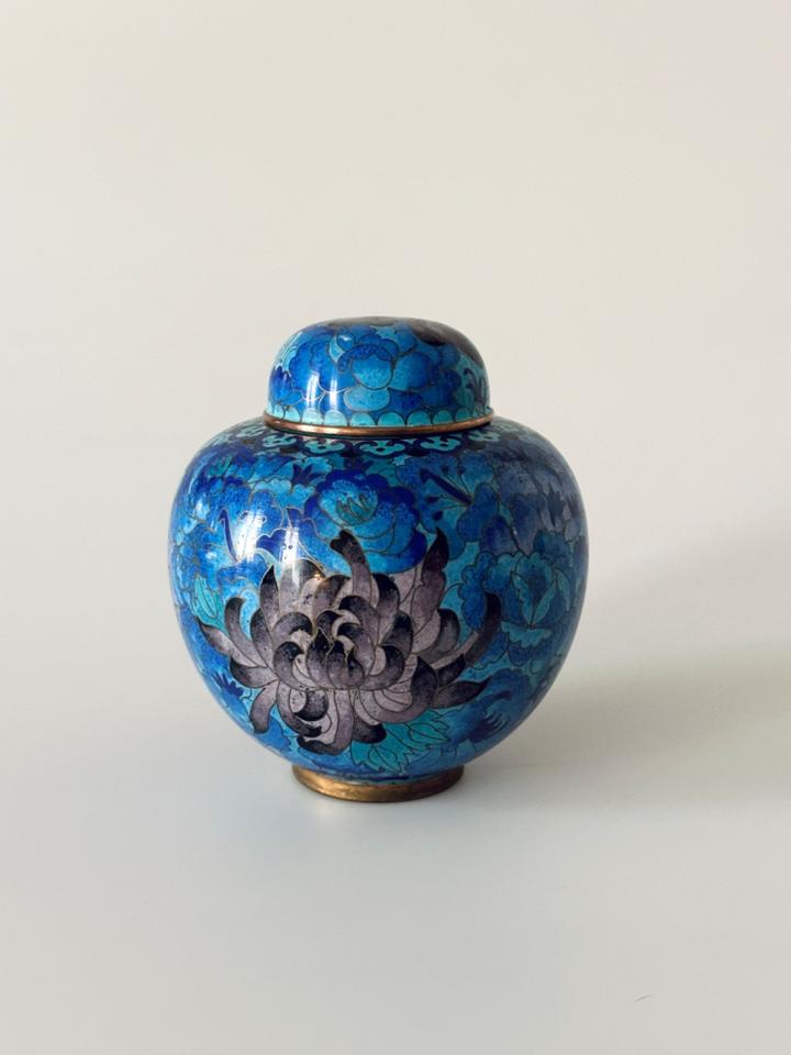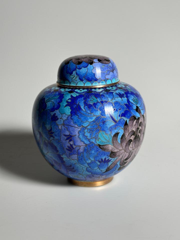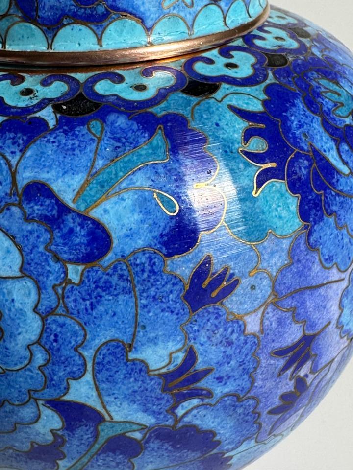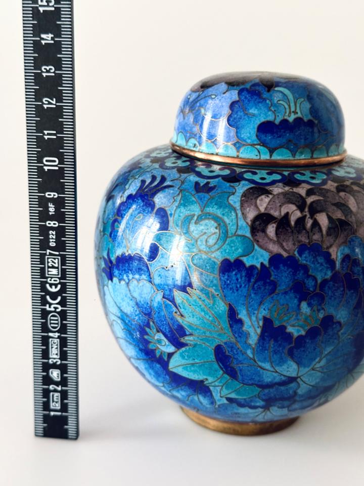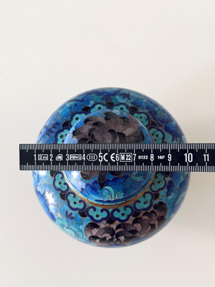 In wunderschönen Blautönen gearbeitete Cloisonné- Deckeldose mit Chrysanthemen verziert, sehr guter Zustand ohne jedwede Beschädigung. Gereinigt und poliert.