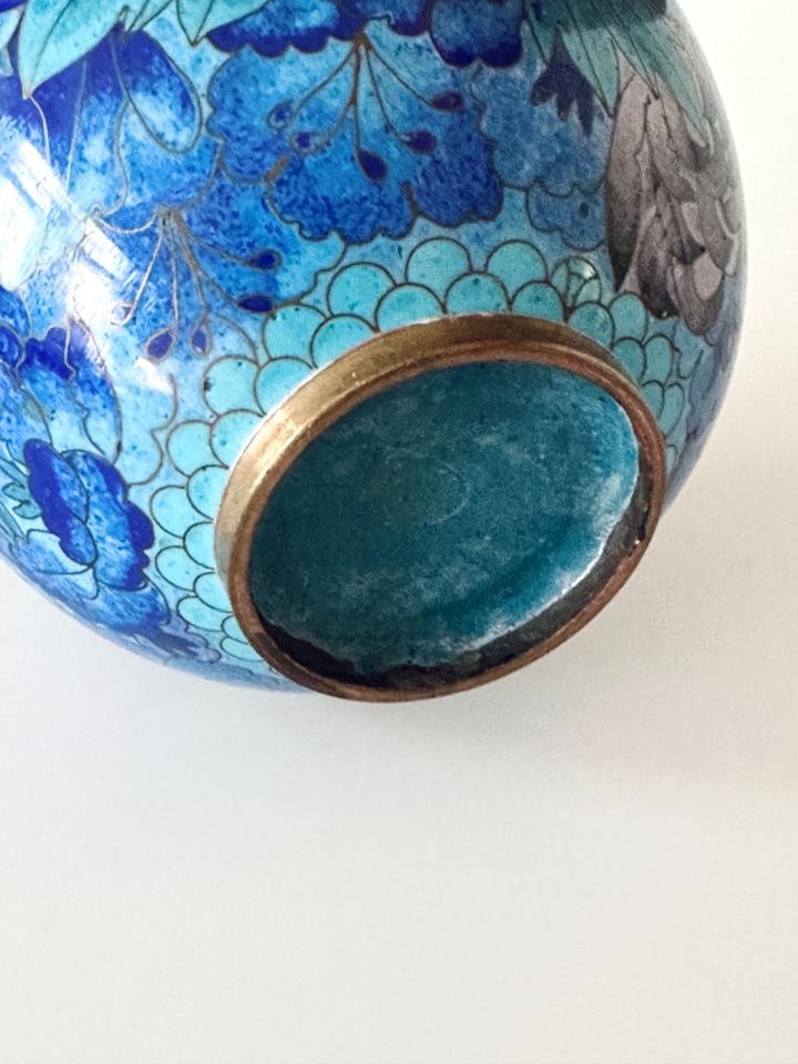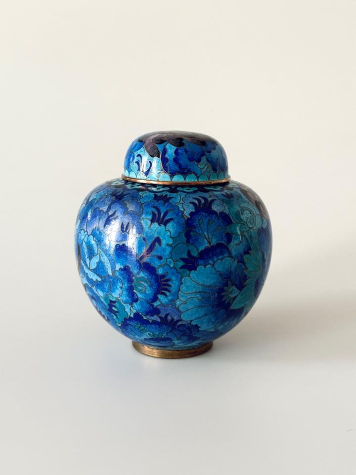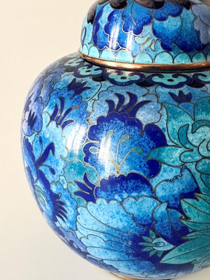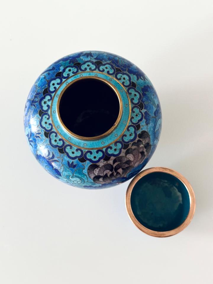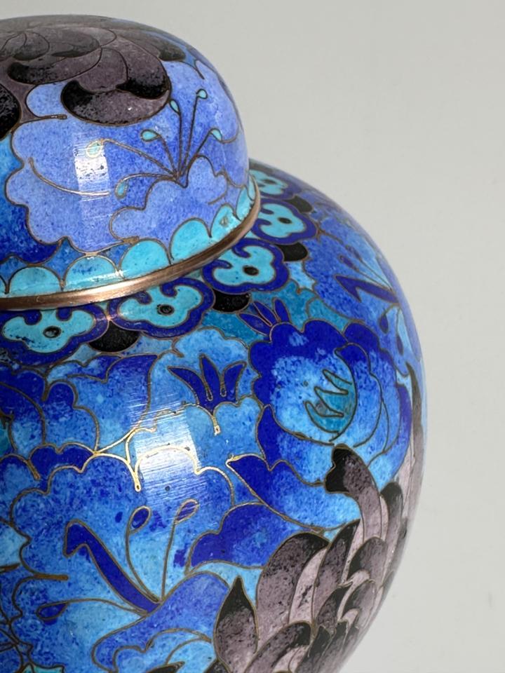 In wunderschönen Blautönen gearbeitete Cloisonné- Deckeldose mit Chrysanthemen verziert, sehr guter Zustand ohne jedwede Beschädigung. Gereinigt und poliert.