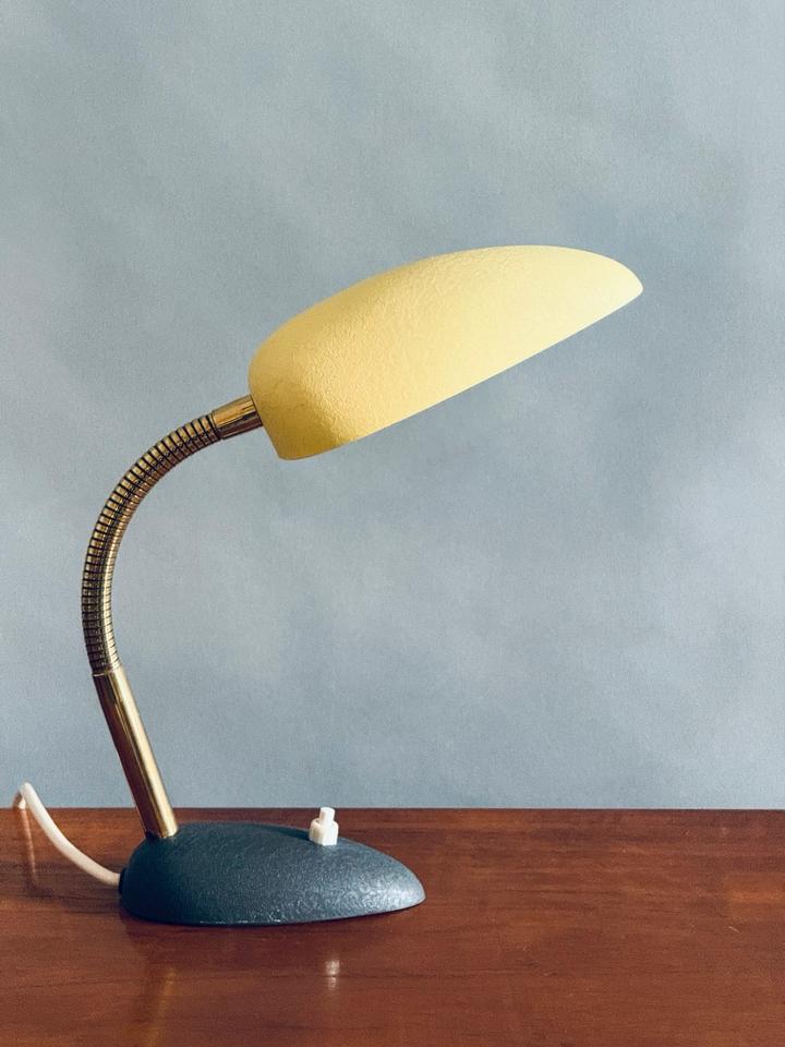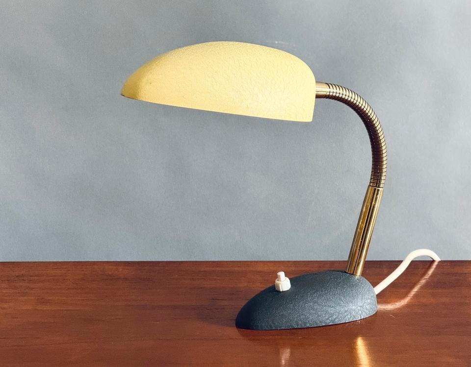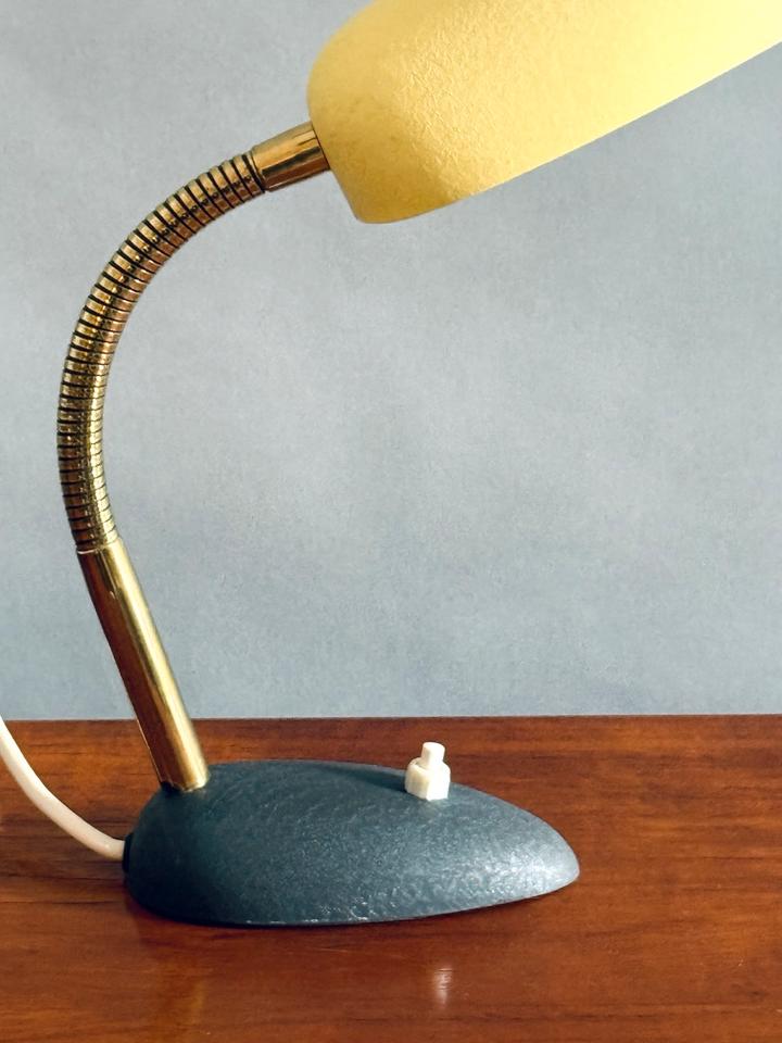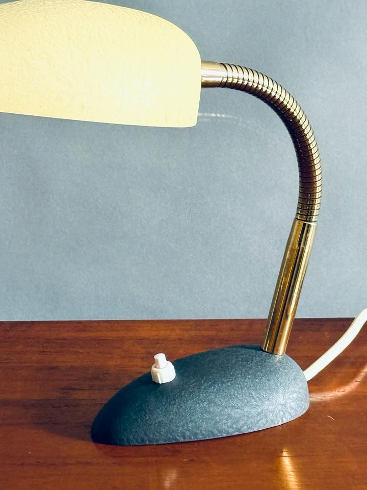 Kleine Tischleuchte von Cosack, 1950er Jahre. Für die 50er typische Formgebung mit leuchtendem hellgelben Schrumpflack, verstellbarem Schwanenhals aus Messing und schwerem Fuß in anthrazitfarbenem Schrumpflack.