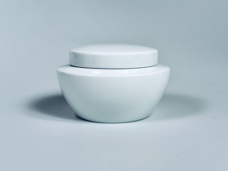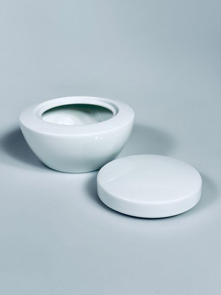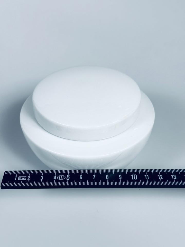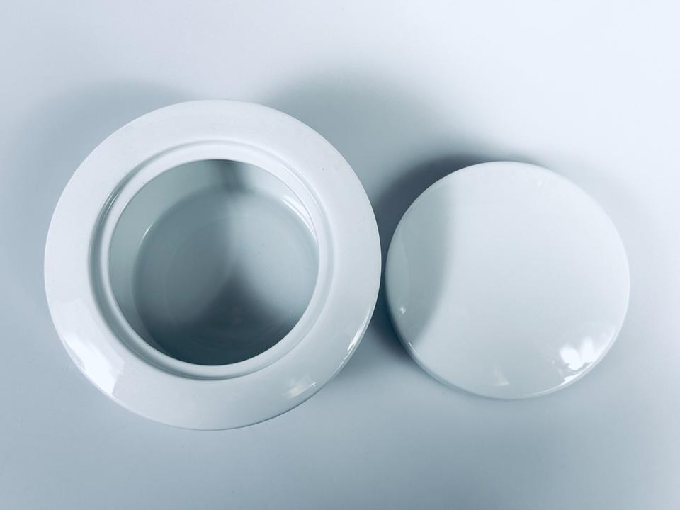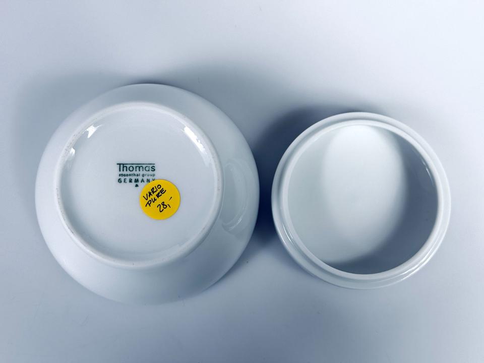Deckeldose aus weißem hochglänzendem Porzellan von Thomas, Rosenthal Group, Serie Vario pure. Sie befindet sich in einem sehr guten Zustand mit nur minimalen Gebrauchsspuren in Form von kleinen Kratzern. Keinerlei Chips oder Sprünge.