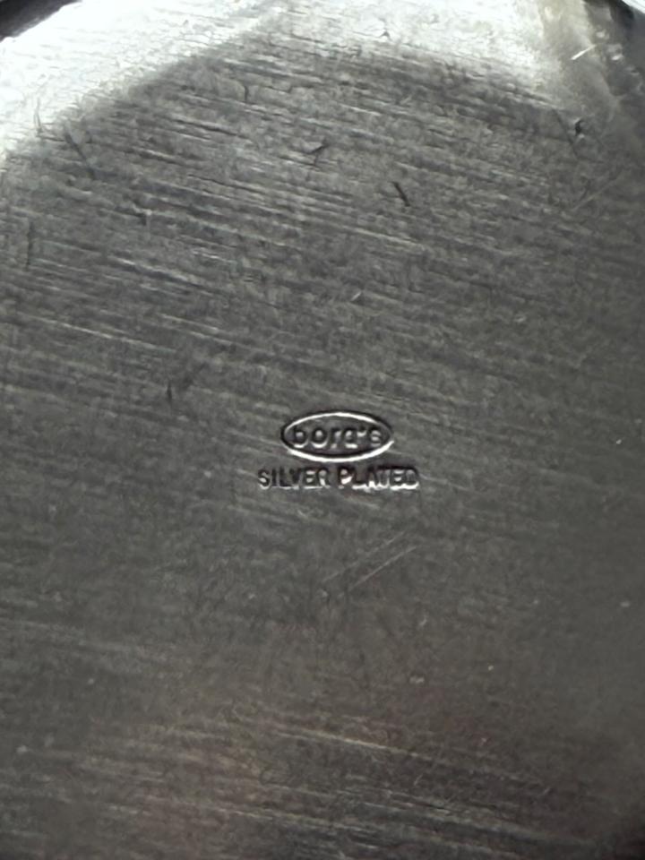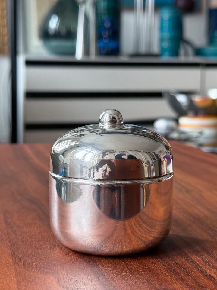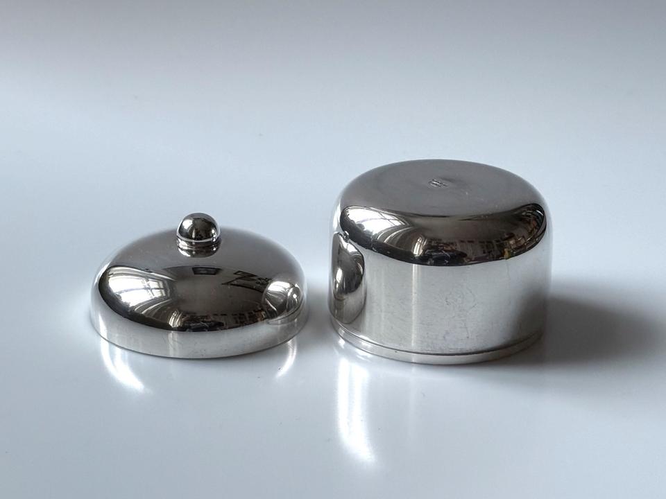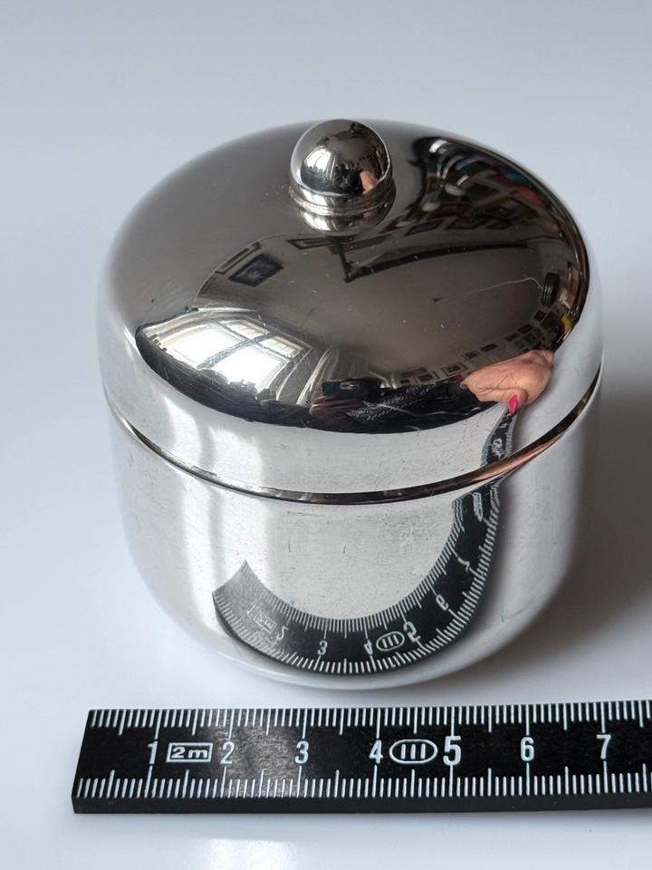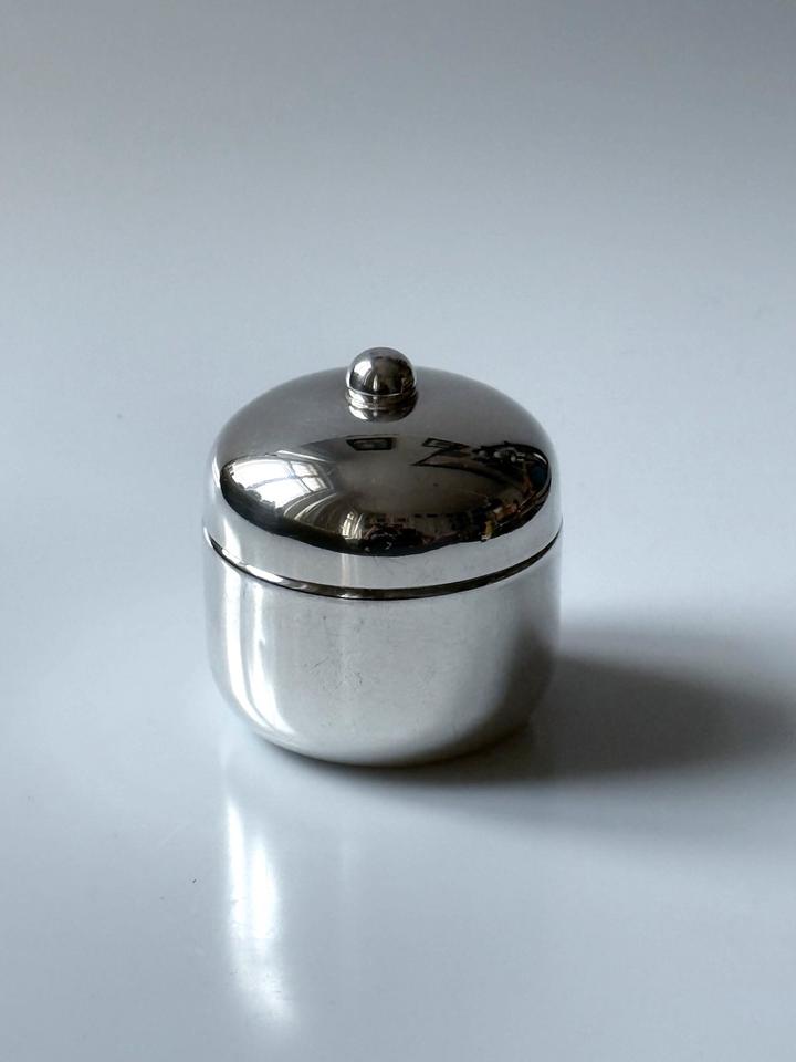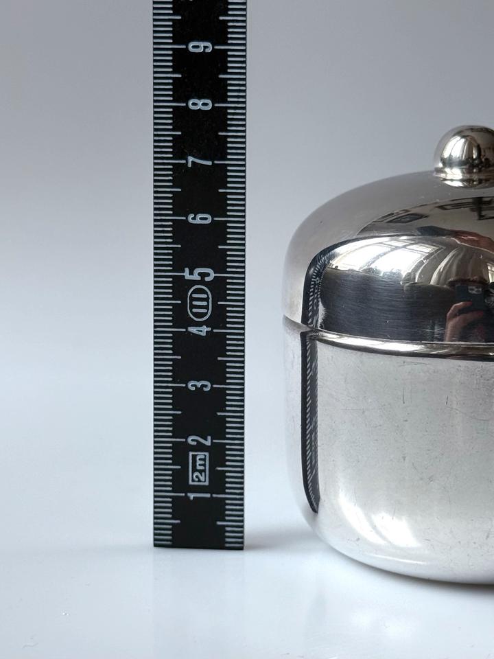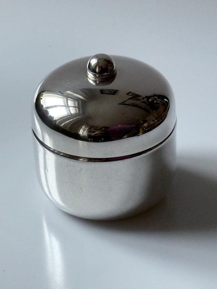 Kleine Deckeldose, versilbert, bora’s Italy, 1960er. Sehr guter Zustand mit nur minimalen Gebrauchsspuren in Form von kleinen Kratzern, innen leichte Oxidationsspuren, siehe Bilder. Bodenseitig gestempelt mit bora’s silverplated ( war für den Export bestimmt).
