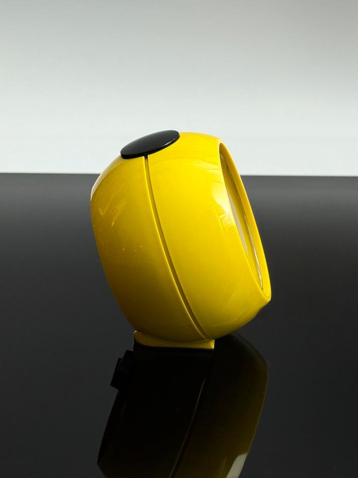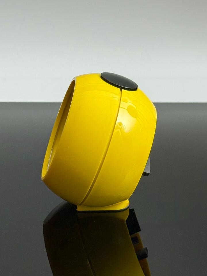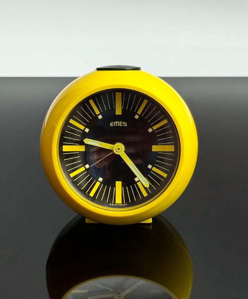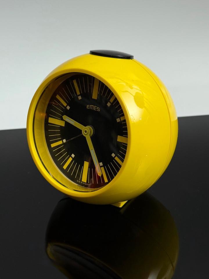 Mechanischer Wecker aus Kunststoff, Emes Deutschland, 1970er. Der im Stil des Space Age gehaltene gelbe Wecker funktioniert tadellos und befindet sich in sehr gutem