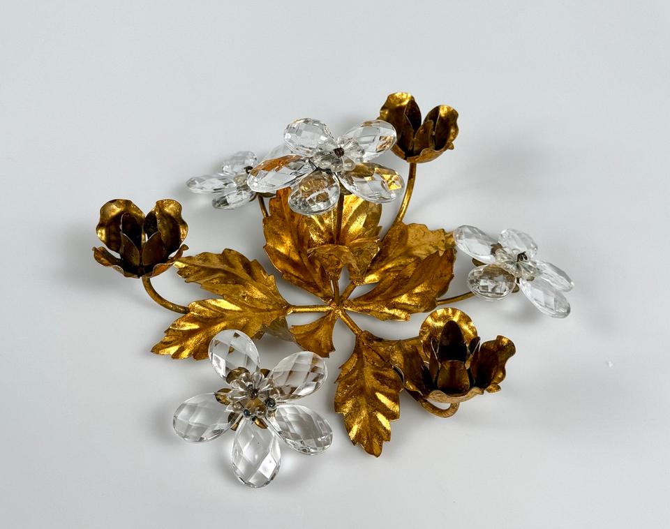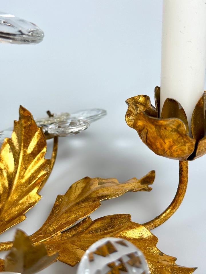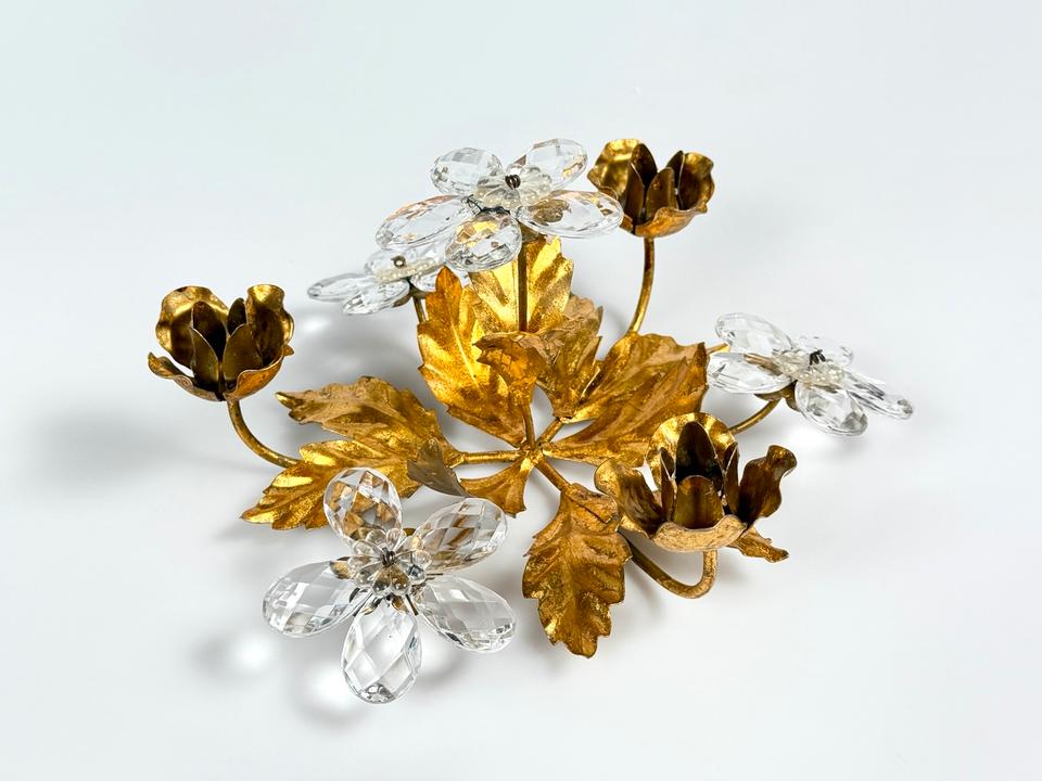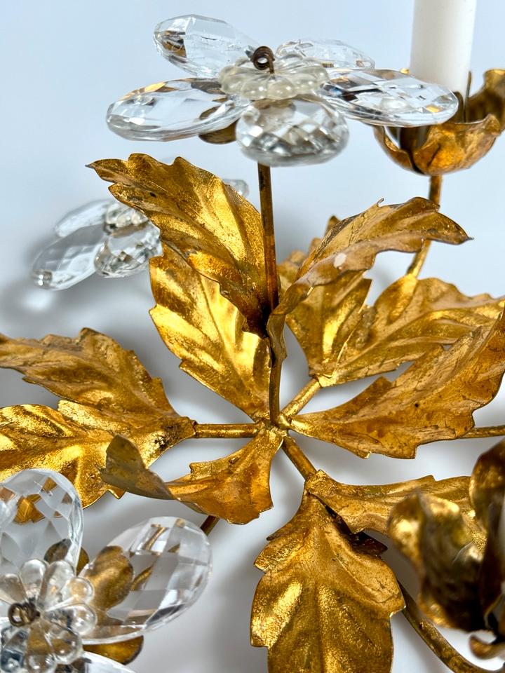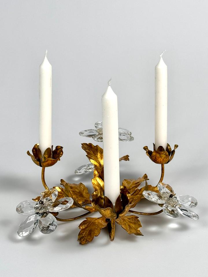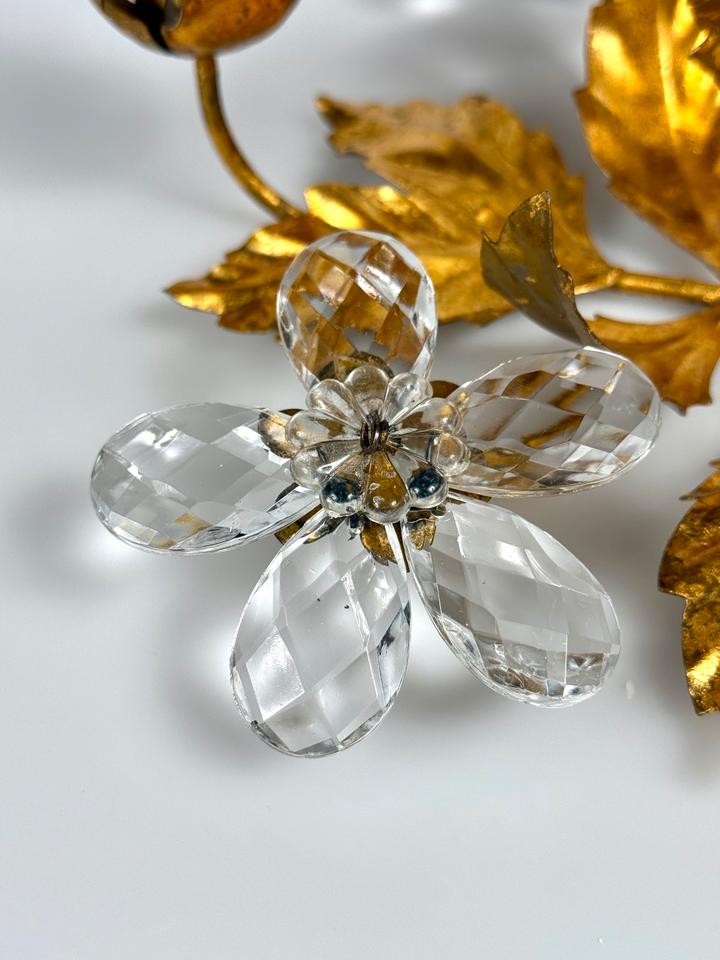 Dreiflammiger Kerzenständer aus vergoldetem Metall und Muranoglas, hergestellt von Banci Firenze, Italien, 1960er Jahre. Der florentinische Kerzenhalter ist floral verziert mit vergoldeten Blättern und zarten Zweigen, welche mit Blüten aus facettierten Muranoglas- Kristallen besetzt sind.