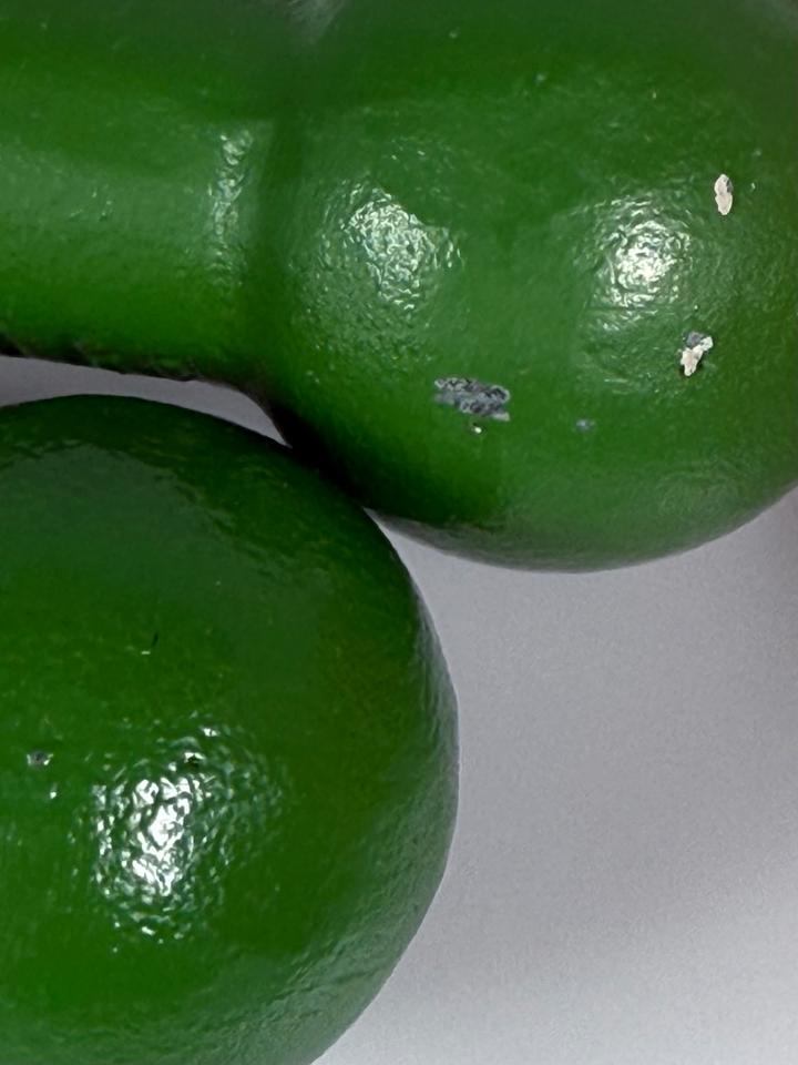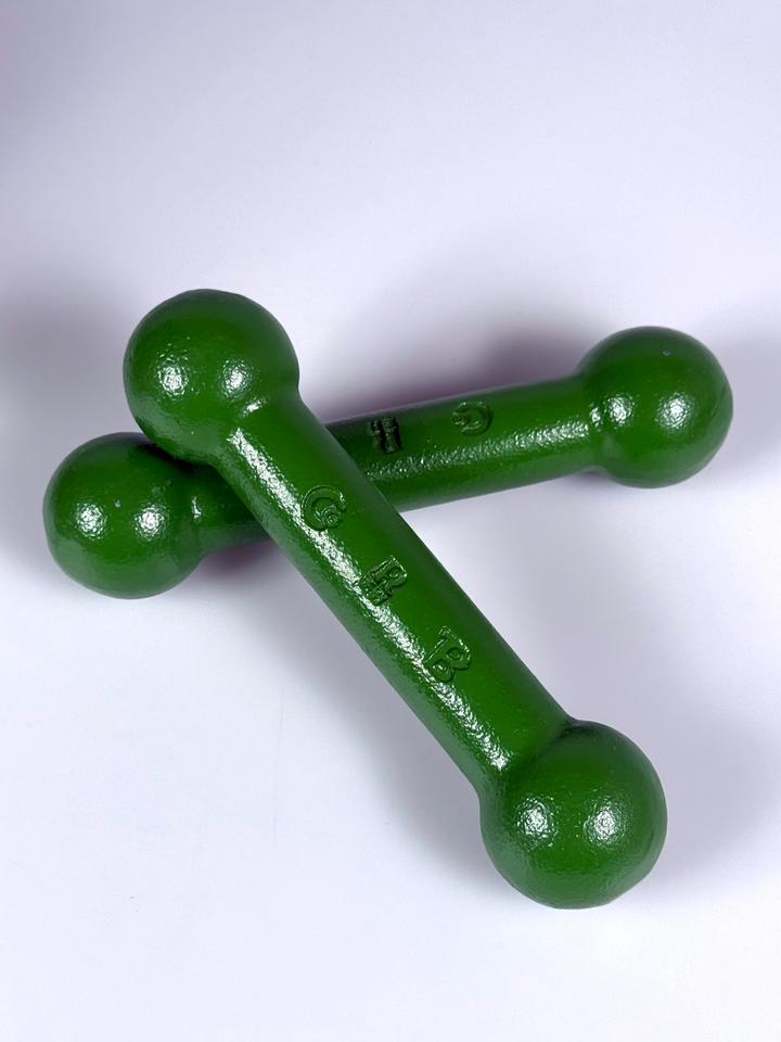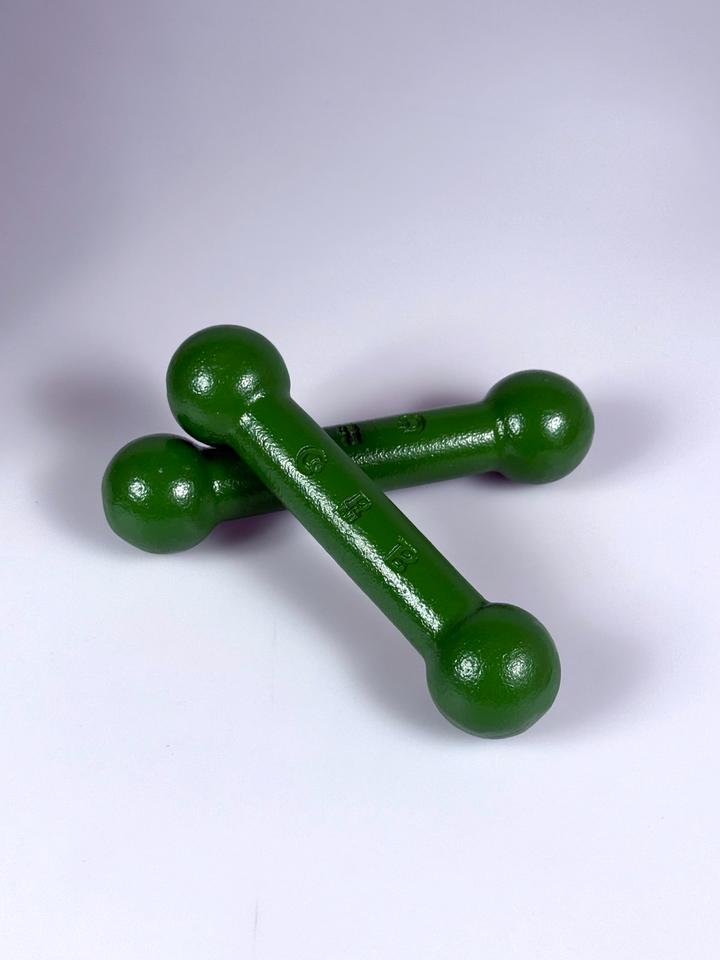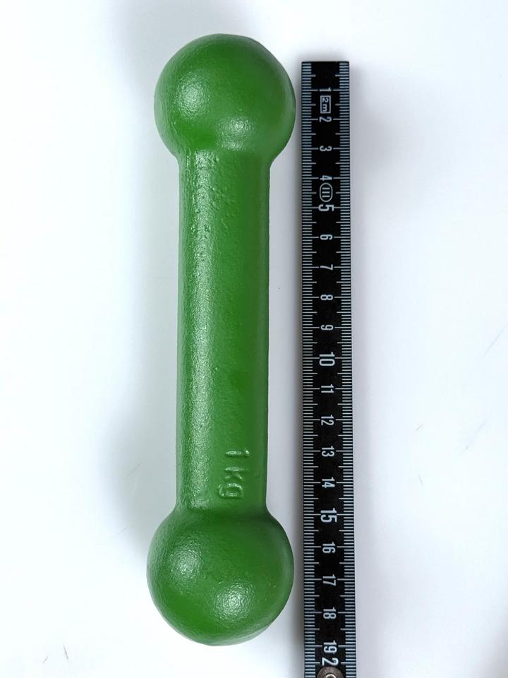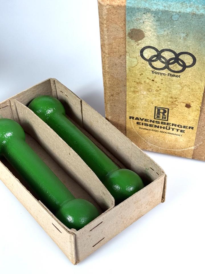 Set bestehend aus zwei Kurzhanteln à 1 kg aus grün lackiertem Eisen, Ravensbrücker Eisenwerke, Deutschland, 1960/70er Jahre.