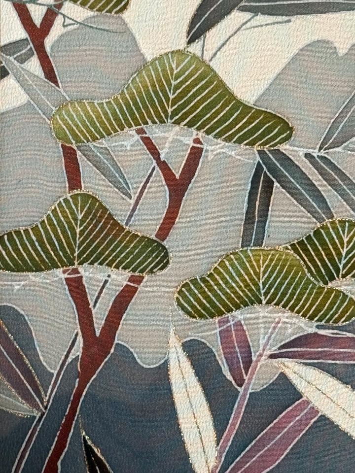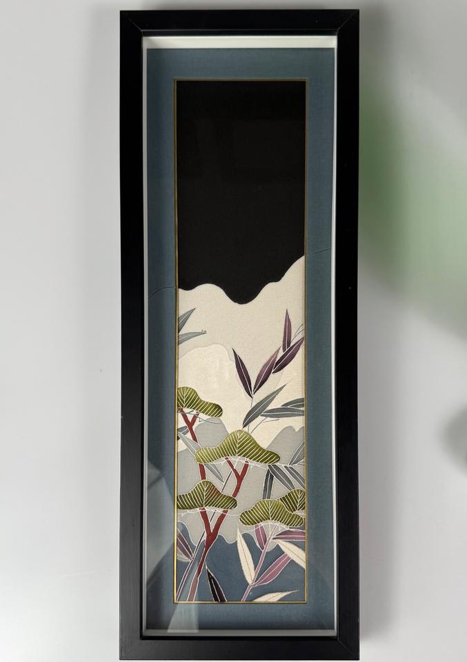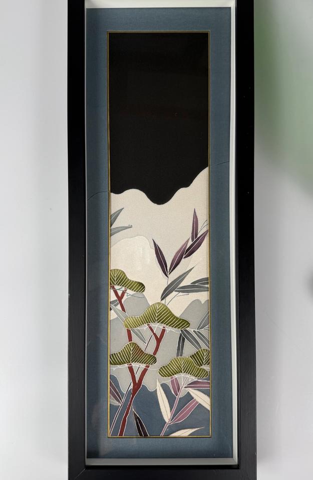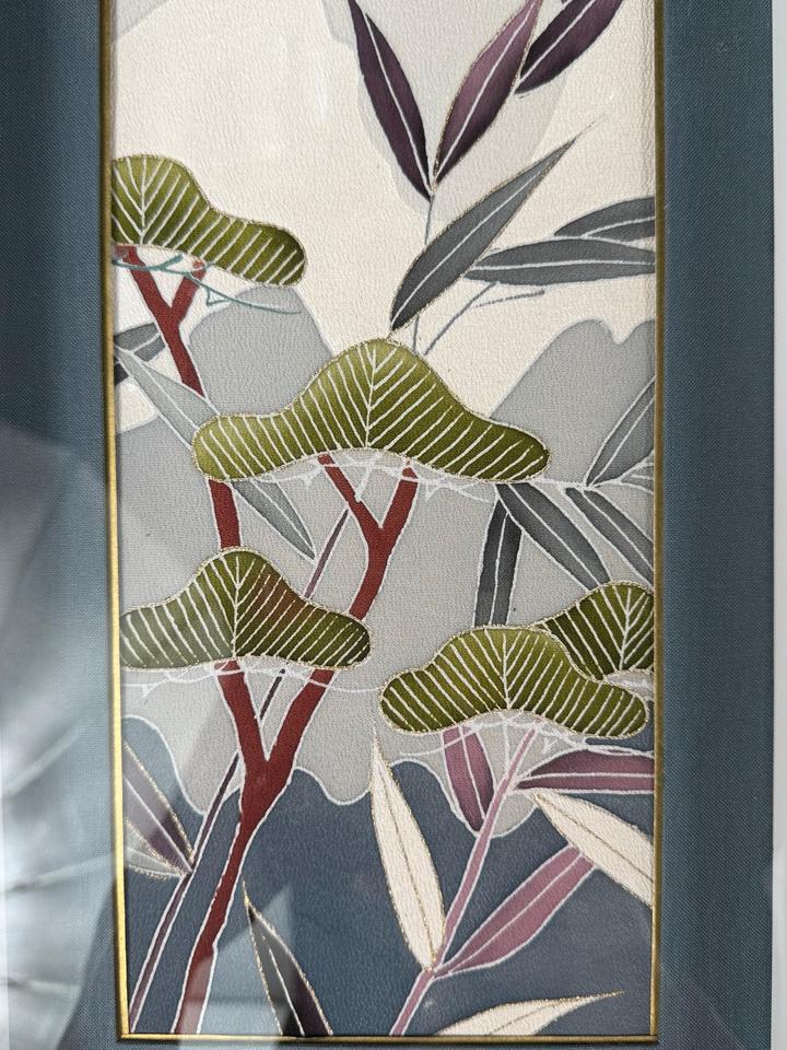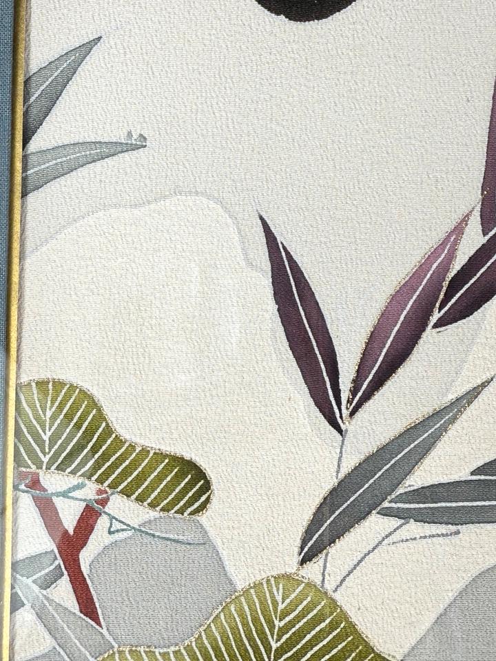 Moderne japanische Seidenmalerei, hinter Glas gerahmt, signiert, zarte Pflanzen und Gräser in wunderschöner Farbgebung, hochwertiges Textilpasspartout ( vermutlich auch Seide), Rahmen zeigt leichte Gebrauchsspuren, Zustand siehe Bilder.