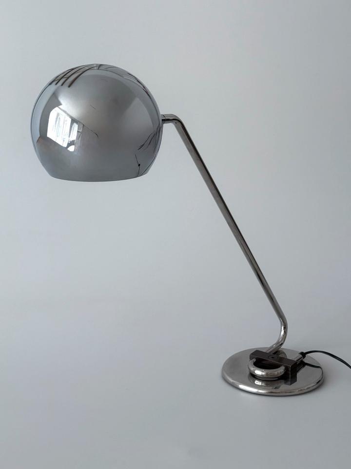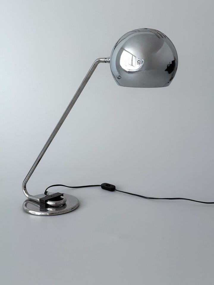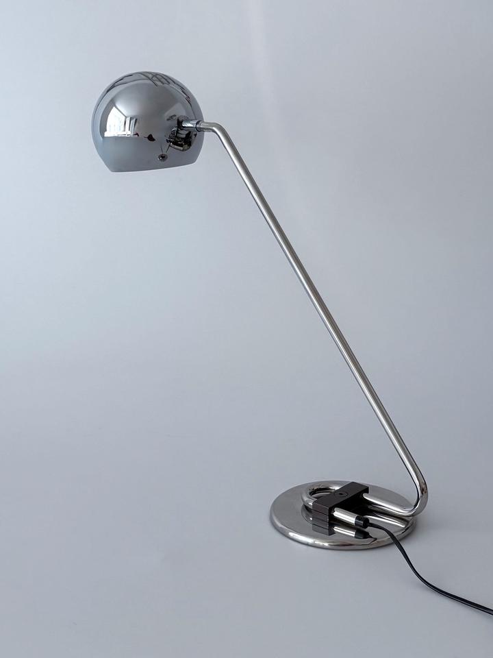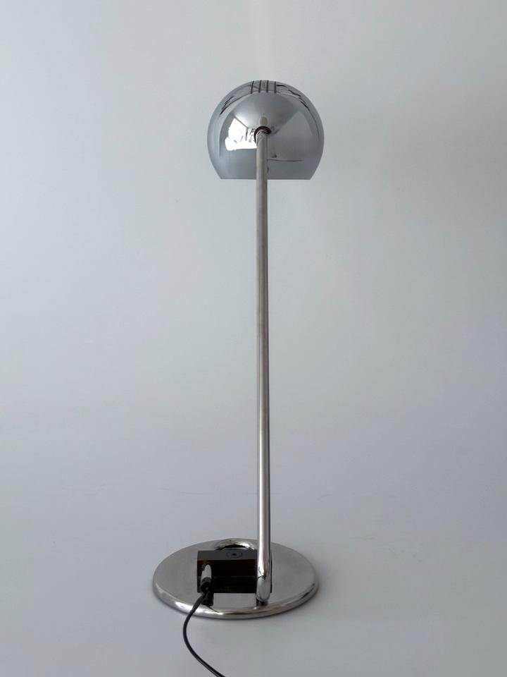 Die ikonische Schreibtischlampe mit schwenkbarem Eyeball- Kopf trägt die futuristische Formensprache und Funktionalität des modernistischen Designs der 1970er Jahre, ist hochwertig und robust gearbeitet und befindet sich in gutem Zustand mit wenigen gebrauchsbedingten Alterungsspuren, wie unscheinbaren Kratzern, hauptsächlich im Fußbereich, siehe Bilder.