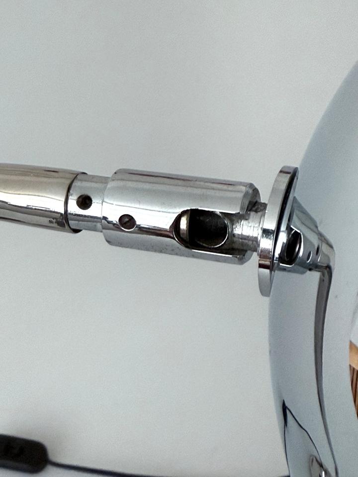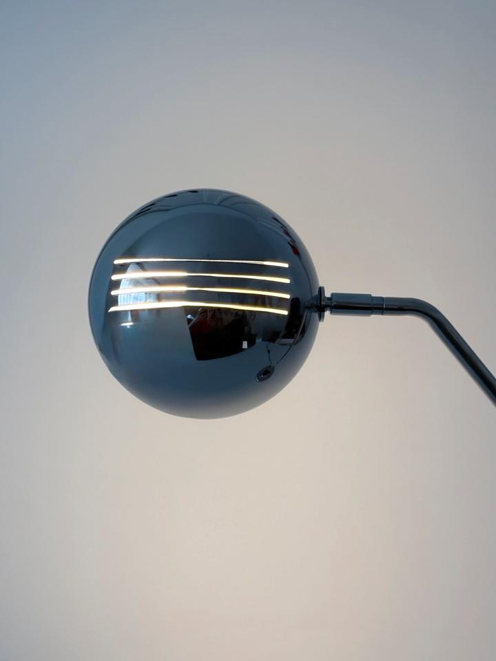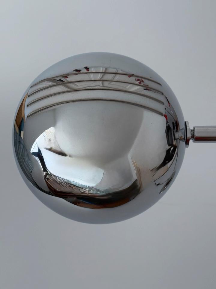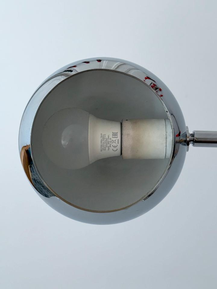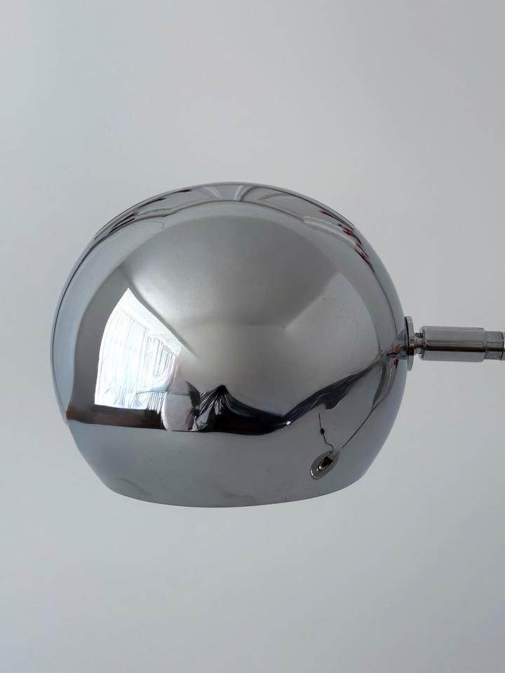 Die ikonische Schreibtischlampe mit schwenkbarem Eyeball- Kopf trägt die futuristische Formensprache und Funktionalität des modernistischen Designs der 1970er Jahre, ist hochwertig und robust gearbeitet und befindet sich in gutem Zustand mit wenigen gebrauchsbedingten Alterungsspuren, wie unscheinbaren Kratzern, hauptsächlich im Fußbereich, siehe Bilder.