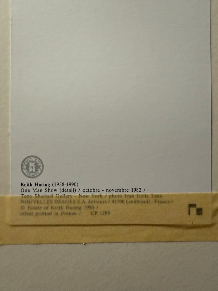 Gerahmter Offset Druck von Nouvelles Images S.A. Editeurs Frankreich, 1990, in einer nicht nummerierten limitierten Auflage mit den autorisierten lizenzierten Rechten von The Estate of Keith Haring. Er zeigt eine Arbeit von Haring aus dem Jahr 1982 mit dem Titel “ One Man Show 1982 / Tony Shafrazi Gallery New York „, copyright The Estate of Keith Haring.