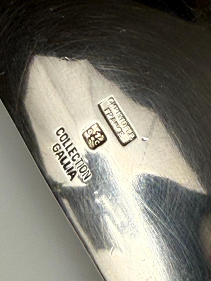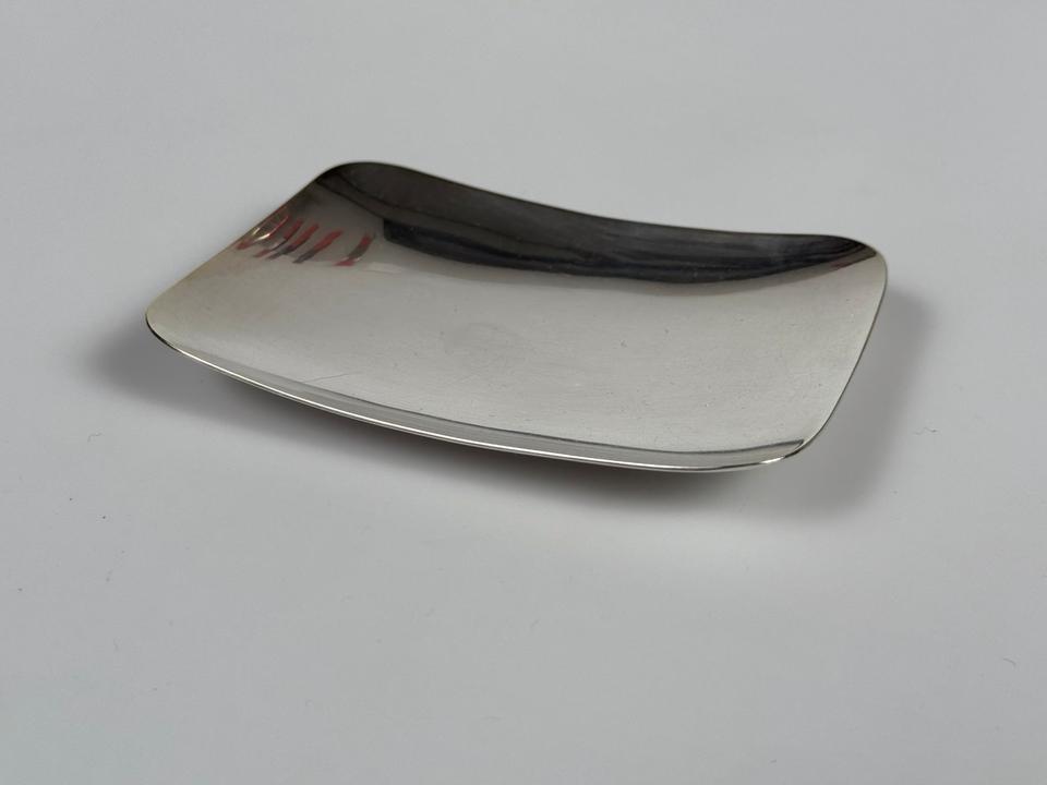 Kartenhalter oder Schmuckschale der Luxusmarke Christofle France, Collection Gallia, 1960er. Die rechteckige Schale mit abgerundeten Kanten ist hochwertig versilbert, keinerlei Abrieb zu erkennen, lediglich leichte Gebrauchsspuren in Form von minimalen Polierkratzern.