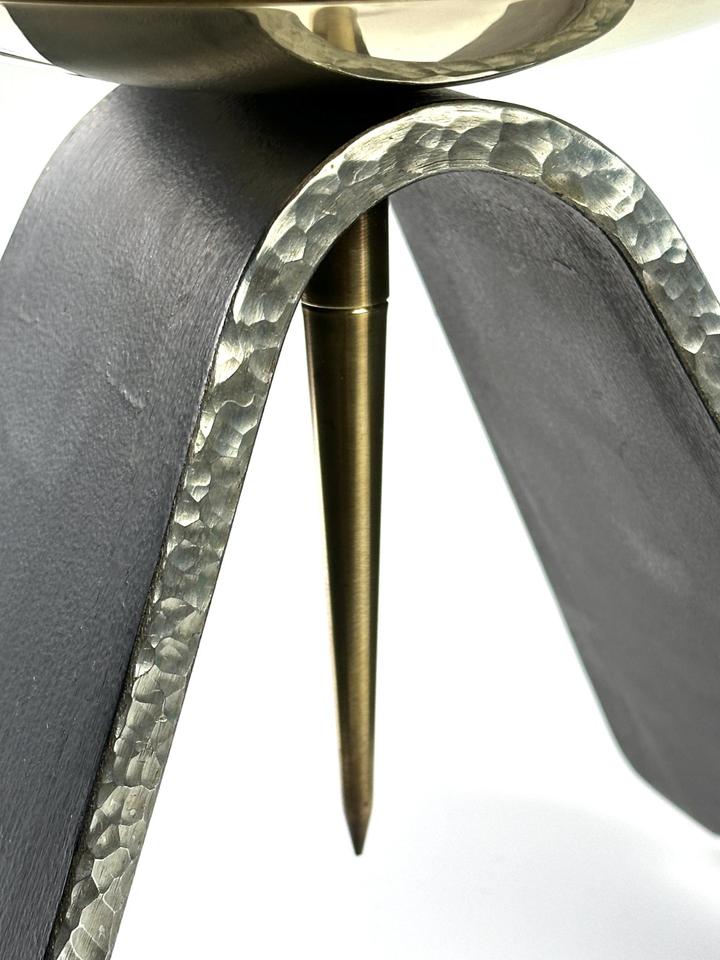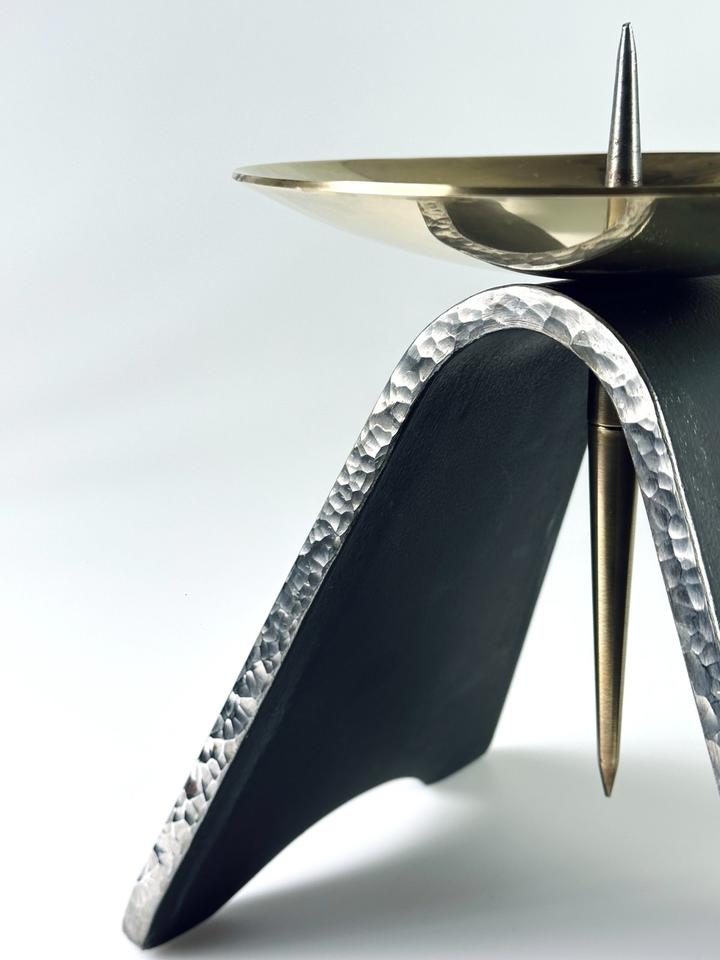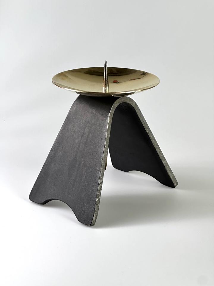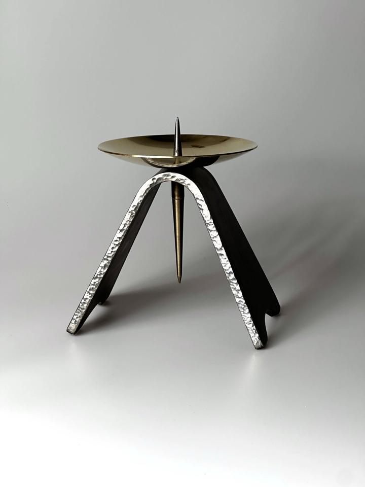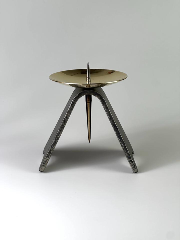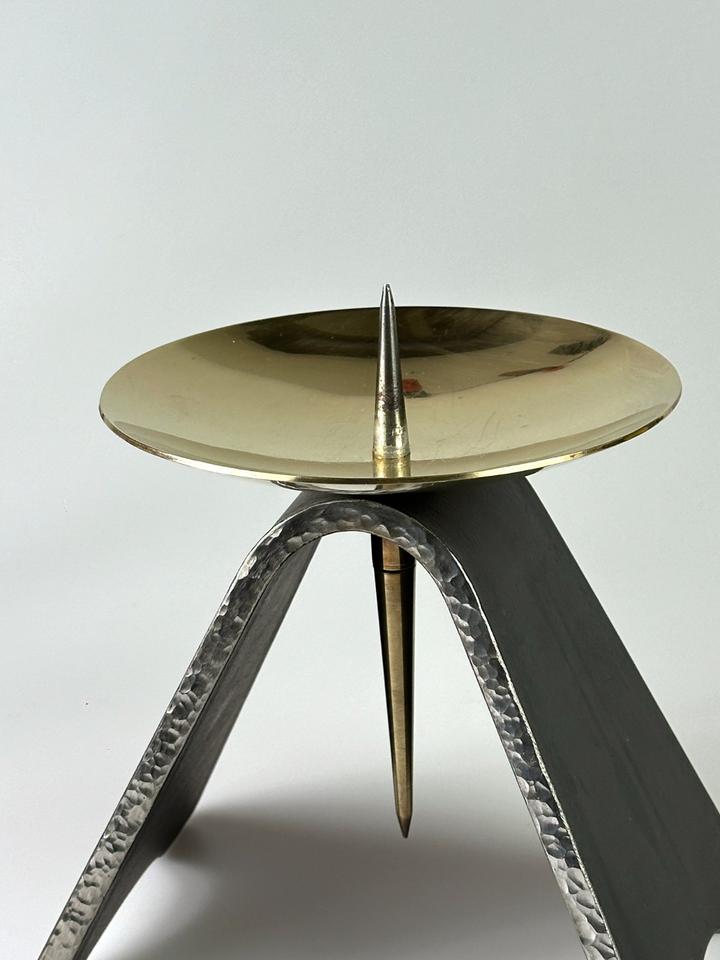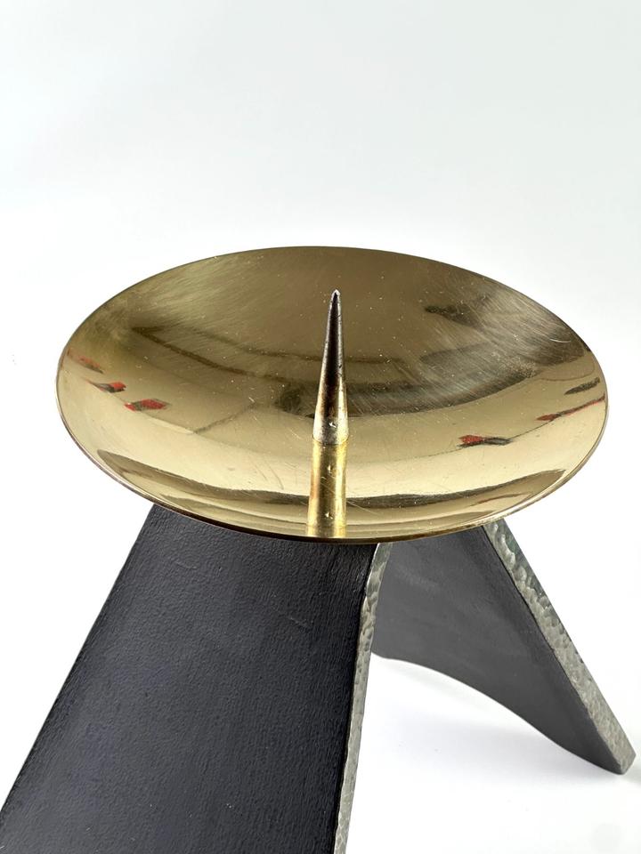 Massiver Kerzenständer aus handgeschmiedetem Eisen und Messing, DDR, 1960er. Die Basis besteht aus schwerem Eisen, welches an den Seiten, gehämmert wurde. Die goldene Tropfschale wurde aus massivem Messing gefertigt und ist mit der Basis verschraubt, kann daher unbeschwert zur Reinigung abgenommen werden. Die Kerzenständer wurden in der DDR in verschiedenen Größen gefertigt, sie kamen hauptsächlich in Kirchen zum Einsatz. Der Kerzenständer wurde gereinigt und poliert.