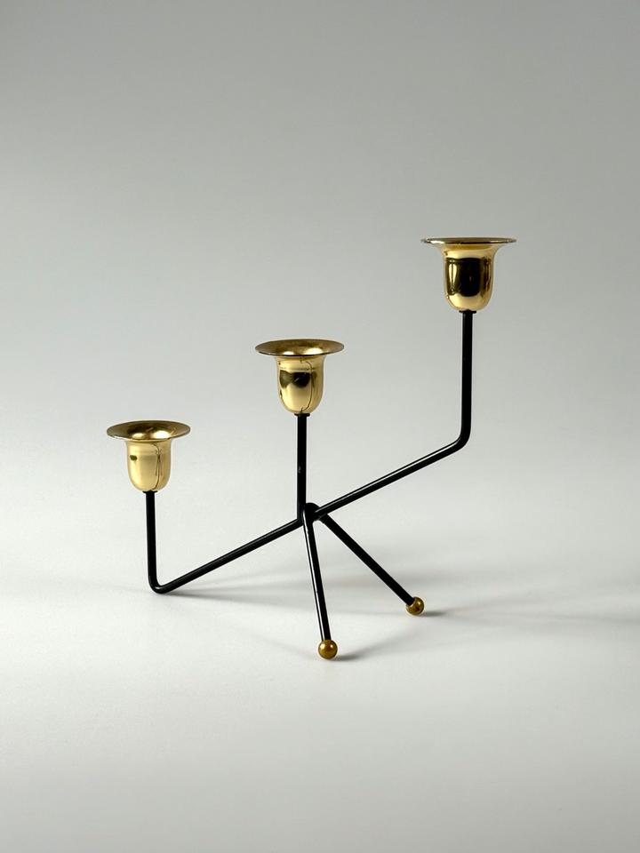 Dreiflammiger Kerzenständer aus handgeschmiedetem Eisen und Aluminium, DDR, 1960er. Die Basis besteht aus Eisen, die Tropfschalen wurden aus vergoldetem Aluminium gefertigt und sind mit der Basis verschraubt. Der Kerzenständer ist in guten Zustand mit leichten Gebrauchsspuren, ein zweiter Kerzenständer mit moderaten Gebrauchsspuren wird auf Wunsch kostenfrei mitgesendet.