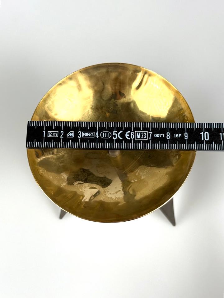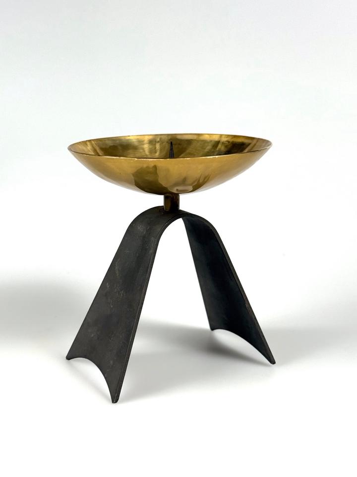 Kleiner Kerzenständer aus handgeschmiedetem Eisen und Messing, DDR, 1960er. Die Basis besteht aus Eisen, die goldene Tropfschale wurde aus massivem Messing gefertigt und ist mit der Basis verschraubt, kann daher unbeschwert zur Reinigung abgenomme…