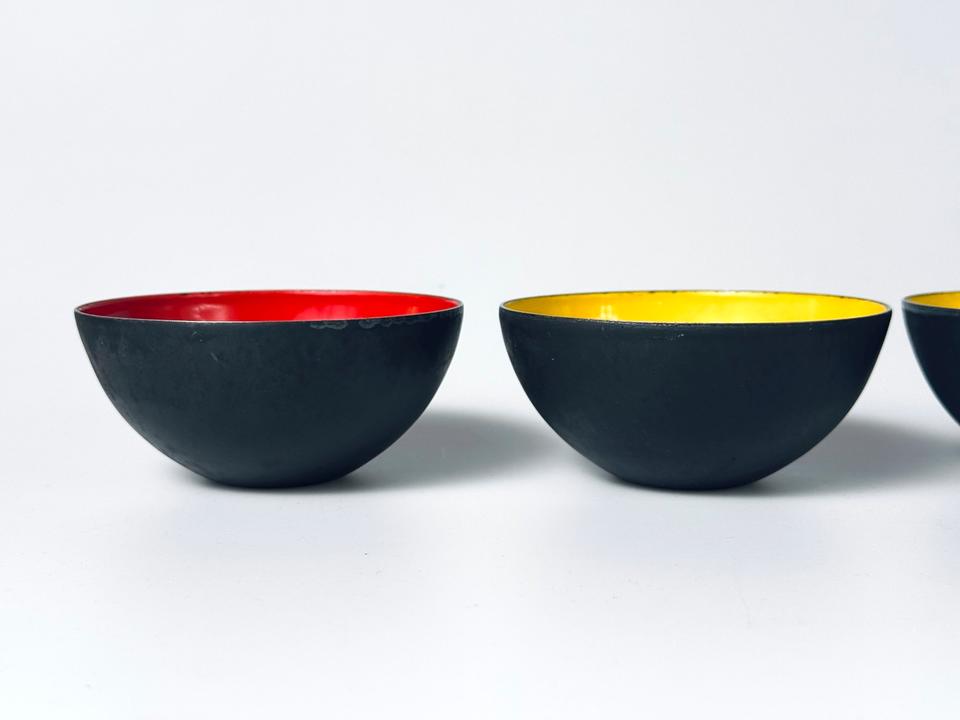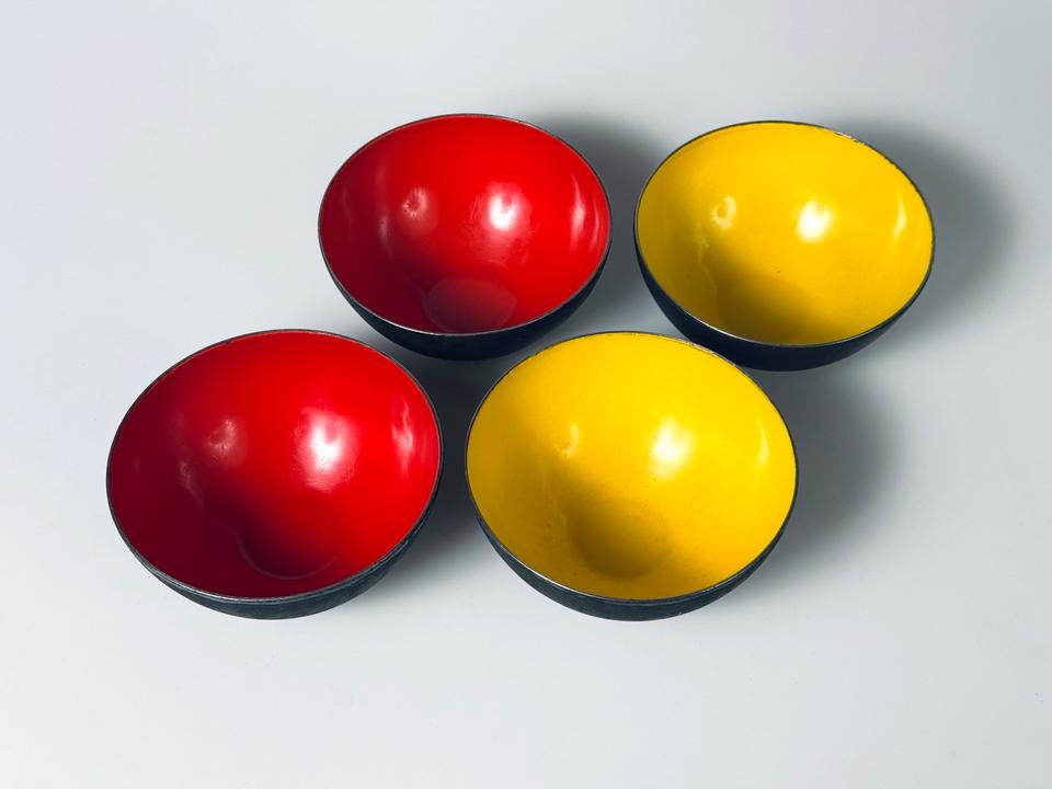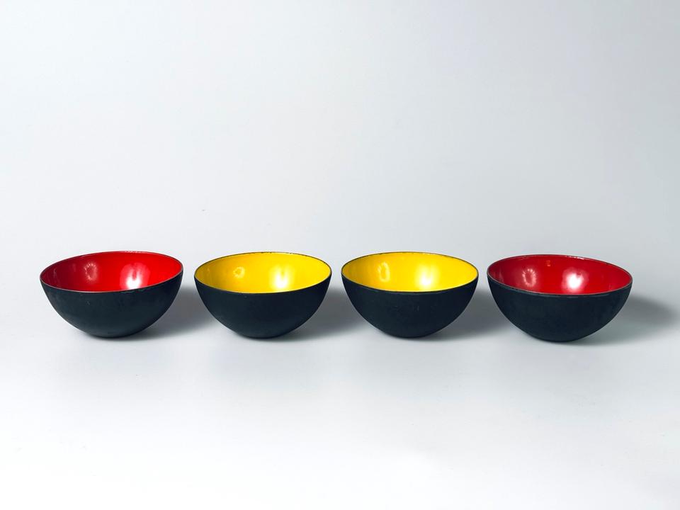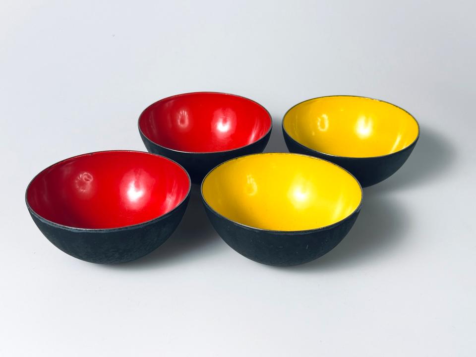 Set aus vier Krenitschalen Entwurf Herbert Krenchel für Torben Øskov, Dänemark, 1960er. Die Schalen zeigen deutliche Spuren durch Gebrauch und Alterung, eine der gelben zeigt eine größere Abplatzung des Krenits (siehe Bilder, Durchmesser ca 2 cm), desweiteren sind Schattierungen, Verfärbungen und Abstoßungen an den Rändern zu sehen. Insgesamt aber noch ein ordentlicher, gebrauchstauglicher Zustand dieses minimalistischen Designklassikers der 1950er Jahre, in eben diesen erworben.