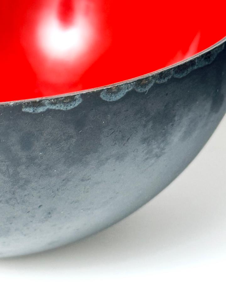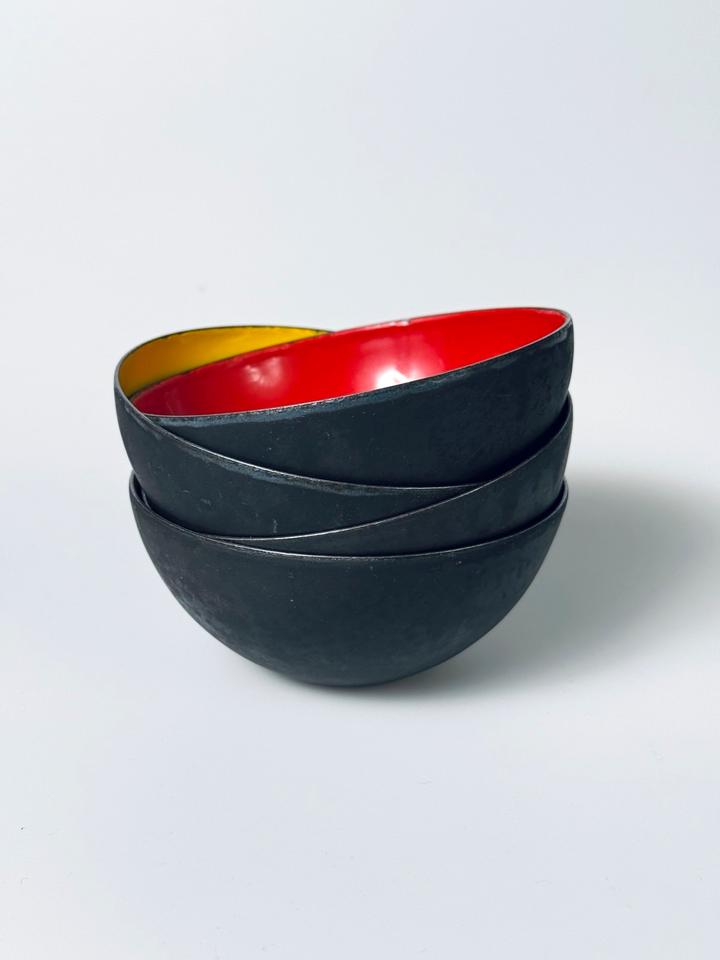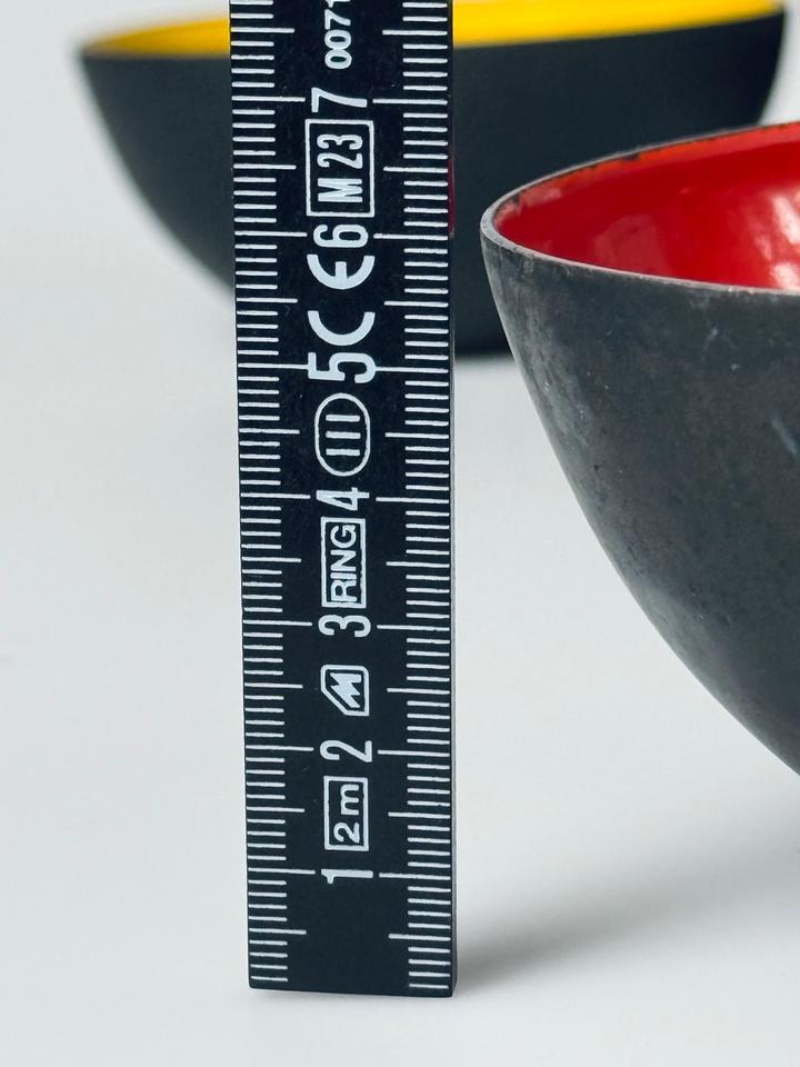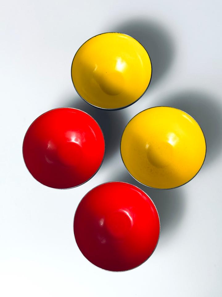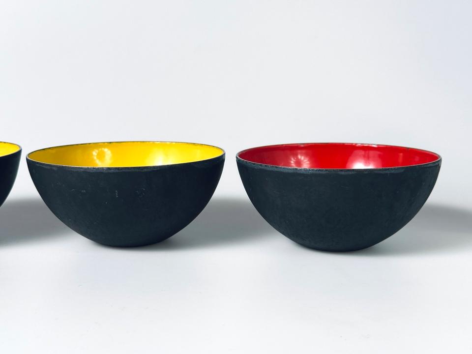 Set aus vier Krenitschalen Entwurf Herbert Krenchel für Torben Øskov, Dänemark, 1960er. Die Schalen zeigen deutliche Spuren durch Gebrauch und Alterung, eine der gelben zeigt eine größere Abplatzung des Krenits (siehe Bilder, Durchmesser ca 2 cm), desweiteren sind Schattierungen, Verfärbungen und Abstoßungen an den Rändern zu sehen. Insgesamt aber noch ein ordentlicher, gebrauchstauglicher Zustand dieses minimalistischen Designklassikers der 1950er Jahre, in eben diesen erworben.