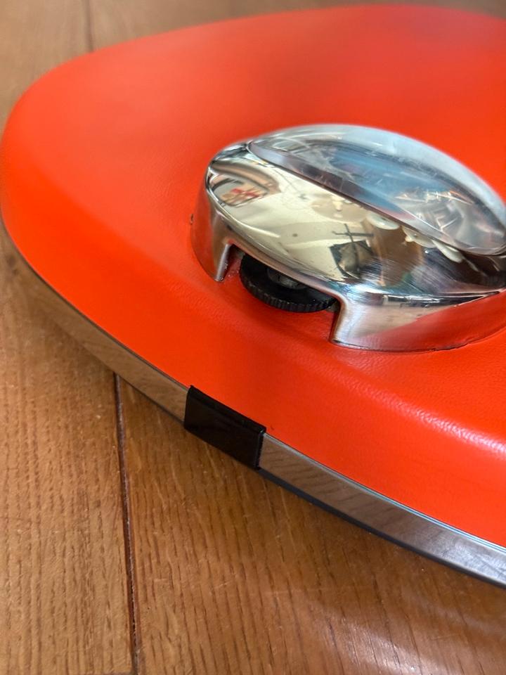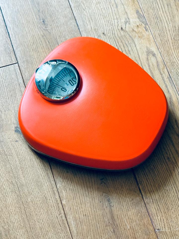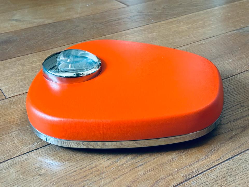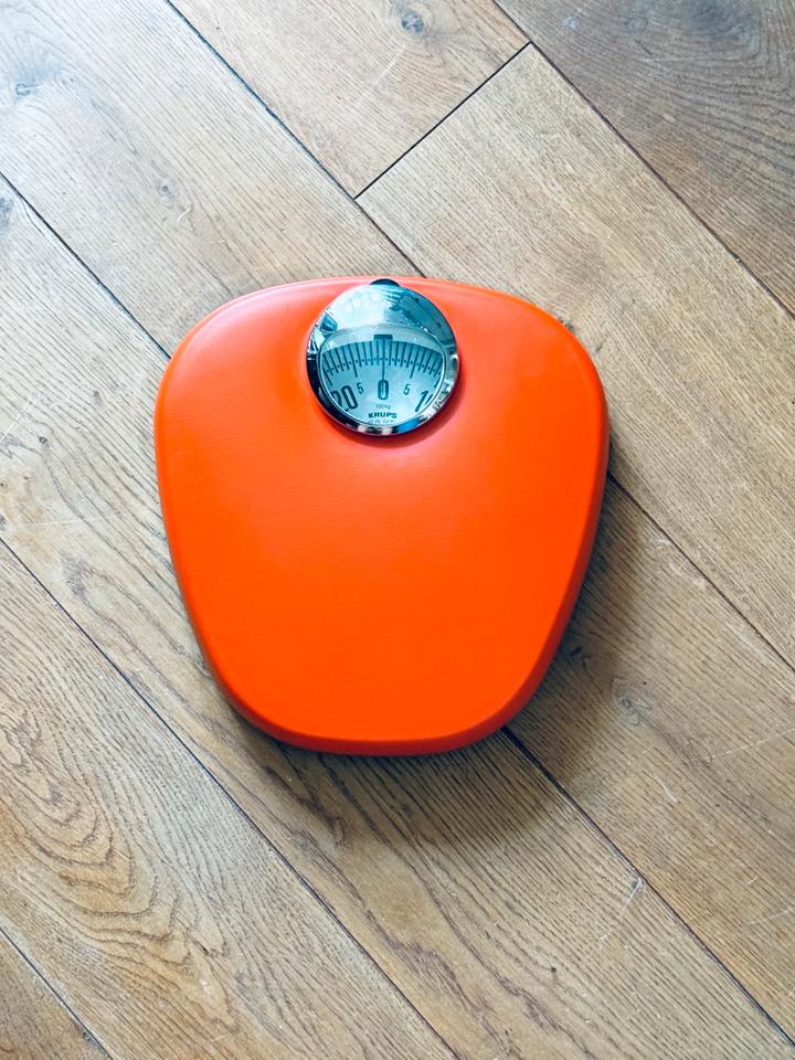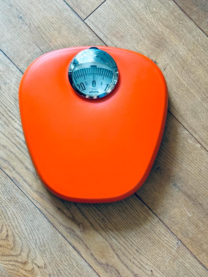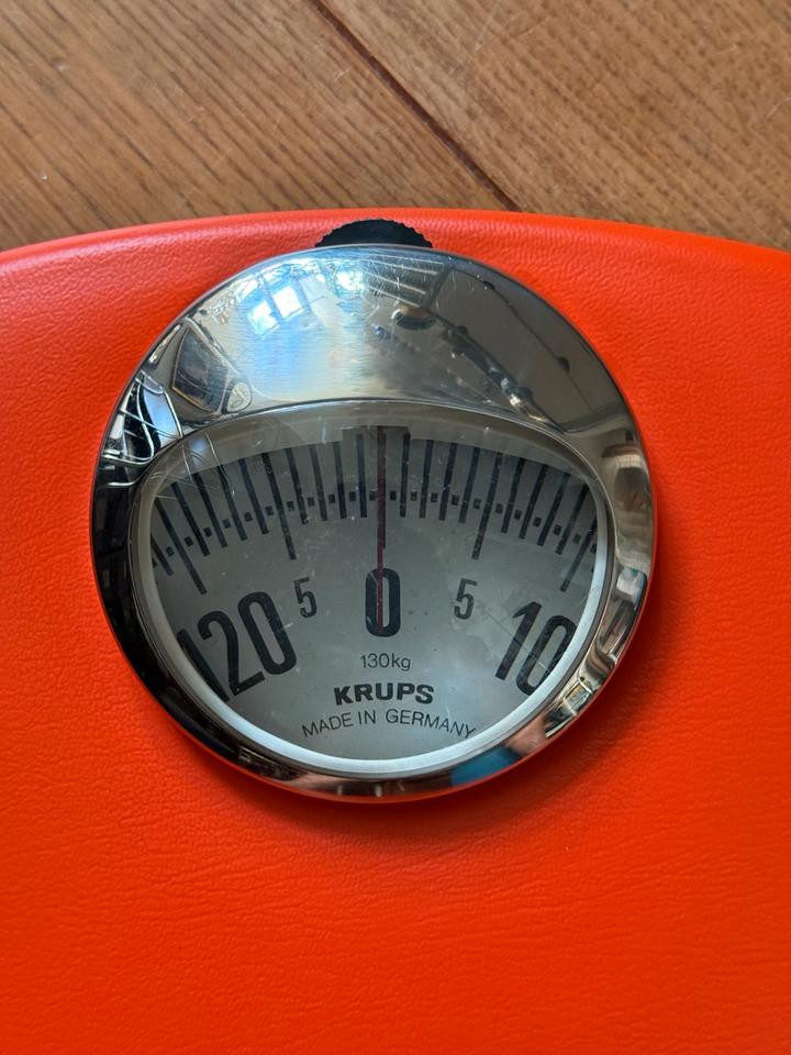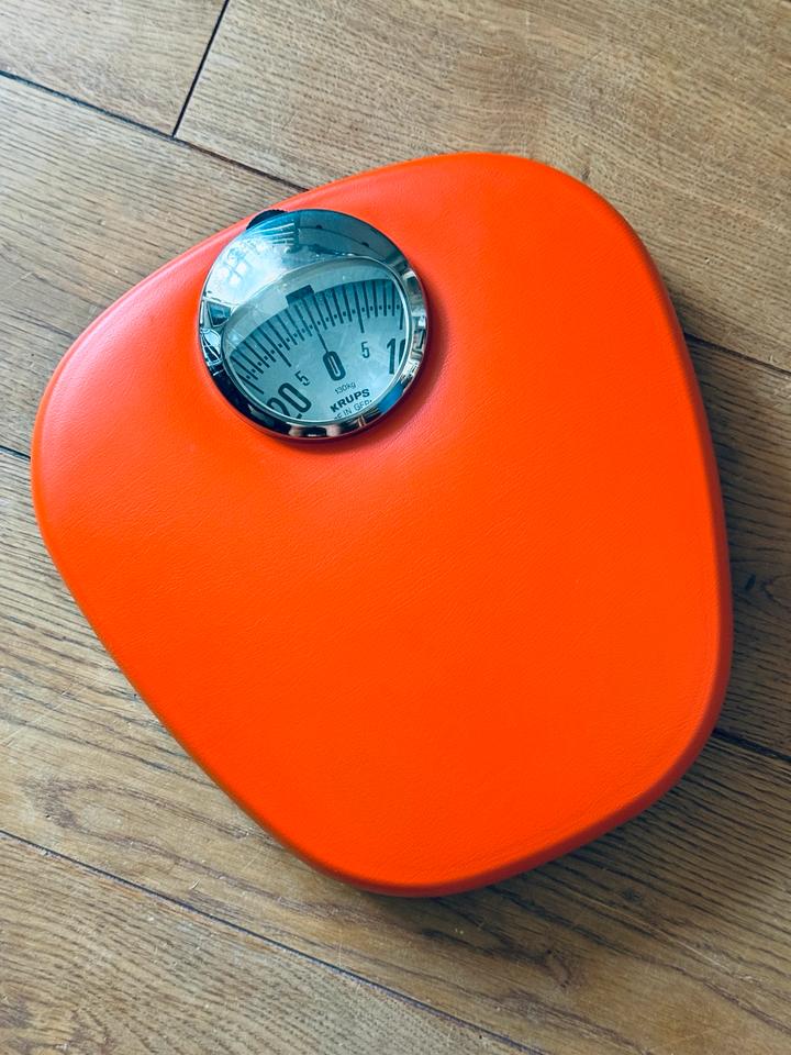 Mechanische Personenwaage von Krups, Deutschland, 1970er Jahre. Die Waage verfügt über eine rutschfeste Kunststoffauflage in knalligem Orange und ein verchromtes Sichtfenster. Sie misst bis zu 130 kg Gewicht. Zum Zwecke der Kalibrierung ist ein kleines Rädchen oberhalb des Sichtfensters vorhanden.