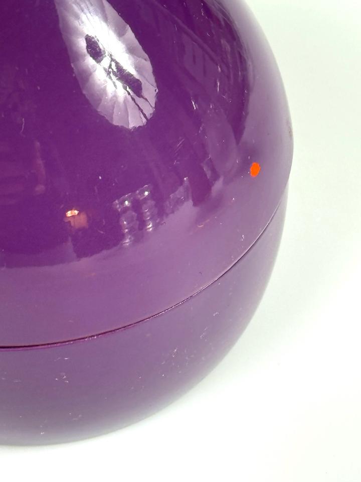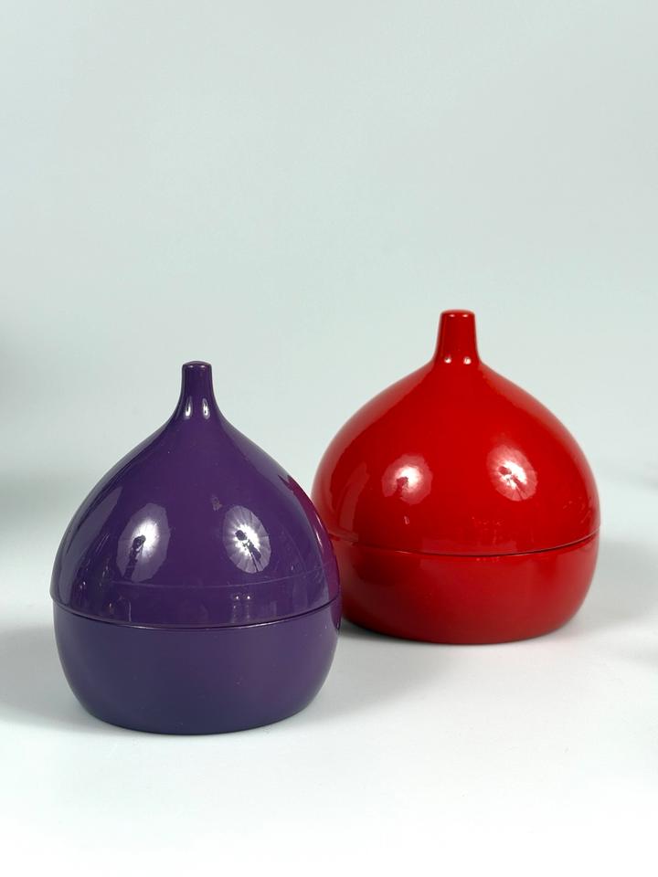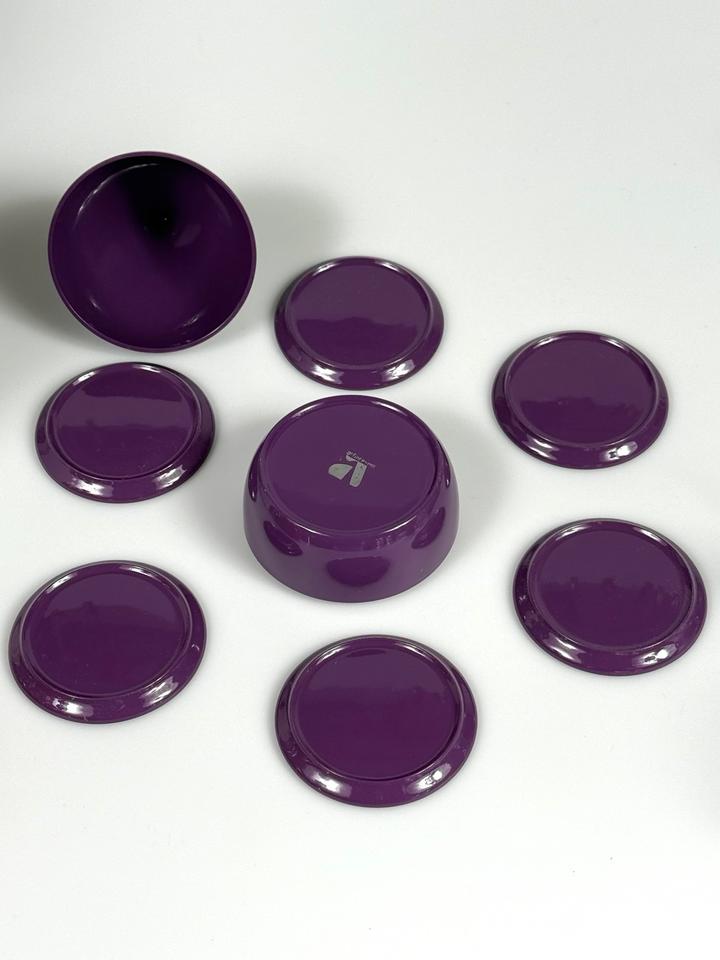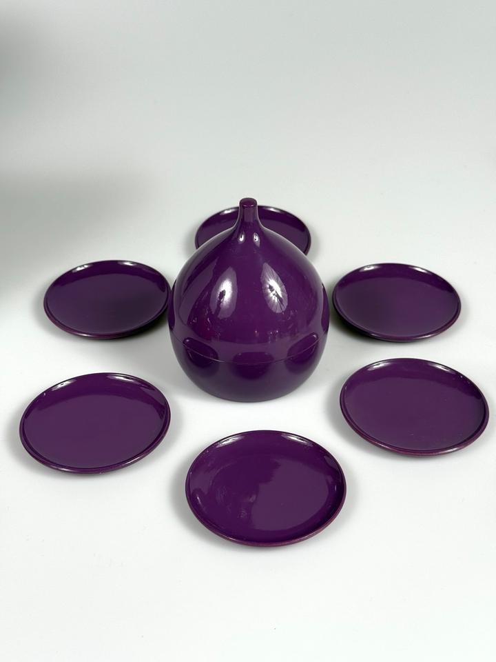 Zwiebelförmige Deckeldose mit 6 Untersetzern, Dänemark 1970er. Die Dose bzw. Kontaktschale besteht aus lackiertem Kunststoff und und weist nur geringfügige Gebrauchsspuren auf, in Form von leichten Kratzern und an zwei Stellen Lackabrieb, siehe Bilder. Sie wurde gereinigt und poliert. Die rote Dose wird in einer weiteren Anzeige angeboten.
