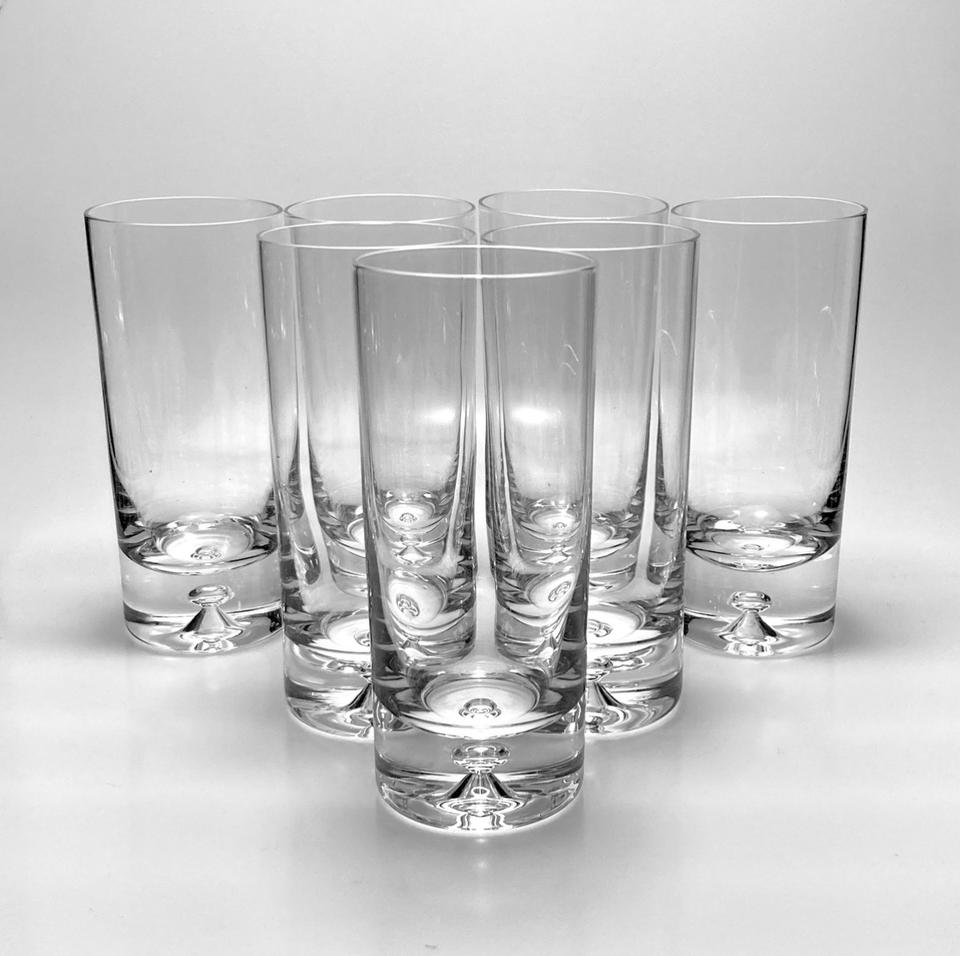 Set bestehend aus sechs Longdrinkgläsern aus Kristallglas, 1970er. Die handgefertigten Gläser mit schwerem Fuß sind mit einer Luftblase in eben jenem versehen, ein dekoratives Detail, typisch für die Zeit des Midcentury. Perfekt für sommerliche Drinks, und ohne jedwede Beschädigung, mit nur minimalen Gebrauchsspuren in Form von wenigen kleinen Kratzern, insgesamt sehr guter Zustand.
