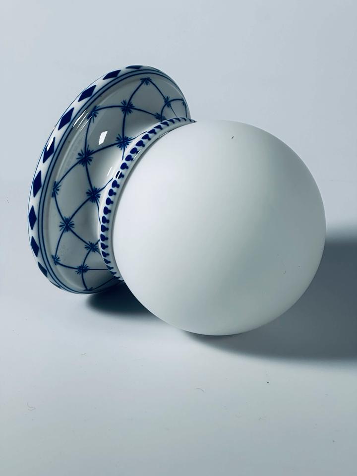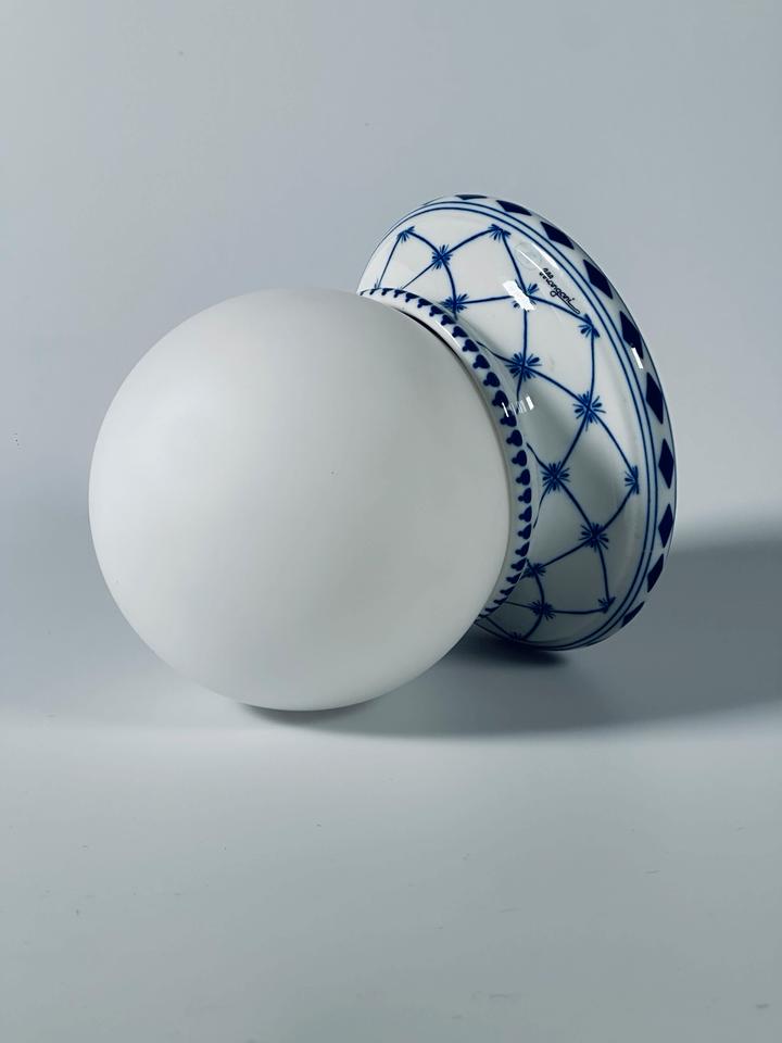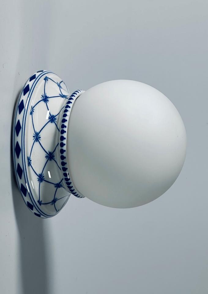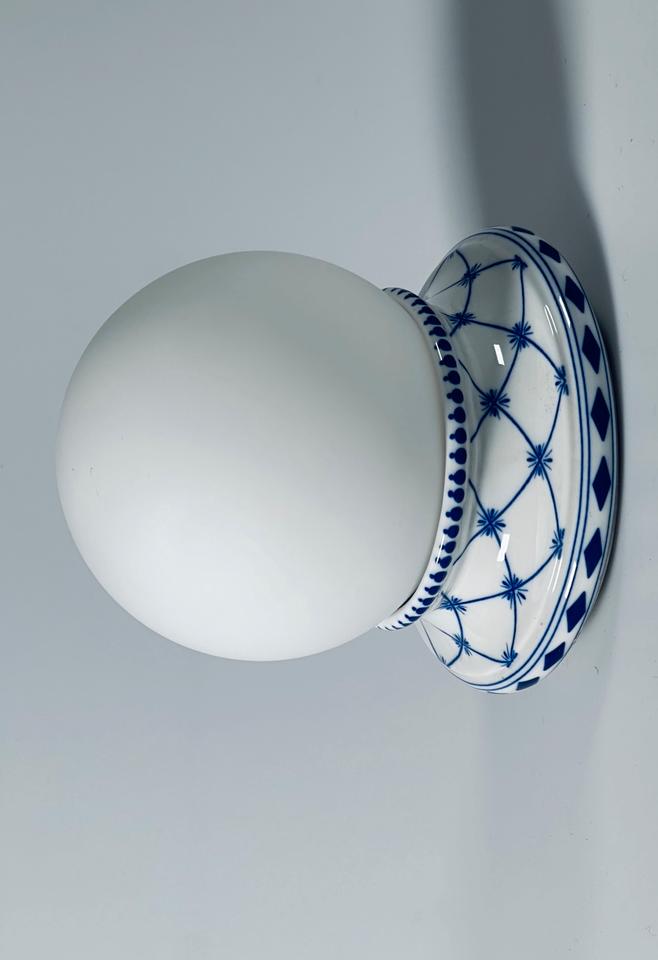 Wandleuchte aus Porzellan mit kobaltblauem Dekor und Opalglaskugel, Giulia Mangani Firenze, Italien.