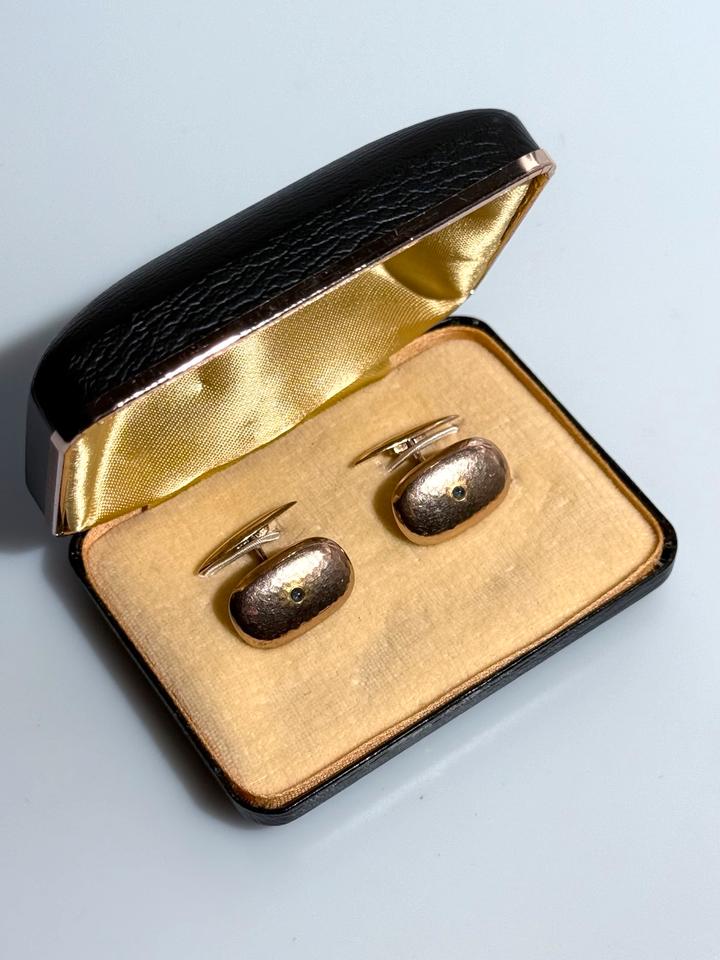 Paar Manschettenknöpfe aus 333er Gold (8 Karat) mit Steinbesatz. Die Manschettenknöpfe können stilistisch der Mitte des 20. Jahrhunderts (ca. 1920–1950) zugeordnet werden.