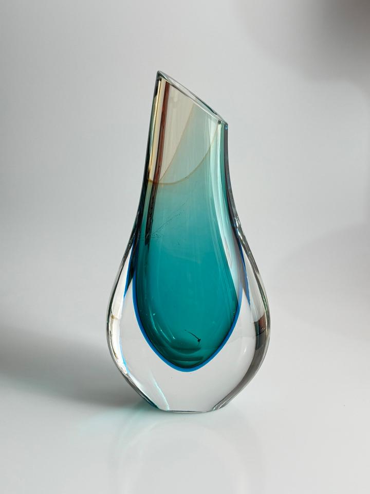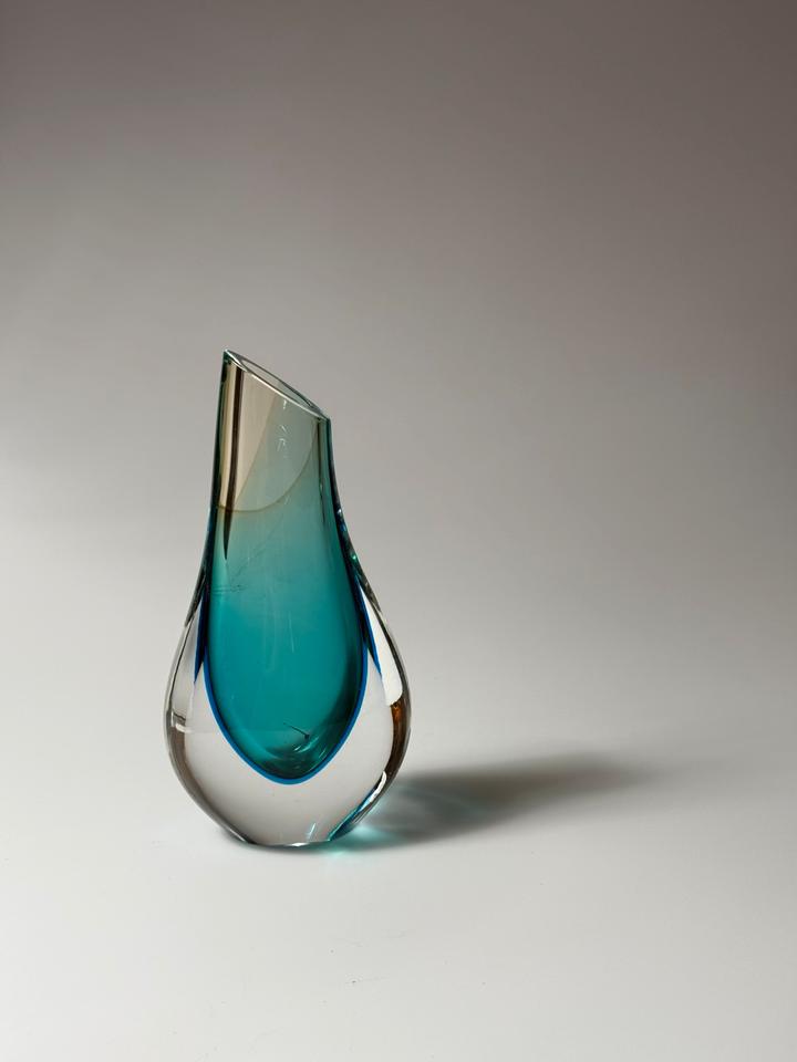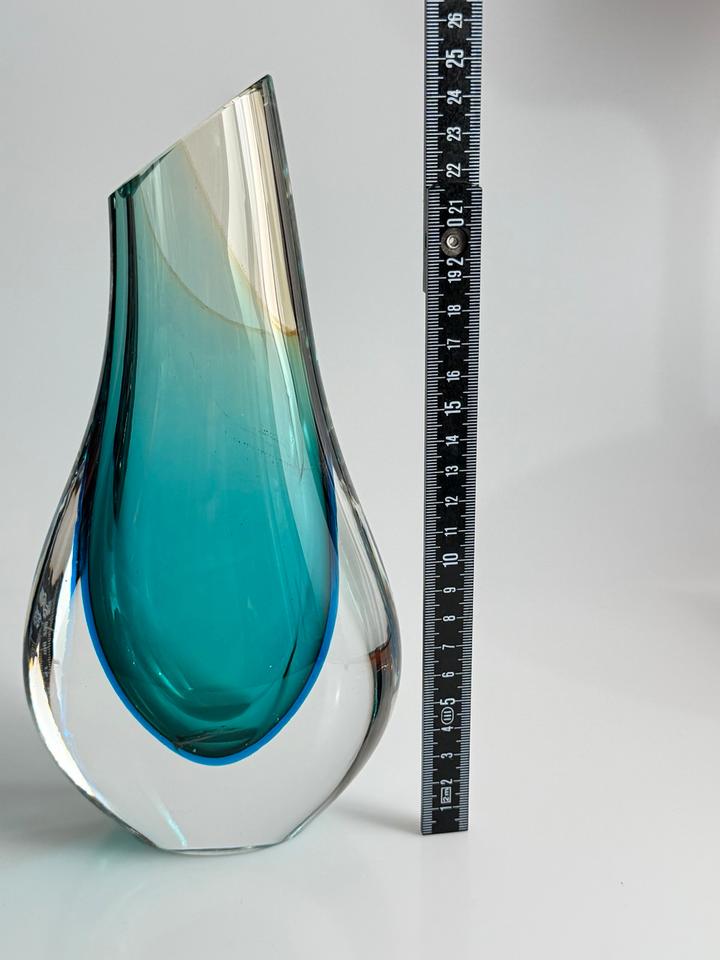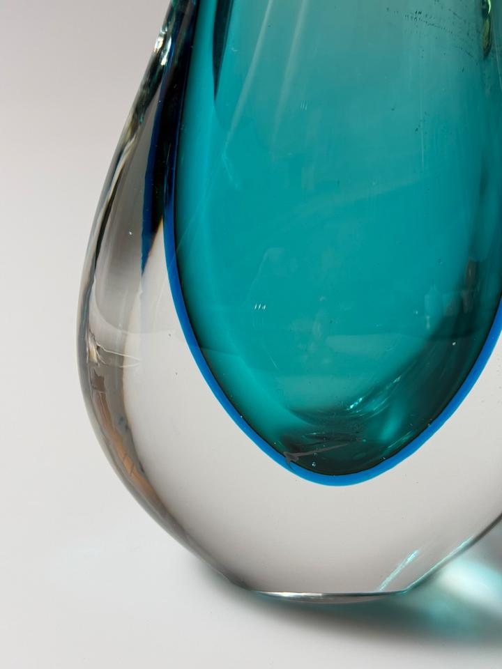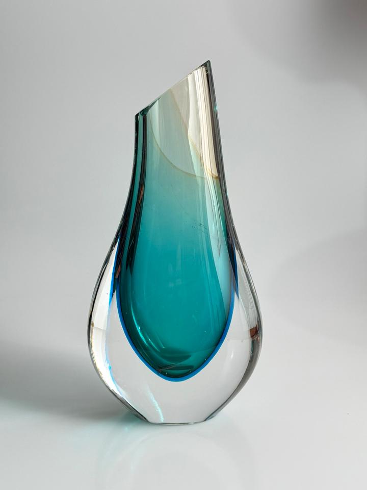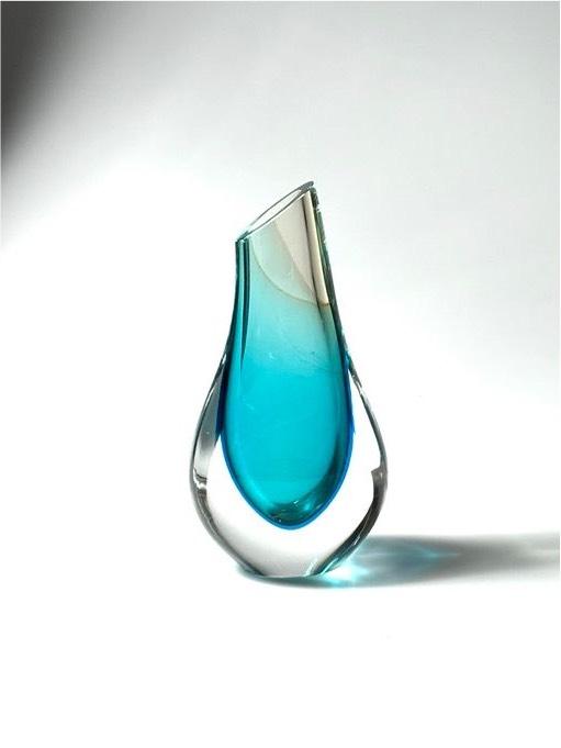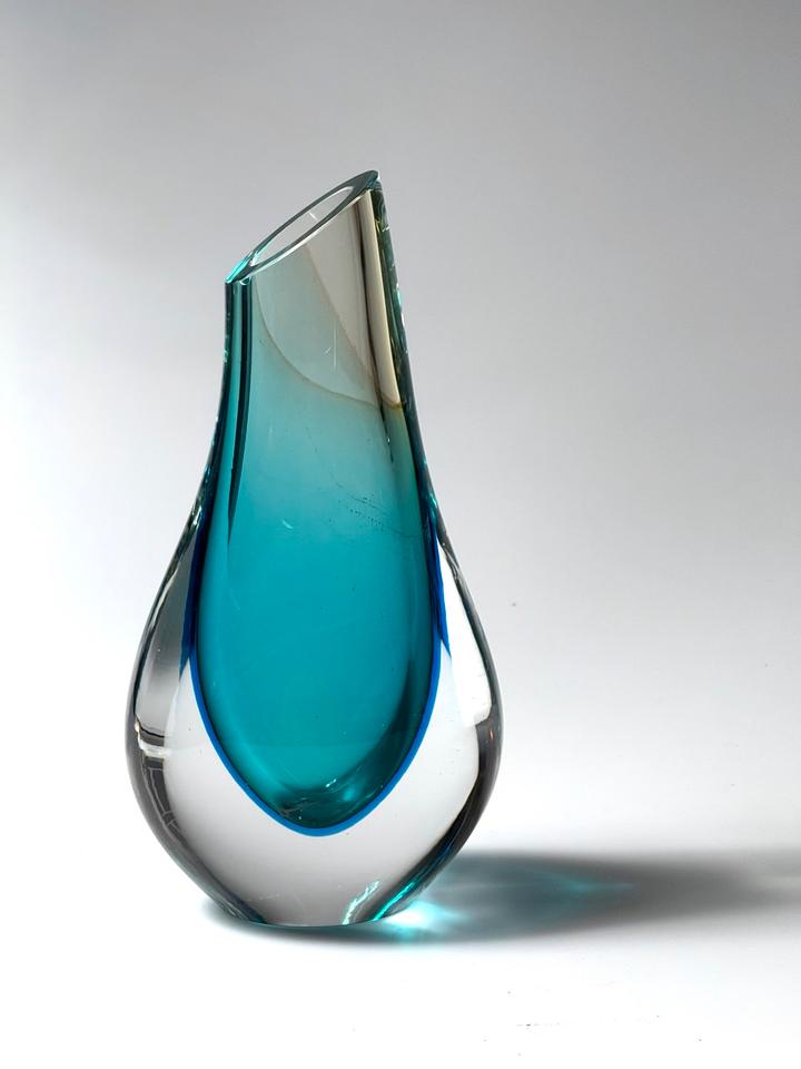 Die türkise Vase in Tränenform wurde in der Sommersotechnik hergestellt und ist mit und ohne Blumen ein dekorativer Eyecatcher und ein lichtreflektierendes Dekorationsobjekt.