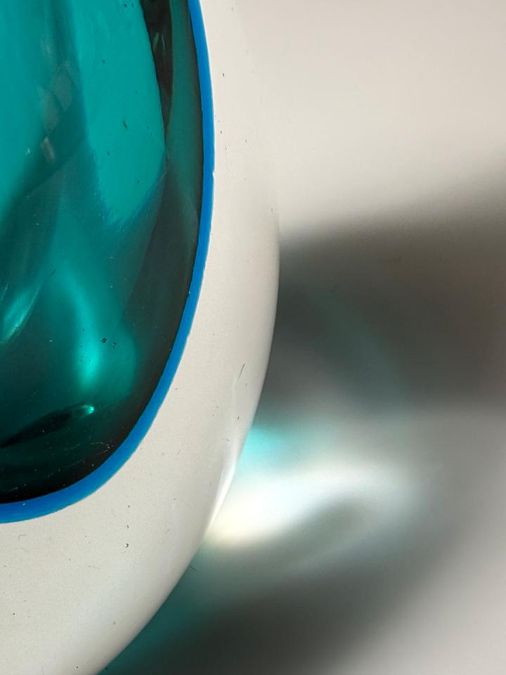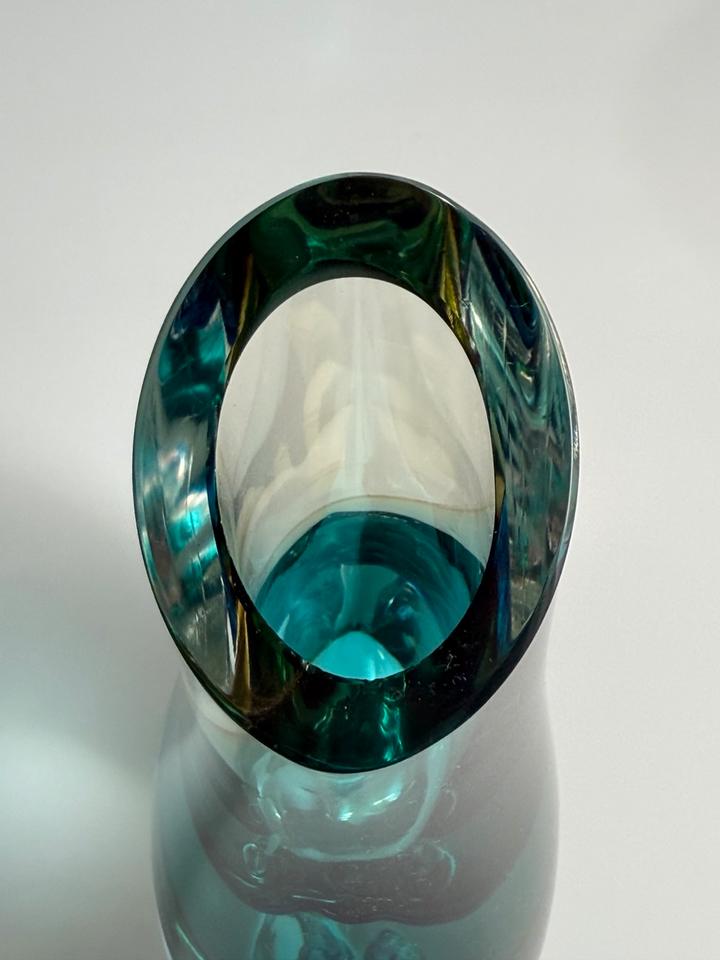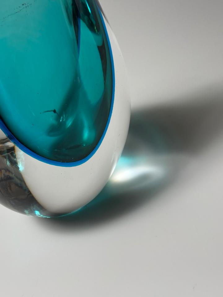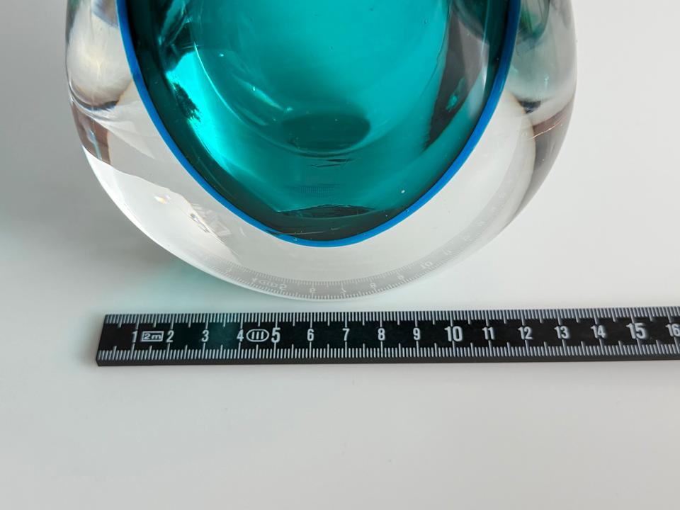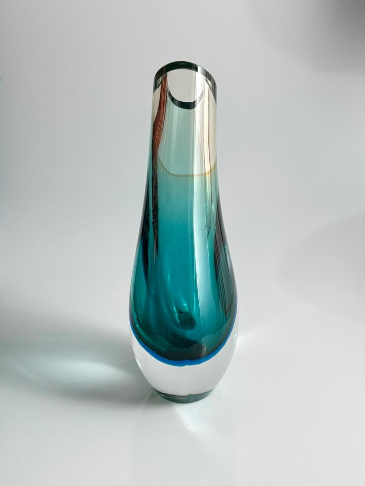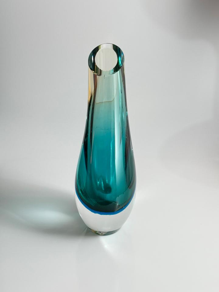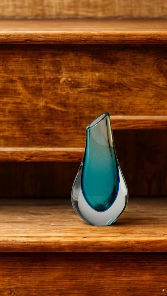 Die türkise Vase in Tränenform wurde in der Sommersotechnik hergestellt und ist mit und ohne Blumen ein dekorativer Eyecatcher und ein lichtreflektierendes Dekorationsobjekt.