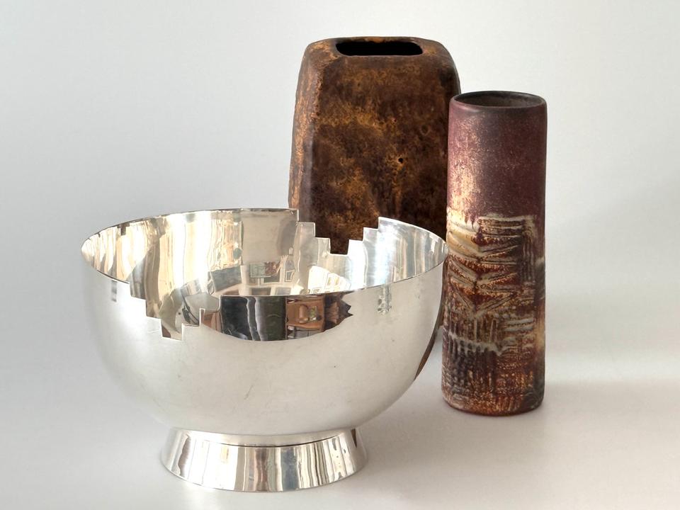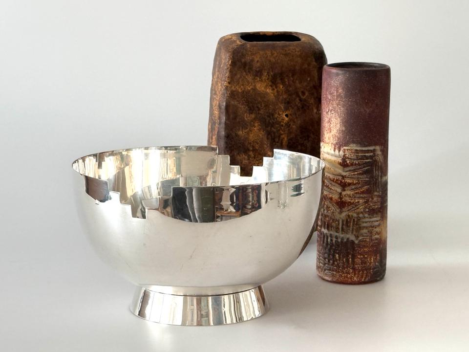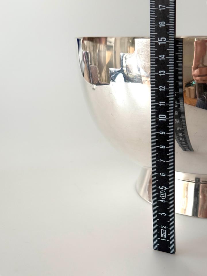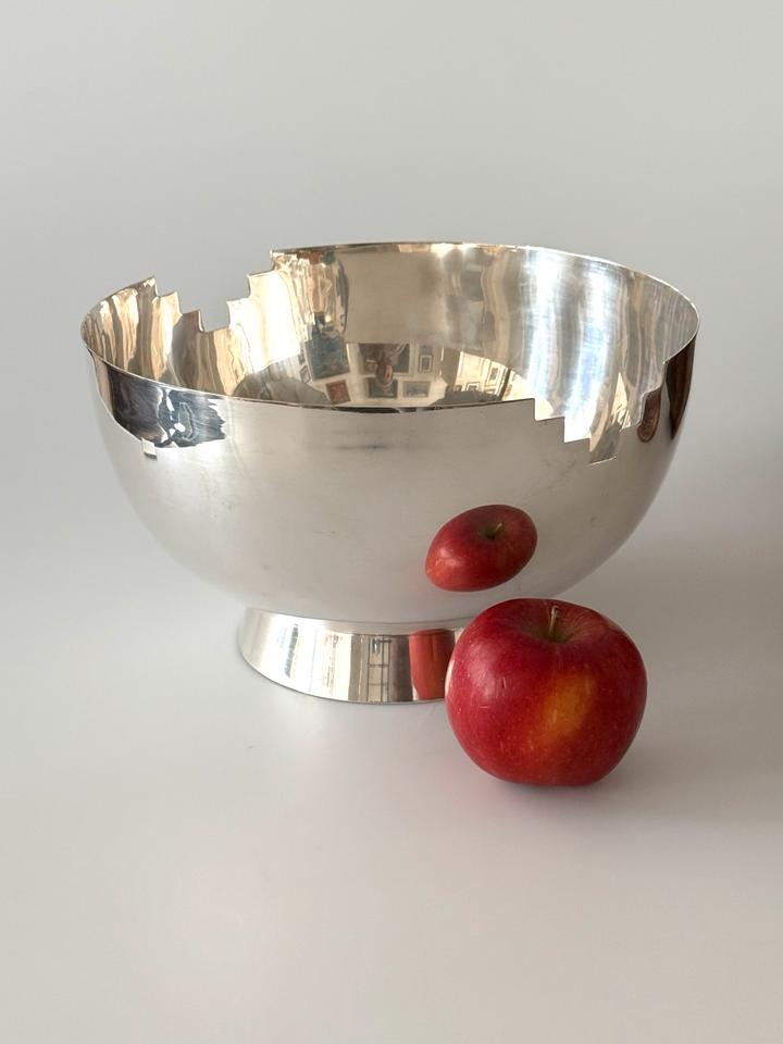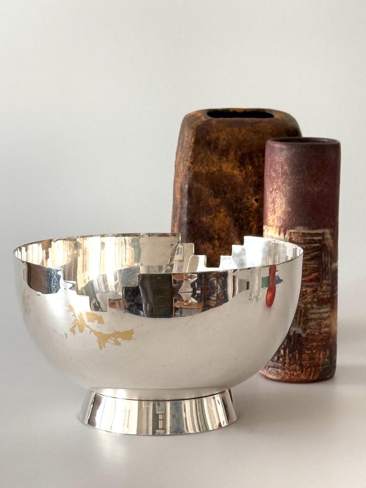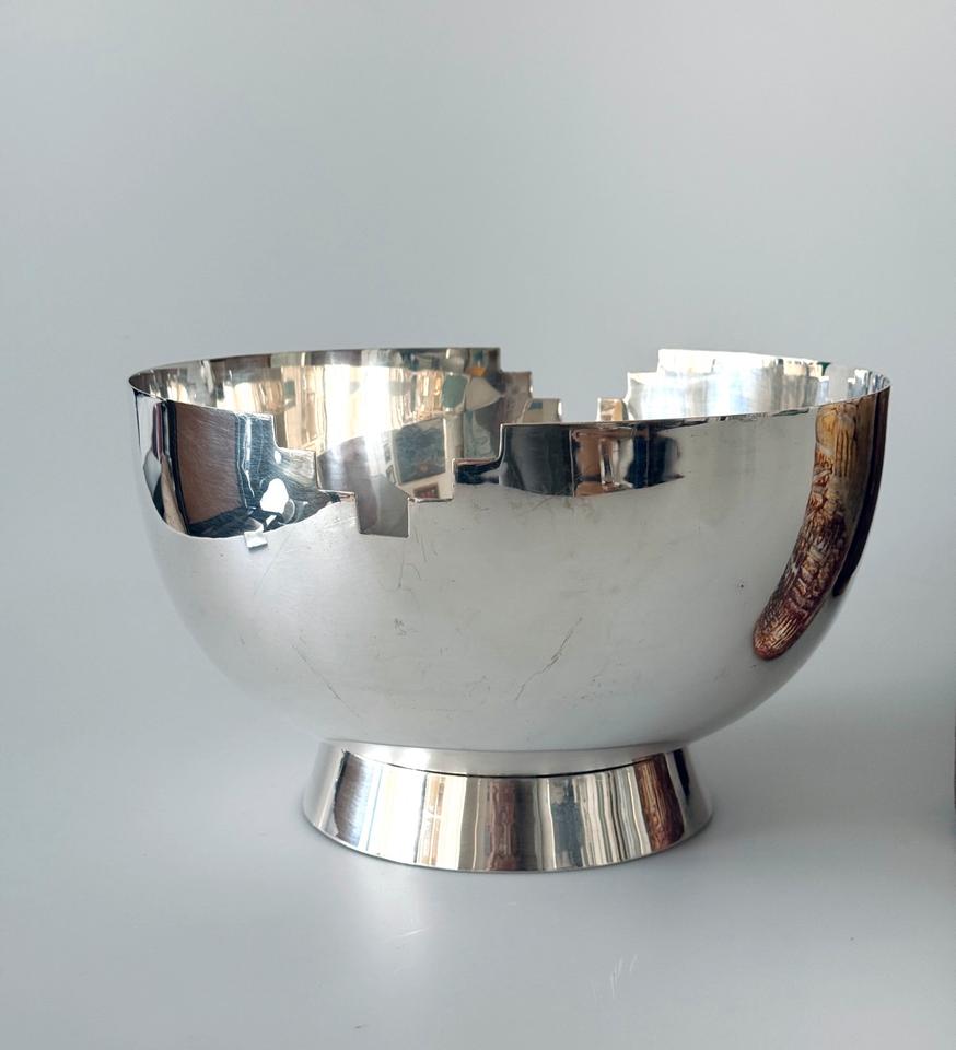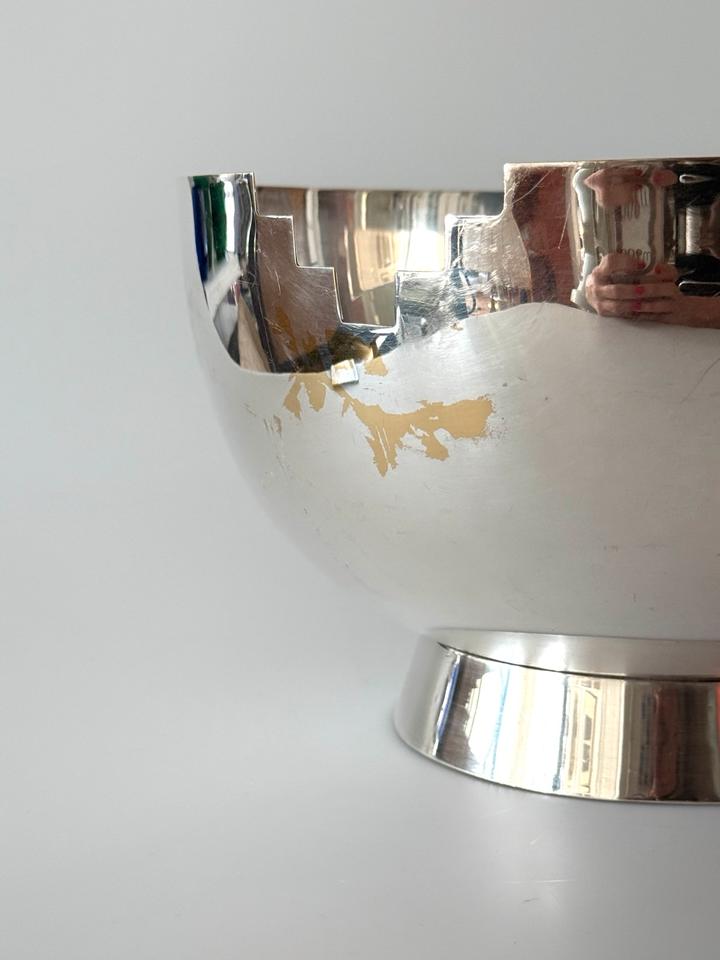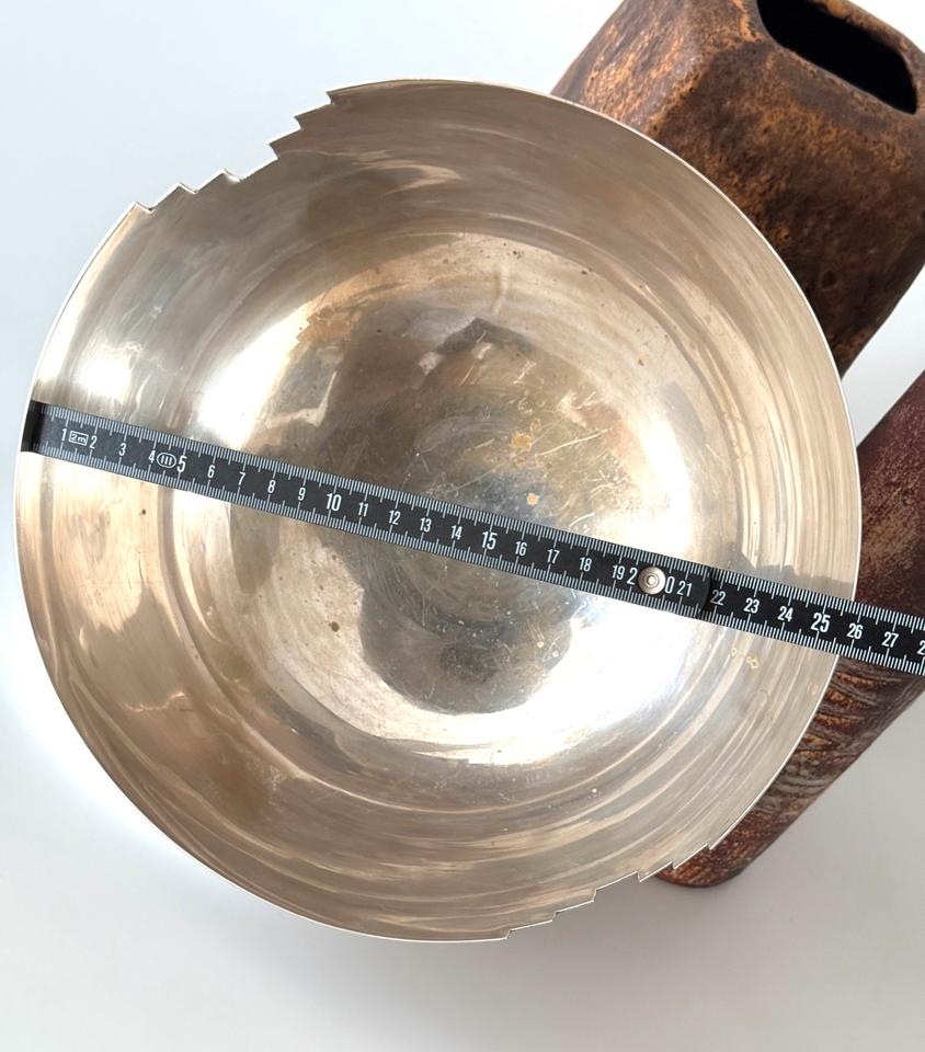 Die Schüssel zeigt am Rand zwei gegenüberliegende treppenartige Aussparungen im Stil des Artdeco.