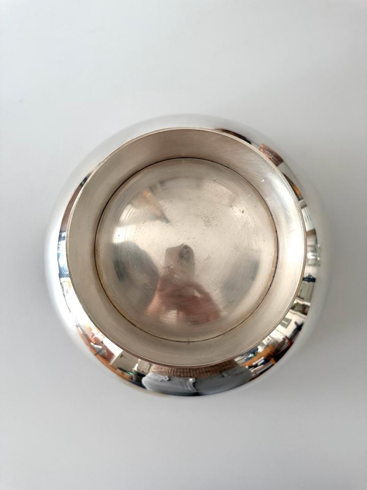Sie besteht aus versilbertem Messing. Der Zustand ist gut, sie hat keinerlei Dellen, zeigt jedoch partiell Abrieb und Oxidationsspuren besonders im Inneren, was dem Charmedes ungewöhnlichen Stücks jedoch eher zuträglich ist.