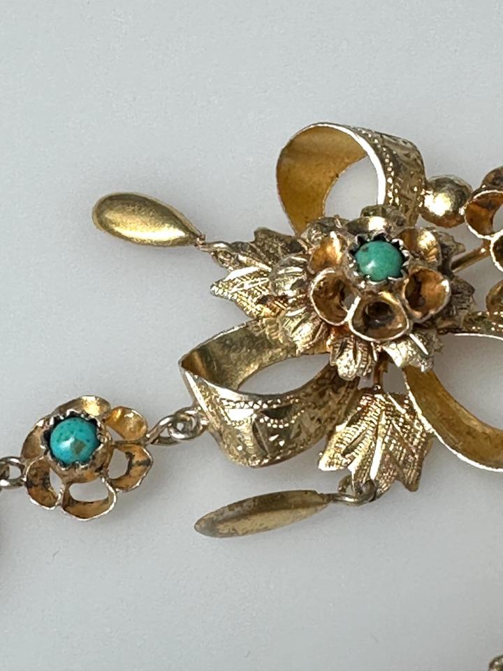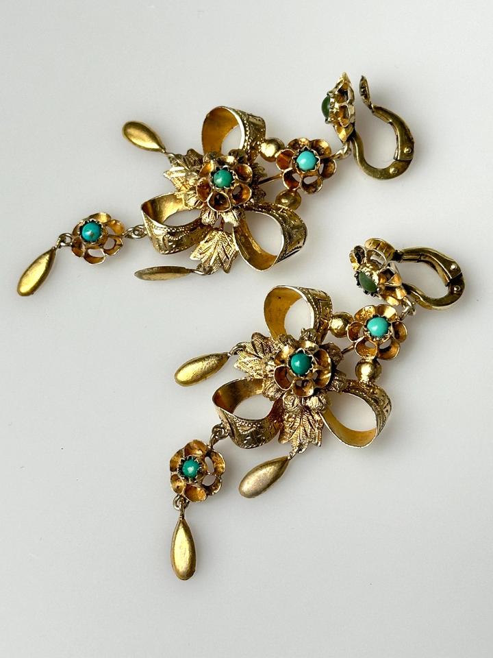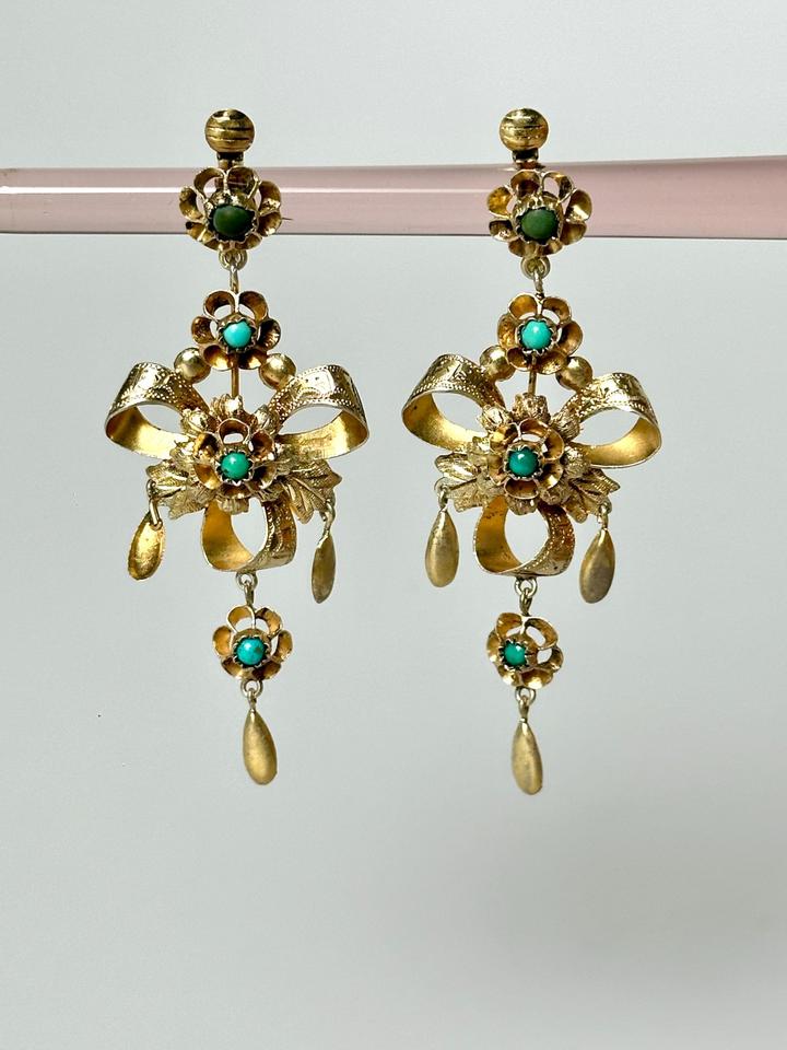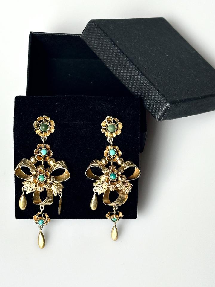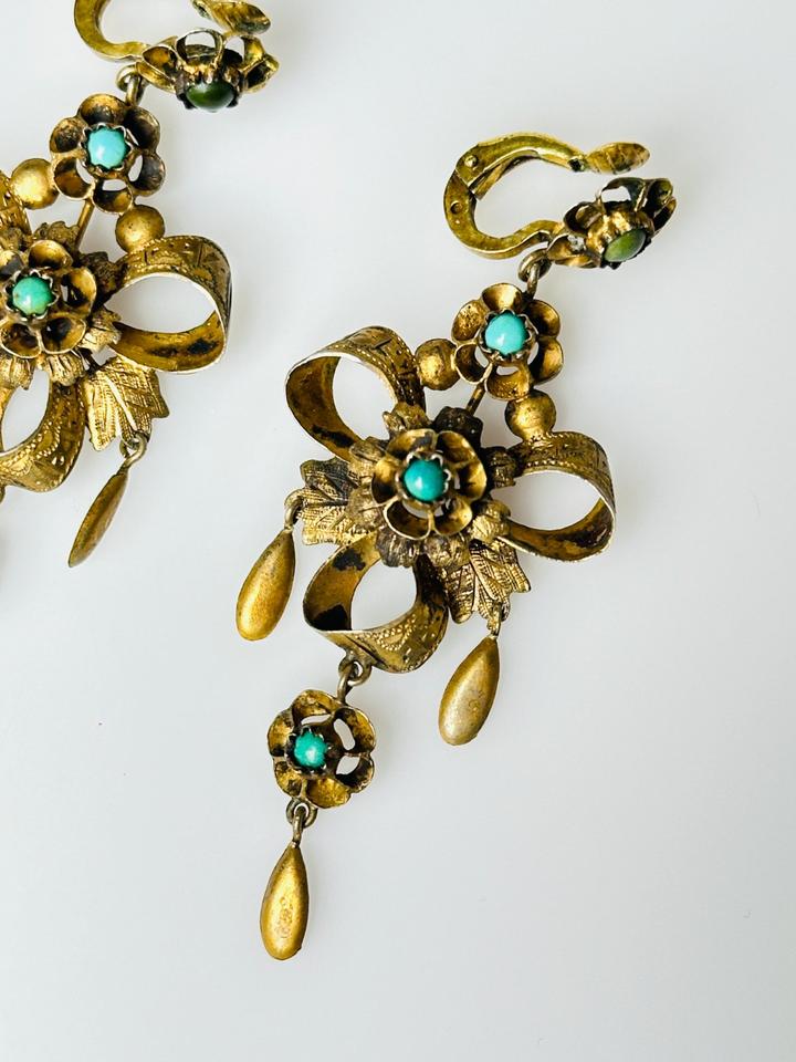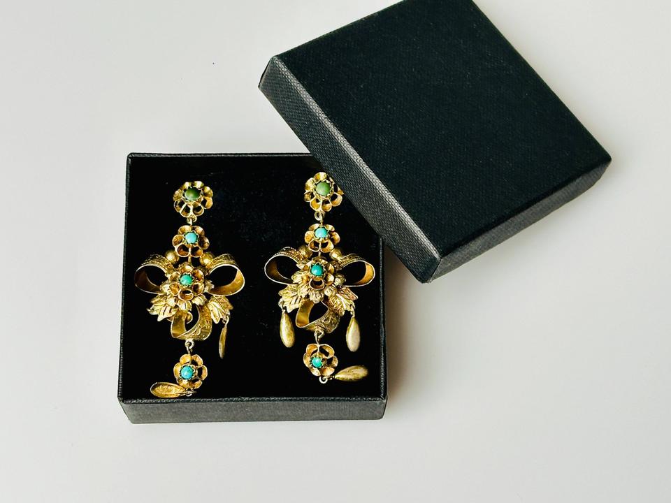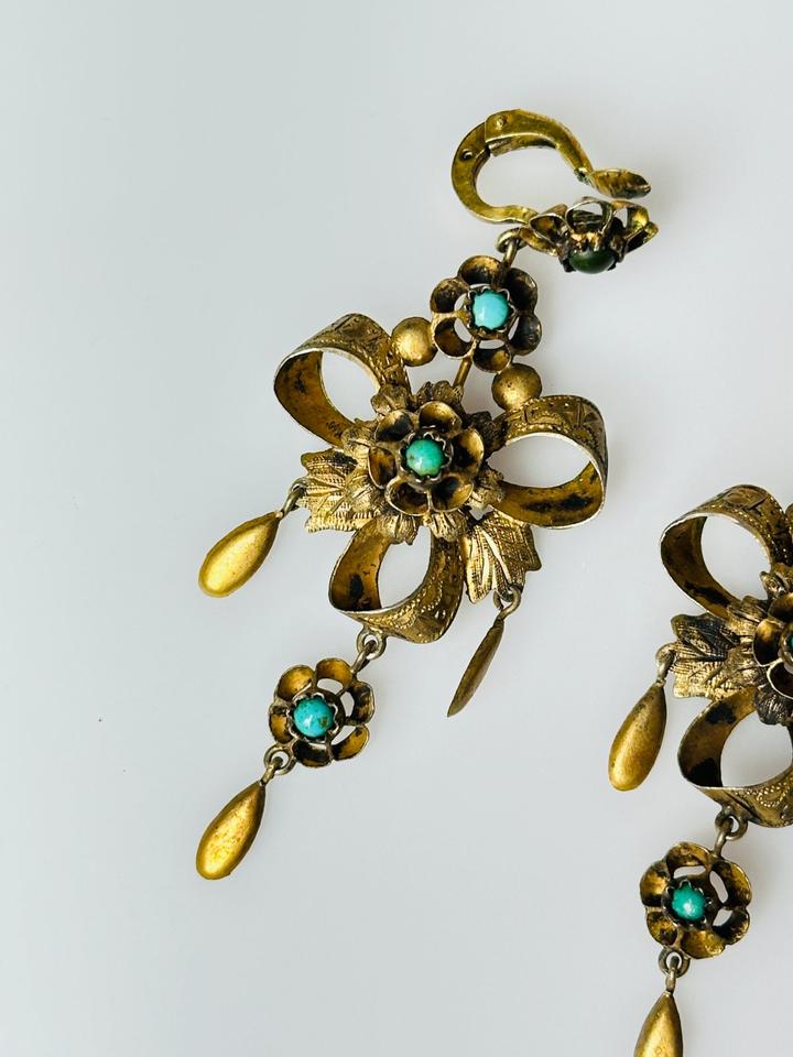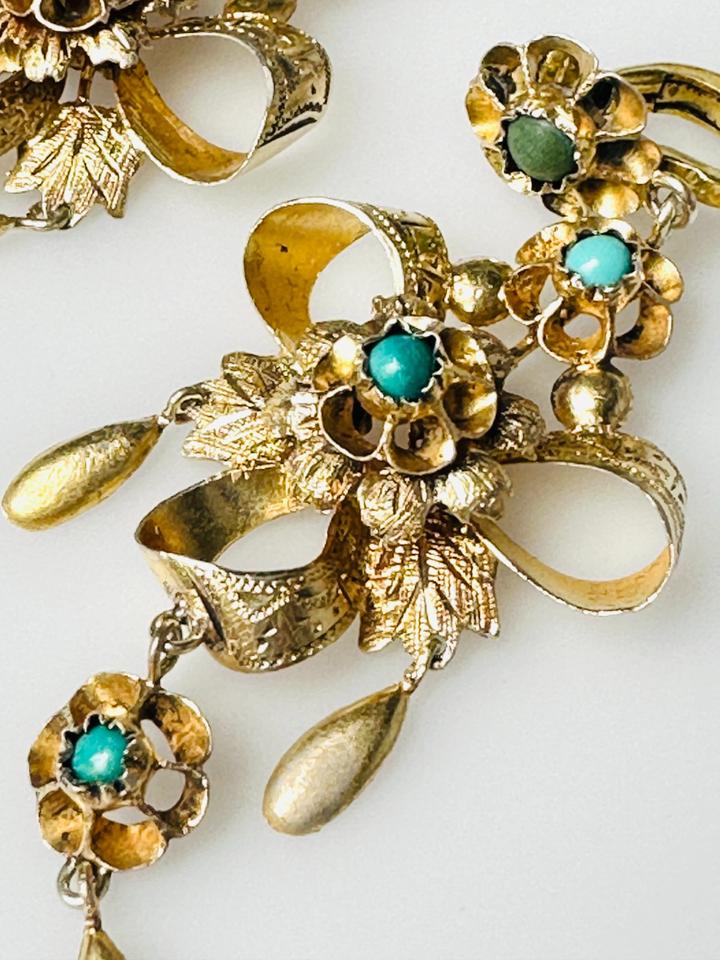 Große seltene Ohrhänger aus vergoldetem Silber mit mehreren gefassten Türkisen. Die Ohrhänger sind sehr fein gearbeitet, federleicht und tragen teilweise eine zarte Musterung auf den einzelnen Elementen. Sie sind nicht gepunzt, wurden jedoch auf Silber getestet. Die Ohrhänger sind stilistisch auf das erste Drittel des 19. Jhd.’s zurückzudatieren, der sogenannten Georgianischen Zeit (1714 -1837 / vier Georges nacheinander unter britischer Krone). Sie verfügen über einen Clip-Verschluss, der voll funktionsfähig ist.