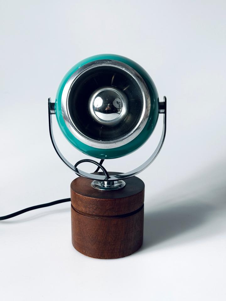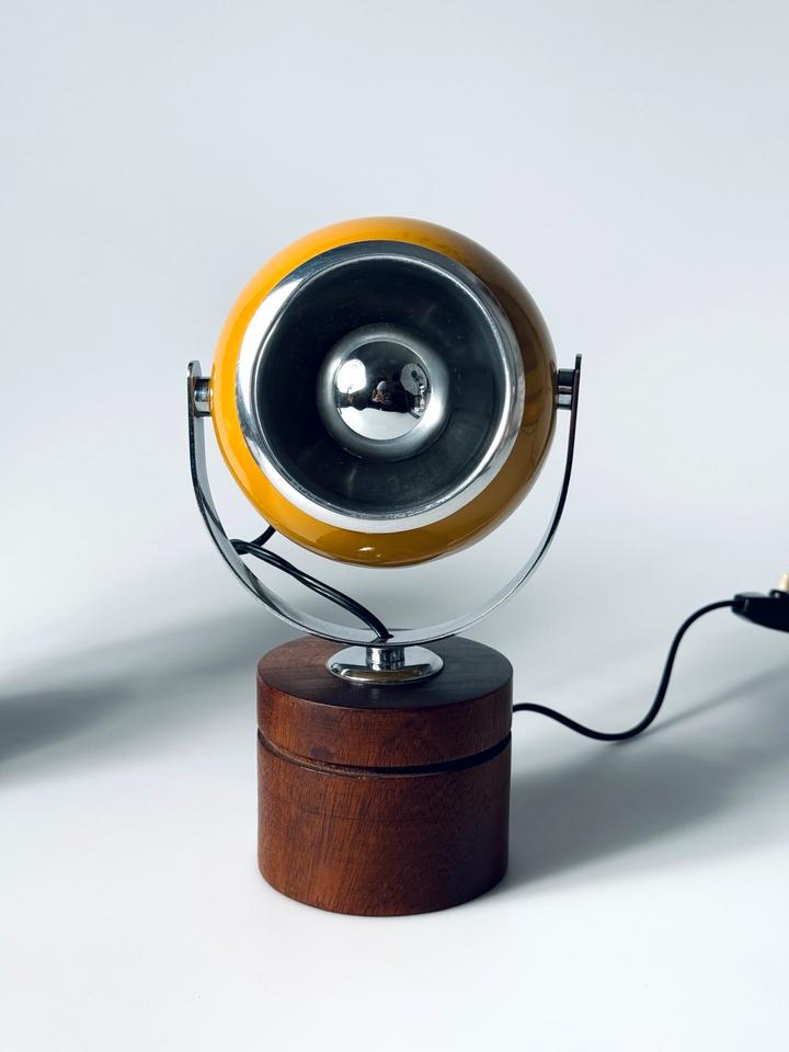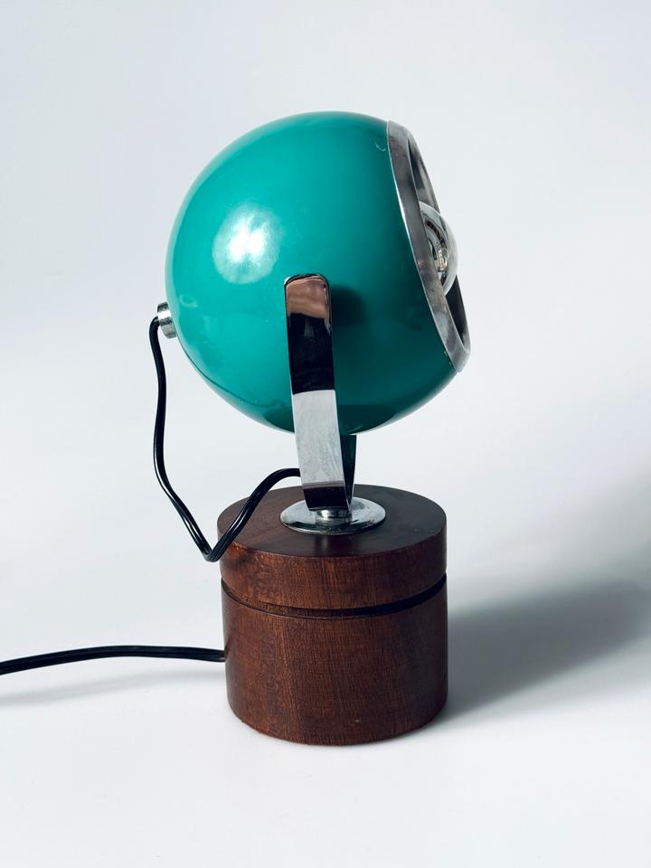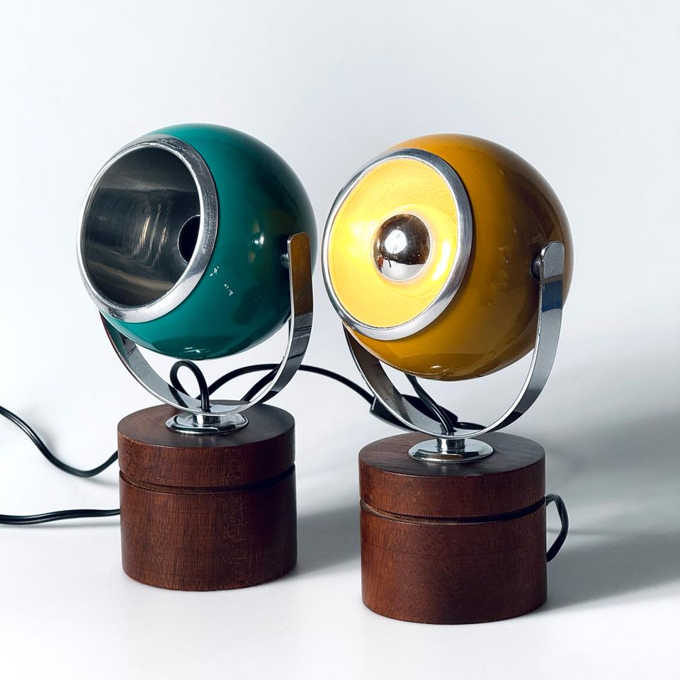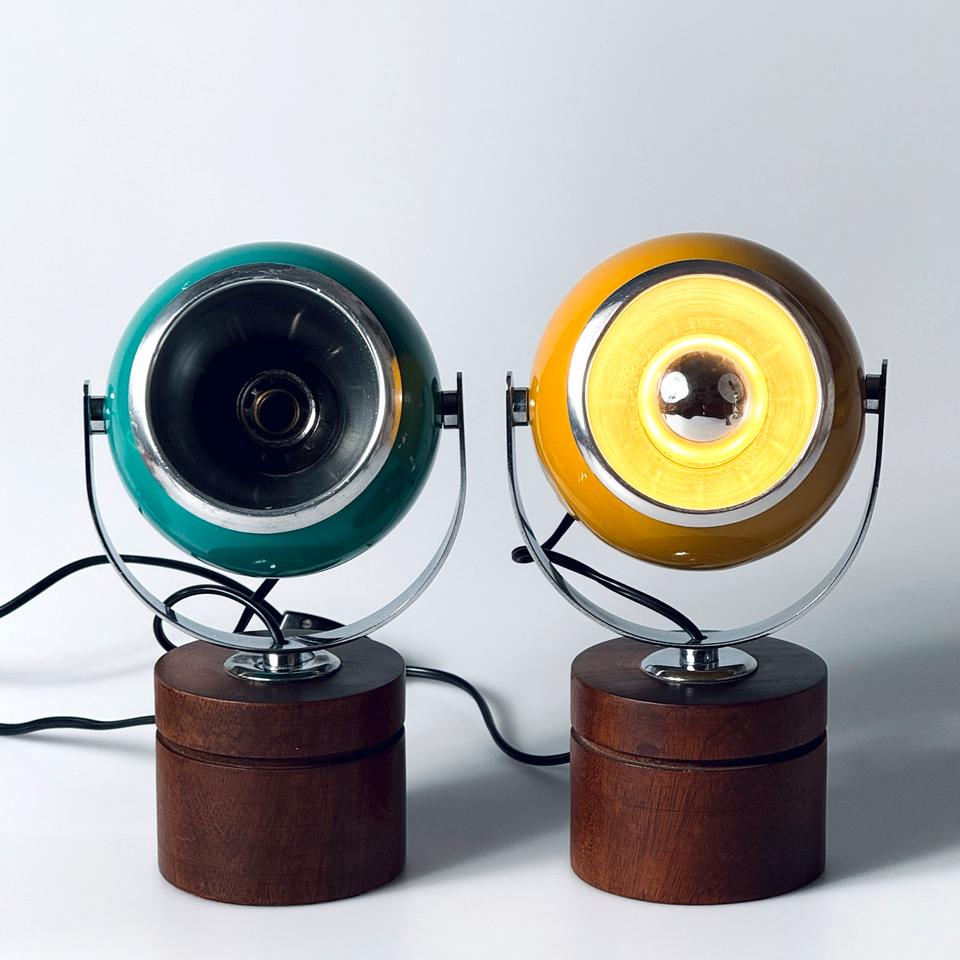 Paar von zwei charmanten Eyeball- Tischleuchten aus lackiertem Metall auf einer Basis aus Teakholz, Italien, 1970er Jahre. Die beiden Leuchten sind funktionsfähig und in gutem Zustand mit Zeichen des Alters und Gebrauchs wie Kratzern und kleinen Dellen, wie auf den Fotos ersichtlich. Sie können mit handelsüblichen LED-Leuchtmitteln für E14 Fassungen bestückt werden.