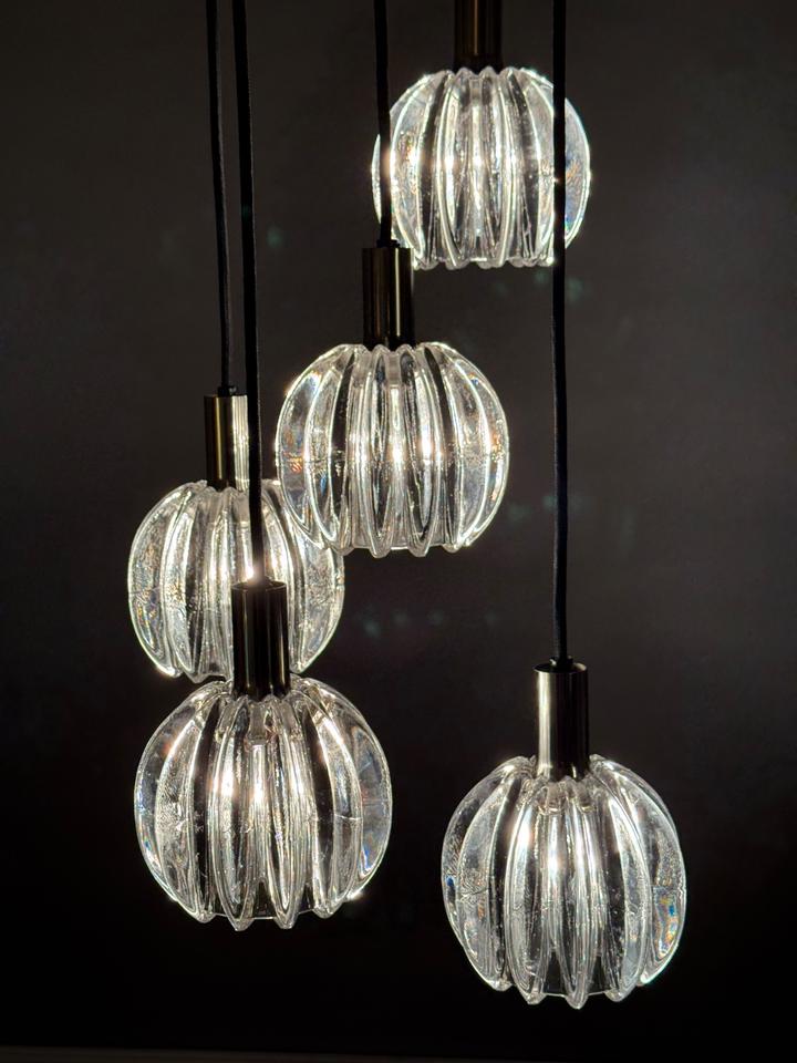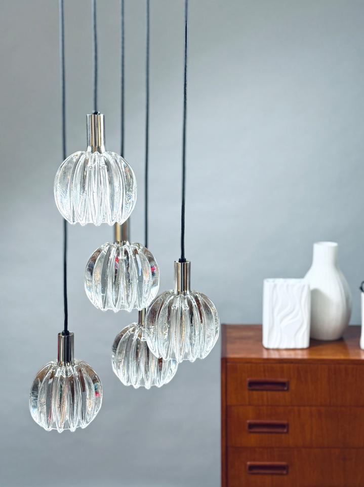 Seltene Kaskadenleuchte mit 5 Pendeln aus funkelndem Glas und verchromten Halterungen zaubert eine lichte Stimmung in jedweden Raum. Die Leuchte ist hochwertig verarbeitet und in sehr gutem Zustand, das Glas ohne jeden Makel, auch die verchromten Fassungshalterungen zeigen so gut wie keine Gebrauchsspuren, ebensowenig der Baldachin aus Chrom und mattschwarz lackiertem Metall. Die schwarzen Textilkabel wurden erneuert. Die Pendel können individuell in Höhe/ Länge angepasst werden. Sie sind jeweils mit einer E14 Fassung versehen und können mit handelsüblichen LED-Leuchtmitteln bestückt werden.