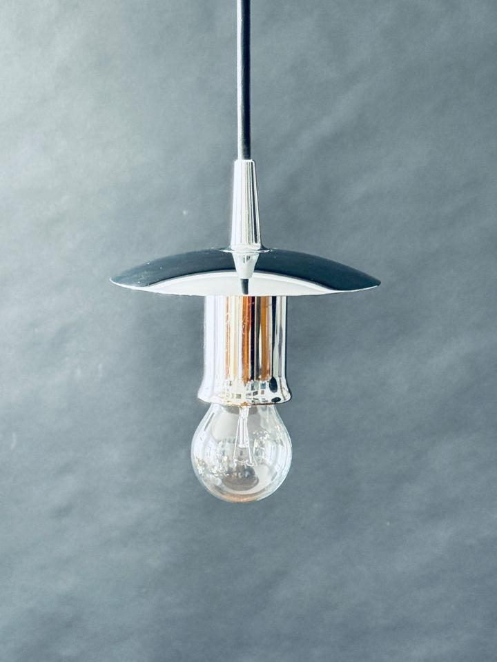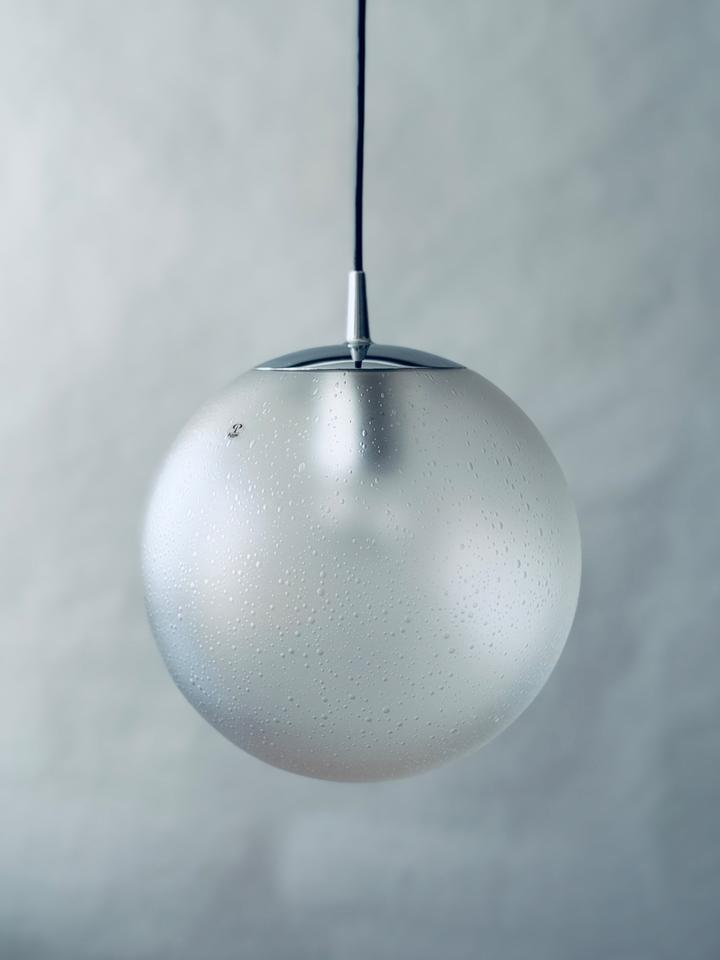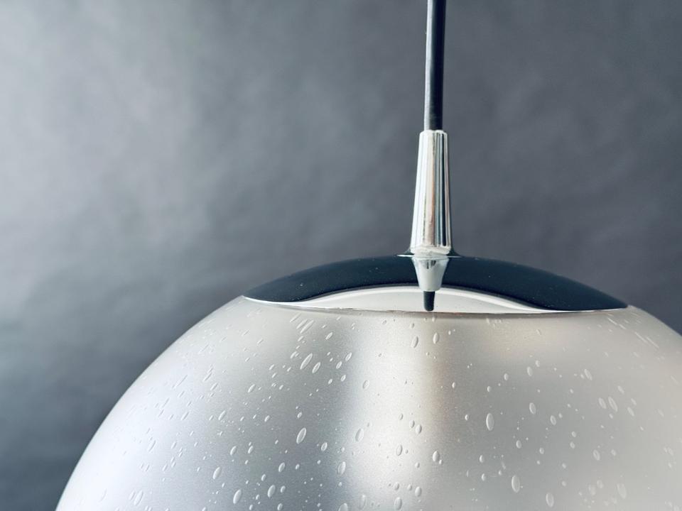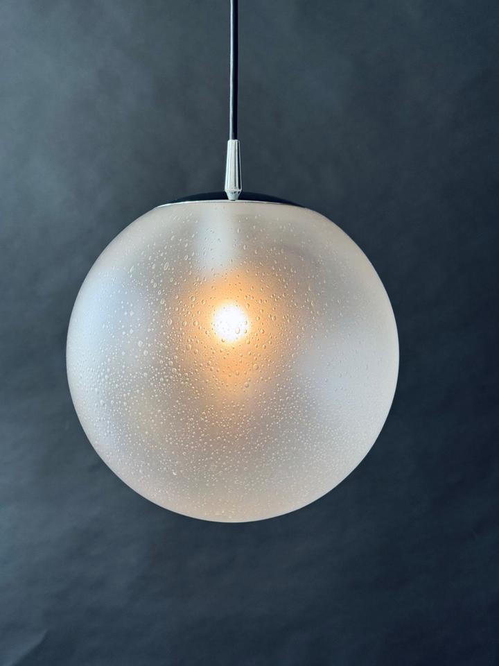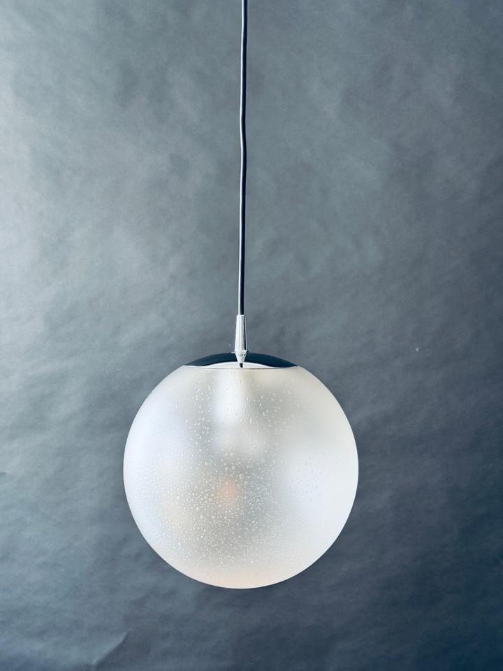 Original 1970er Pendelleuchte von Peill & Putzler. Sehr guter Zustand. Das seidenmatte handgefertigte Bubble-Glas schimmert leicht, die Chromaufhängung ist unbeschädigt und ohne jegliche Kratzer. Die Leuchte verfügt über eine E27 Fassung und kann mit handelsüblichen LED-Leuchtmitteln bestückt werden. Sie wurde gereinigt und poliert.