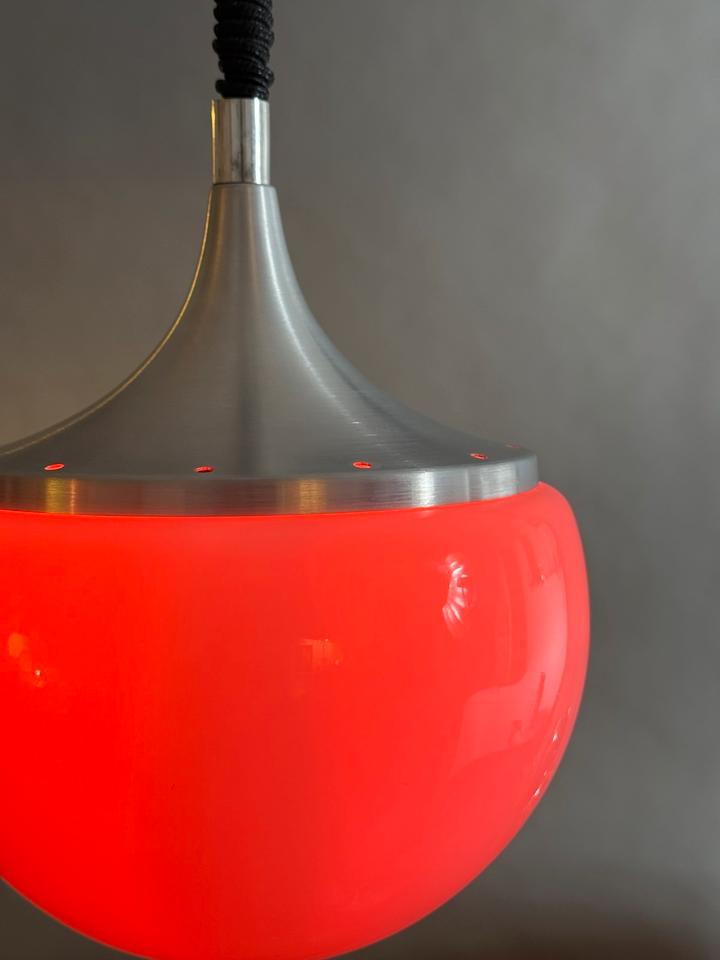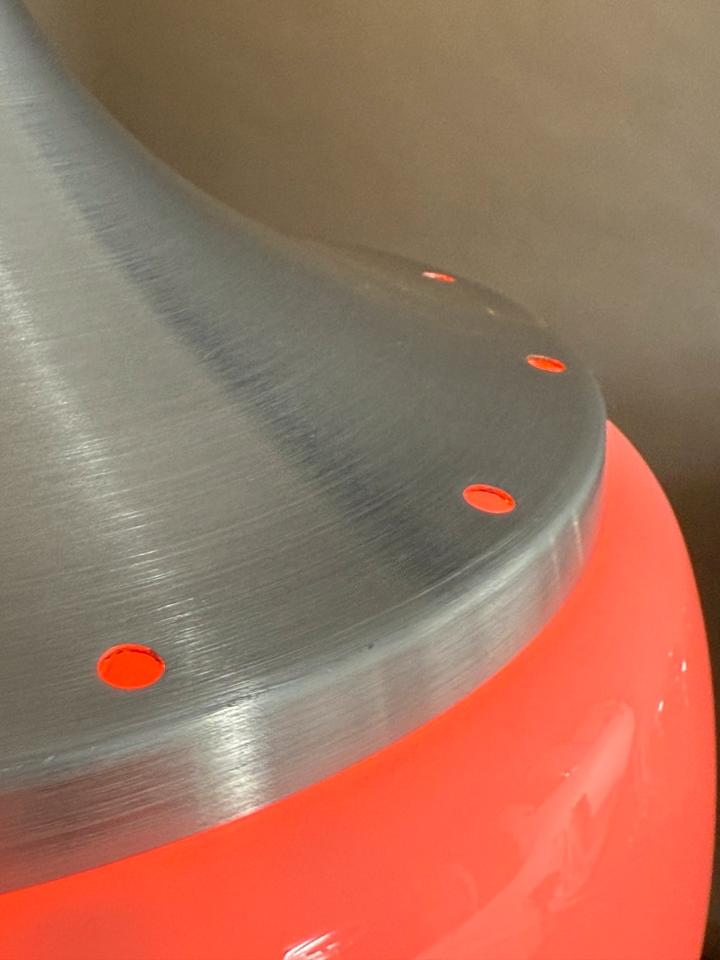 Die Pendelleuchte aus hochglänzendem Opalglas und gebürstetem Aluminium hat keinerlei Sprünge, die Öffnung zeigt partiell leichte Abstoßungen, welche aber von der Schmuckschraube verdeckt werden. Sowohl Schmuckschraube, als auch der Baldachin sind ebenfalls aus gebürstetem Aluminium, siehe Bilder.