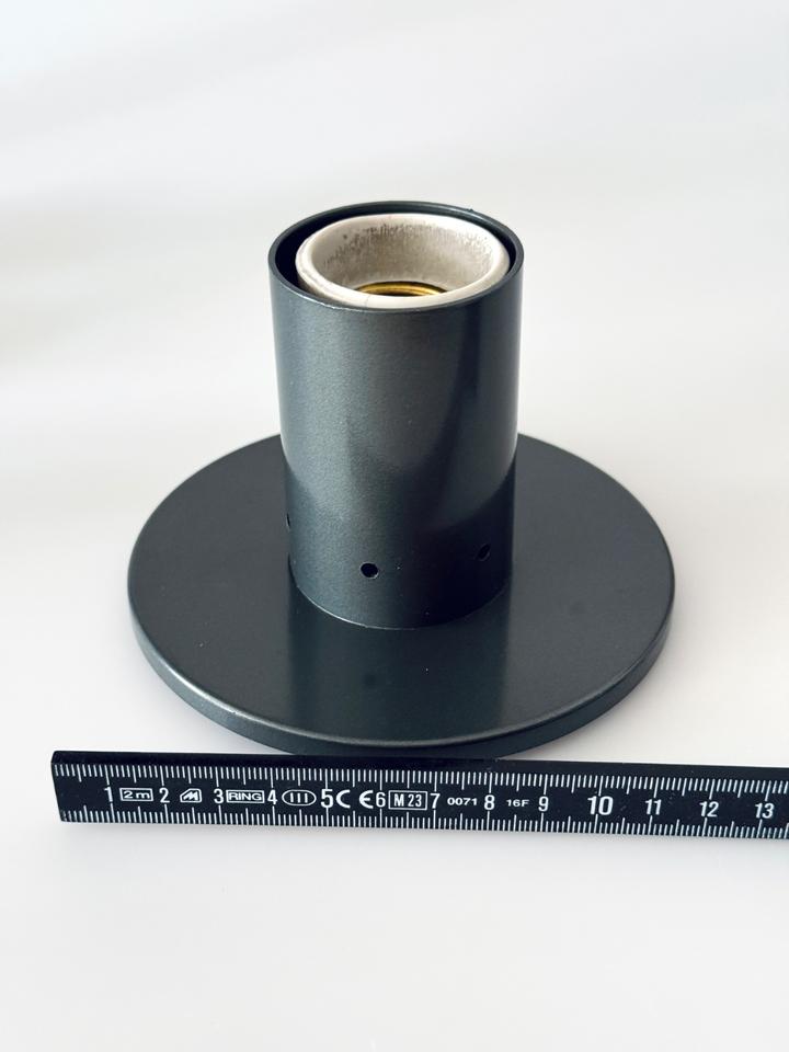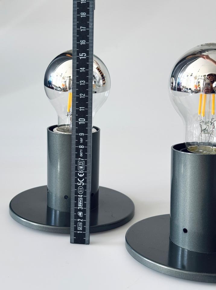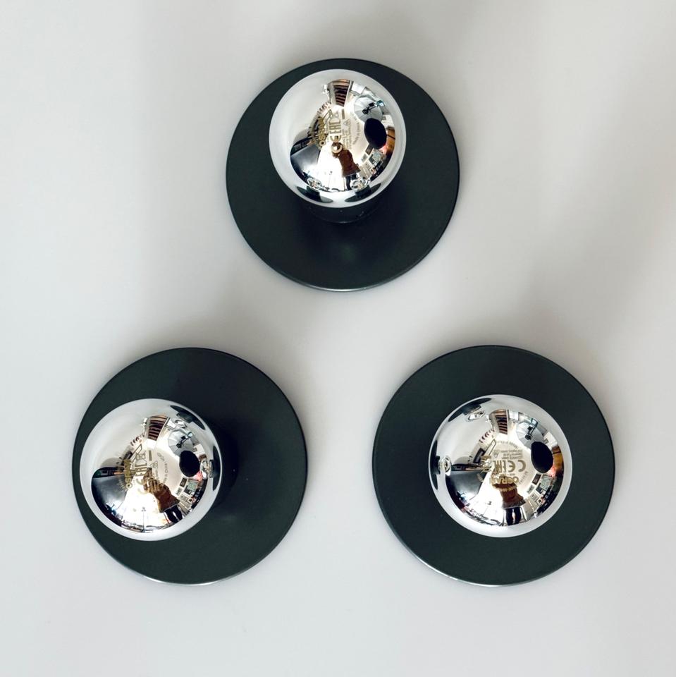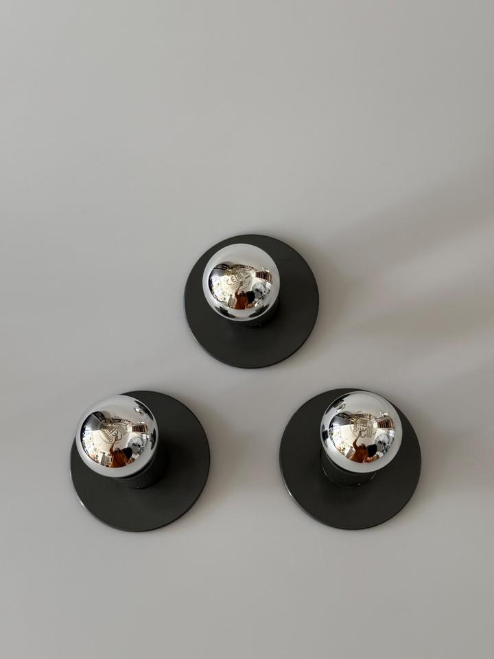Set bestehend aus drei Wandleuchten, Entwurf Sergio Mazza ( Studio Mazza/Gramigna) für Quattrifolio, Italien, 1972. Die minimalistischen Leuchten aus anthrazit lackiertem Metall in Form eines Zylinders auf einer runden Platte sind in gepflegtem gebrauchten Zustand mit wenigen Spuren des Alters in Form von Kratzern, siehe auch Bilder. Sie sind funktionstüchtig, verfügen jeweils über eine E27 Fassung und können mit handelsüblichen Leuchtmitteln bestückt werden.