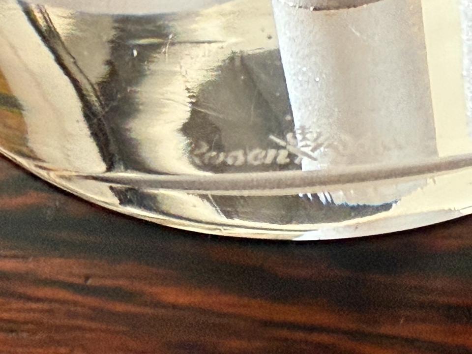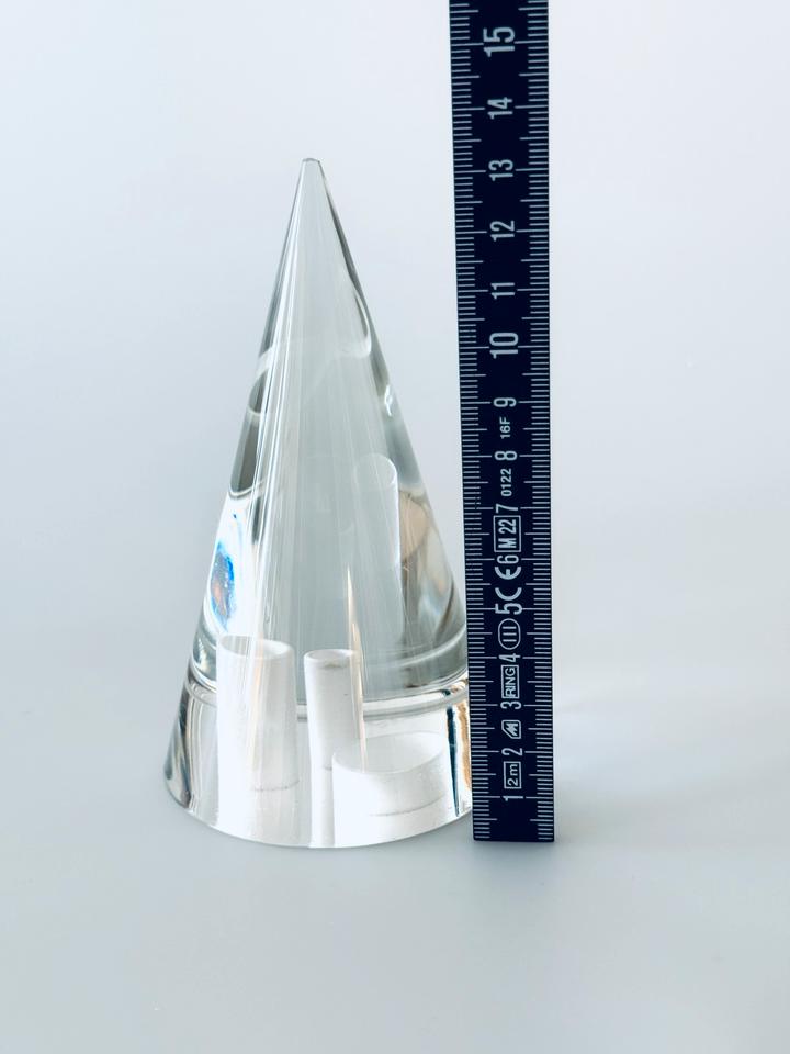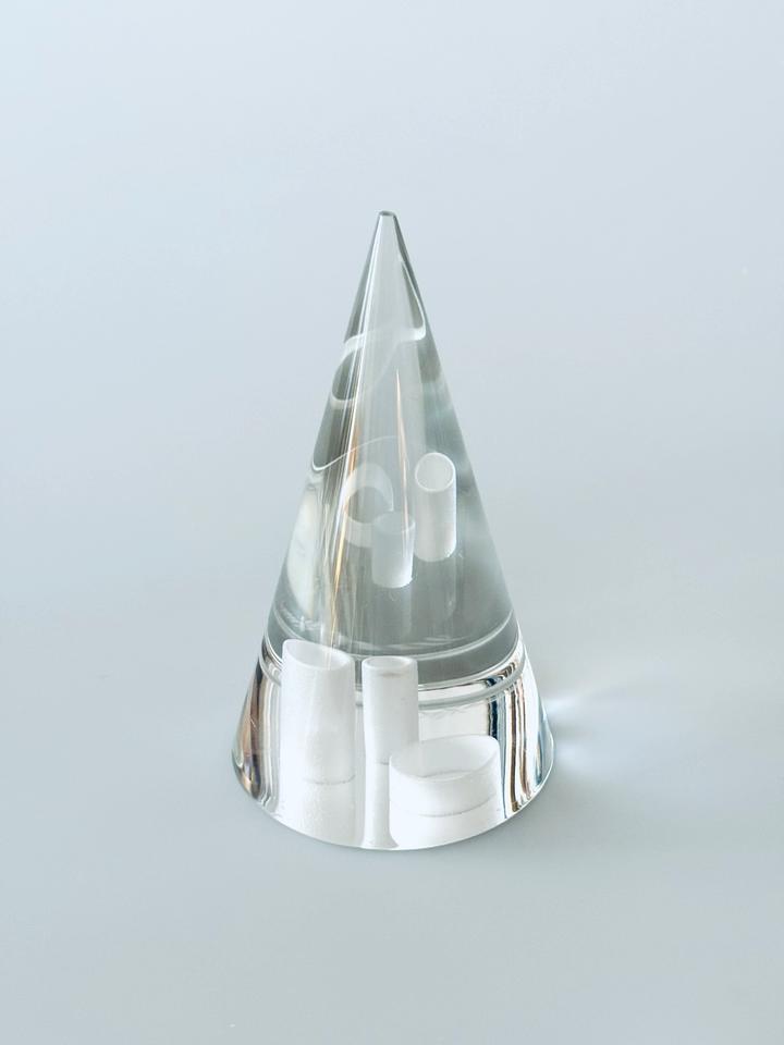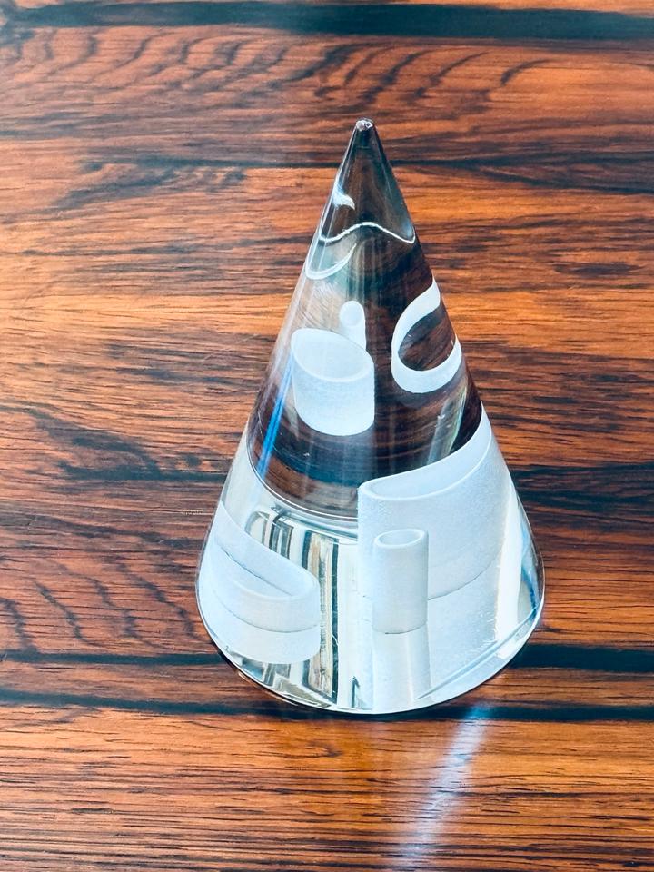 Ungewöhnliches Paperweight von Rosenthal. Der Kegelförmige Briefbeschwerer umschließt im Boden mehrere Ringe verschiedener Breite, die sich je nach Lichteinfall im Kegel doppeln. Minimale, kaum sichtbare Gebrauchsspuren, keinerlei Beschädigung. Signatur Rosenthal – Ätzstempel im Boden.