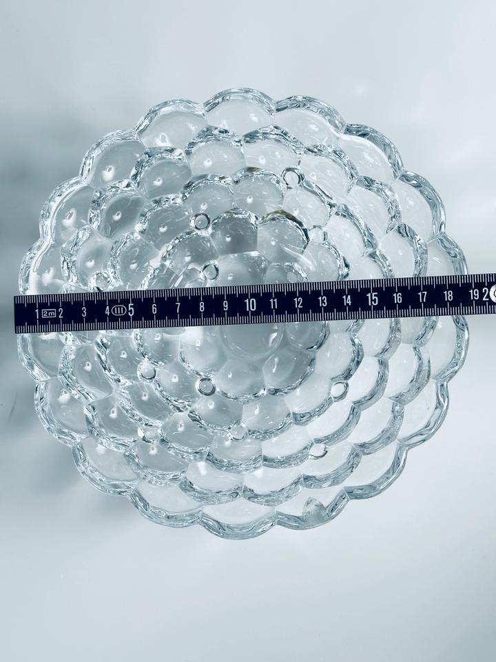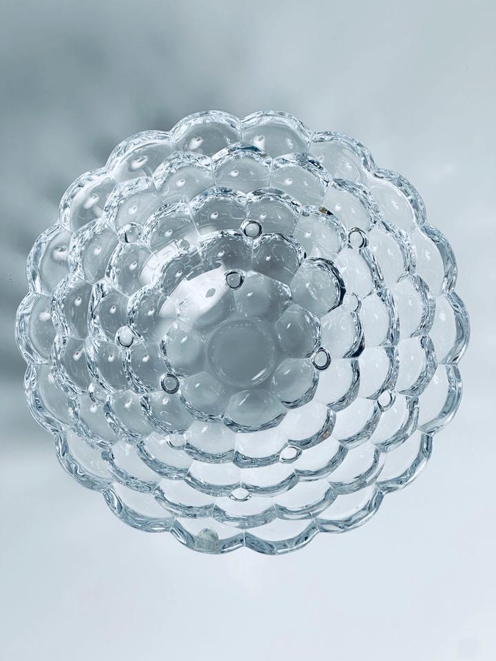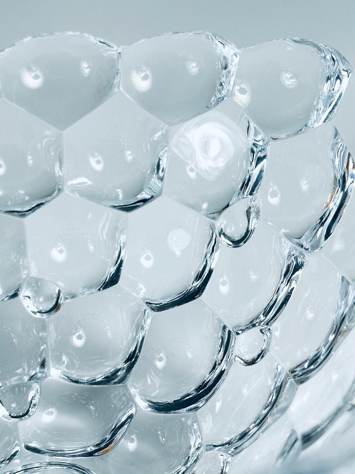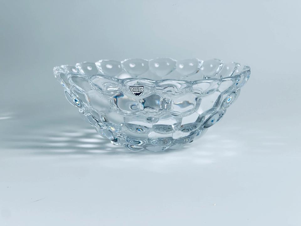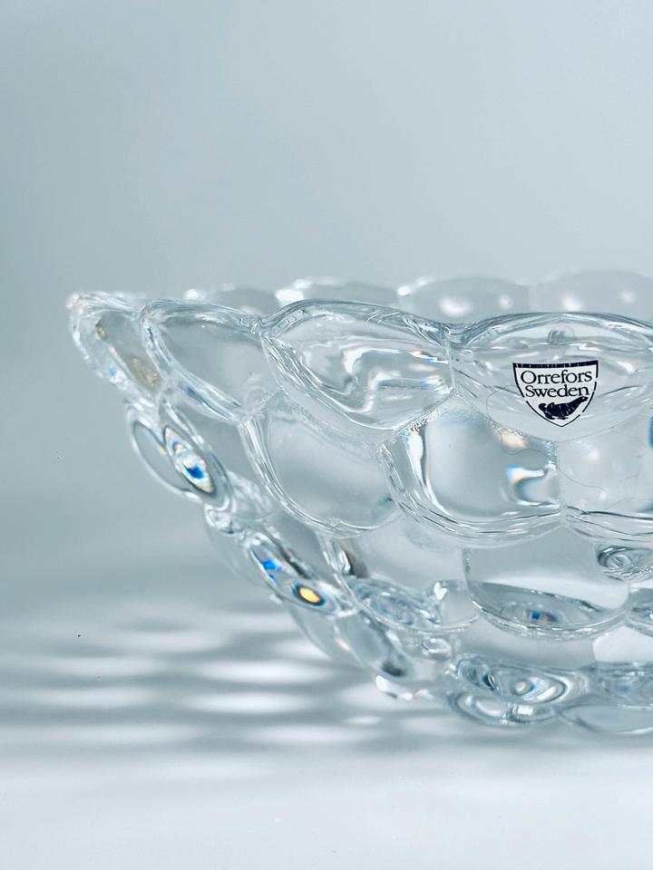 Mittelgroße schwere Kristallglasschale, Entwurf von Anne Nilsson für Orrefors, Schweden, 1970er Jahre, Modell ‚Raspberry‘. Das transparente Kristallglas, dessen Oberfläche an die Ausrundungen und Oberfläche von Himbeeren erinnert, zeigt sich in hervorragendem Zustand, ist vitrinengepflegt, außerdem ist das Orrefors Label noch vorhanden.