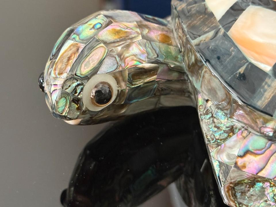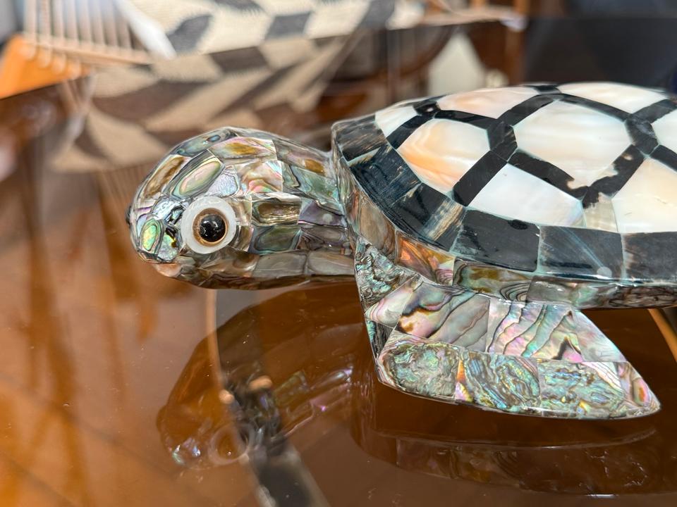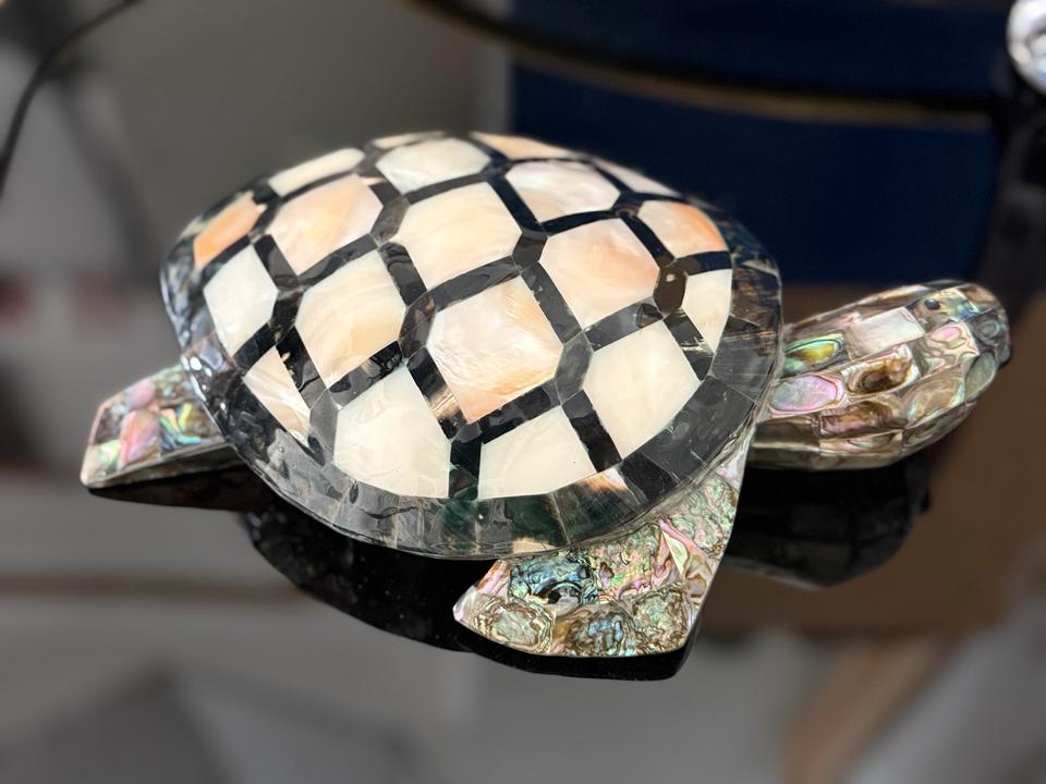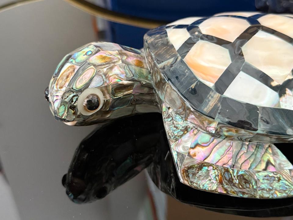 Handgefertigte große Schildkröte aus Perlmutt und Obsidian, Mexiko.