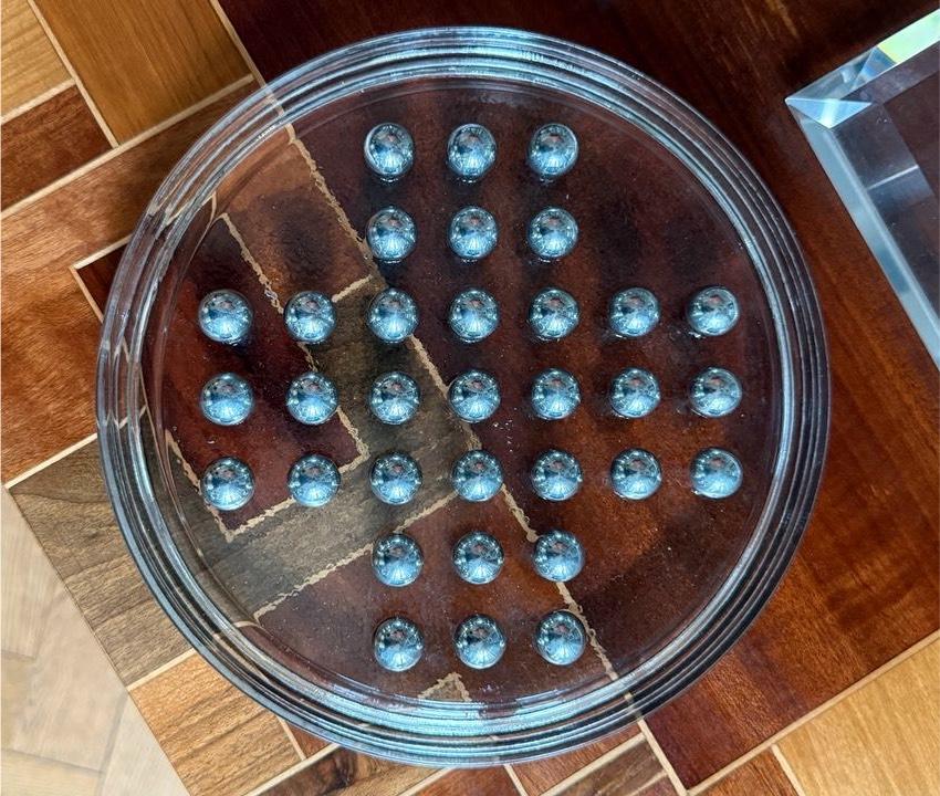 Gepflegtes Solitairespiel , bestehend aus Acrylspielplatte und 35 Edelstahlkugeln. Die Platte weist leichte Gebrauchsspuren in Form von Kratzern auf, die Kugeln wurden aufpoliert und zeigen keinerlei Oxidations -noch sonstige Schäden. Es wird bei Interesse noch eine Spielplatte aus Eisglas mitgeliefert.