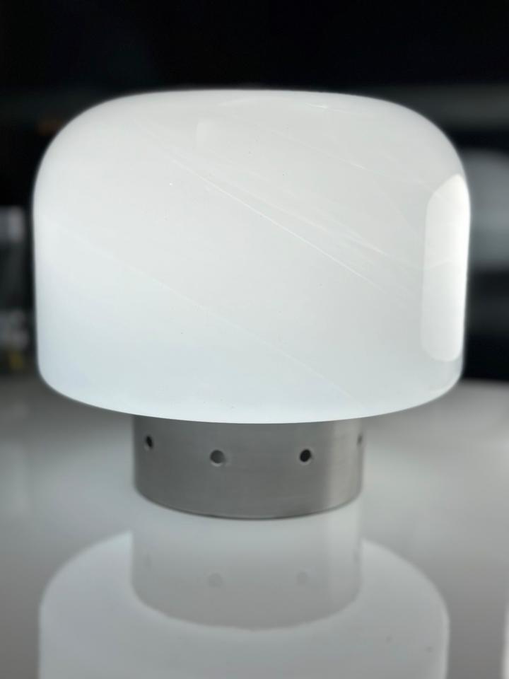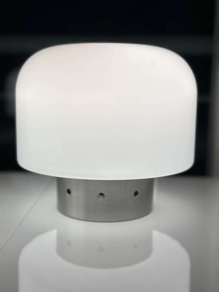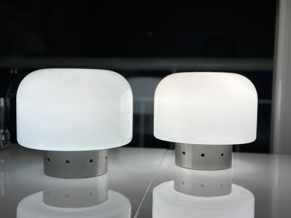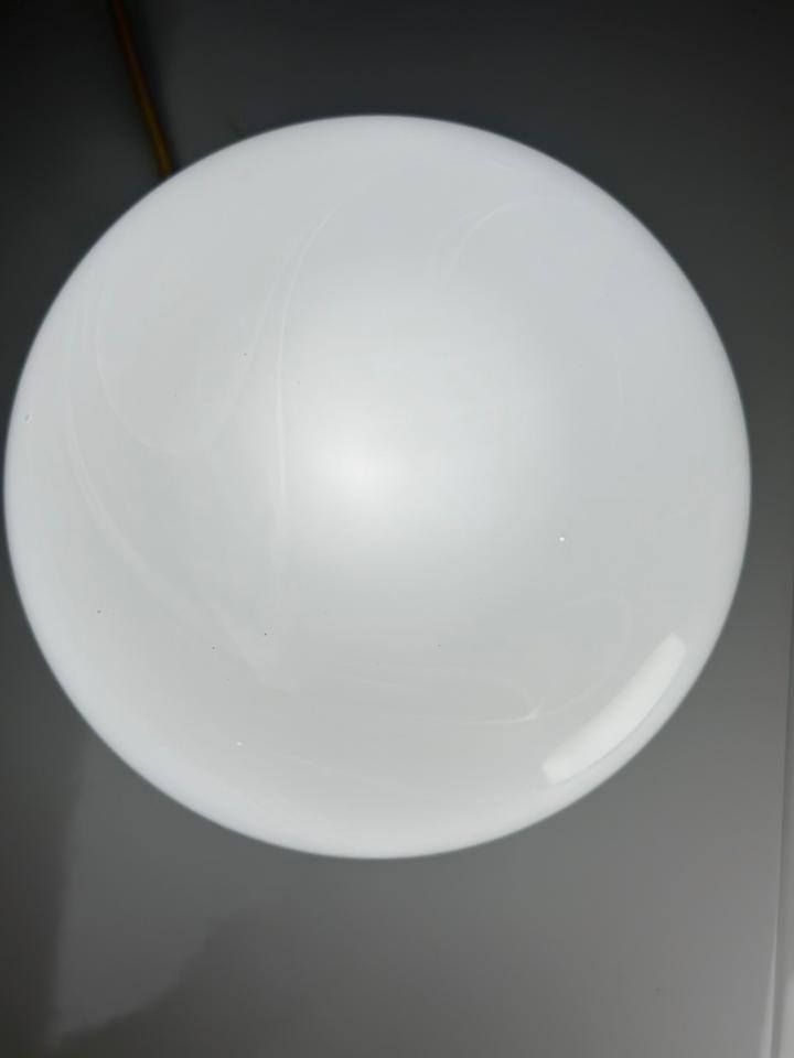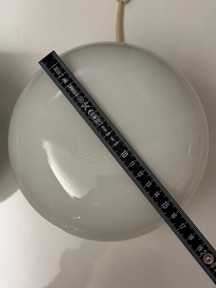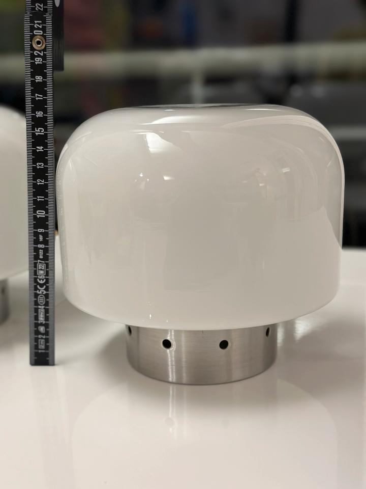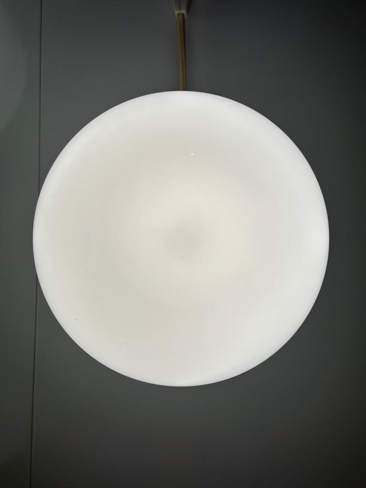 Die Leuchte aus Opalglas und gebürstetem Aluminium ist ohne jedwede Beschädigung, der Zustand ist sehr gut, lediglich Kabel und Schalter zeigen Spuren der Zeit in Form von Vergilbung, siehe Bilder.
