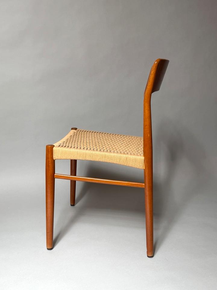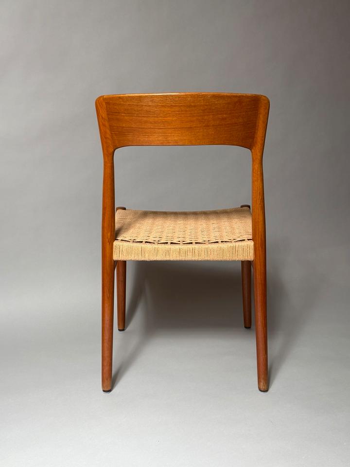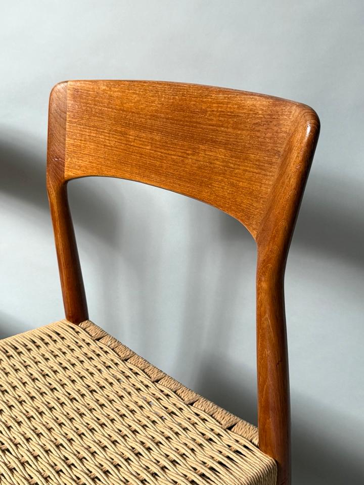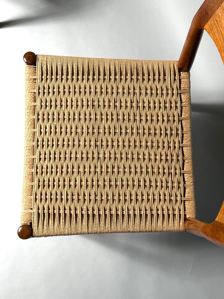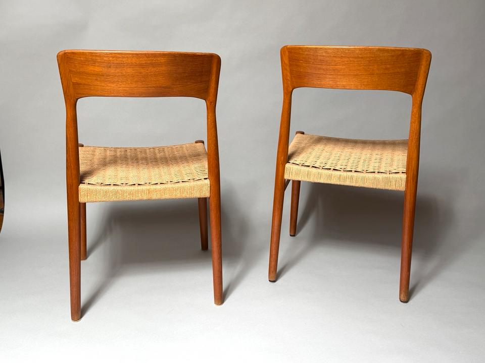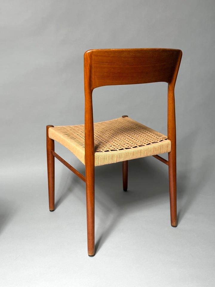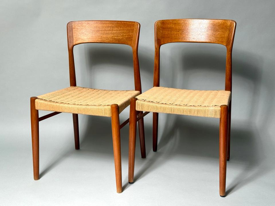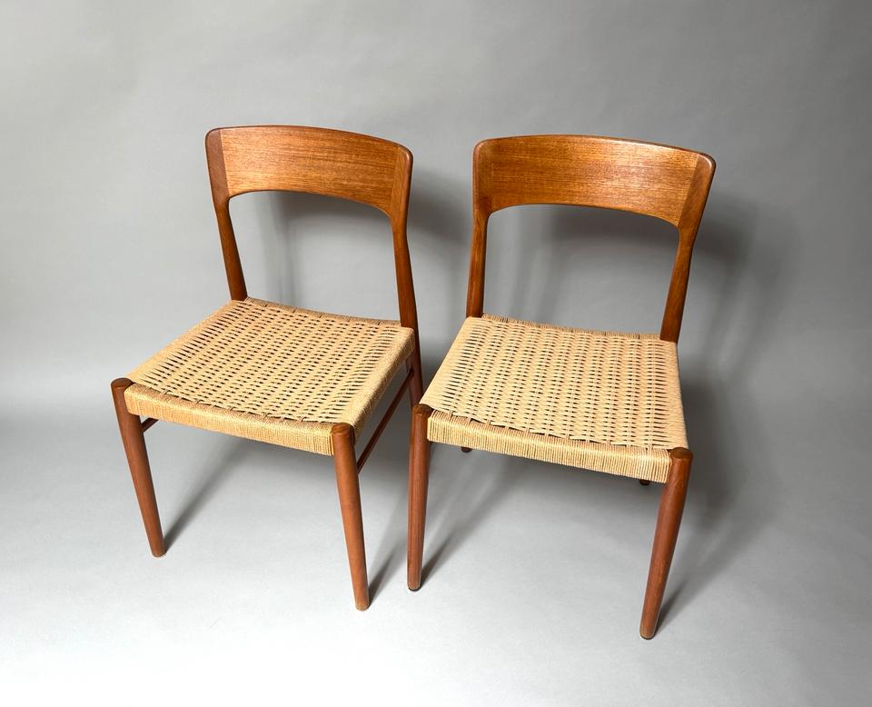 Paar von zwei Stühlen, Entwurf von Henning Kjærnulf für Kai Kristiansen, Dänemark, 1960er. Die aus Teakholz gefertigten Stühle mit Sitzfläche aus Paperchord befinden sich in einem gepflegten, schönen Vintage-Zustand mit alterstypischen Gebrauchspuren und ohne jedwede Mängel. Die Stühle wurden gereinigt und das Teakholz aufgearbeitet.