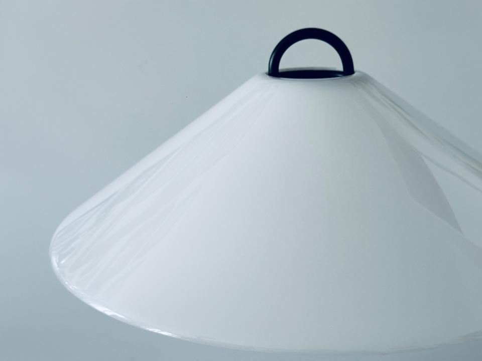 Tischleuchte aus den späten 1970ern, Italien. Der ausladende, konische weiße Lampenschirm aus Kunststoff sitzt auf einer schwarzlackierten Metallbasis. Sehr guter Zustand mit nur minimalen Spuren des Gebrauchs.