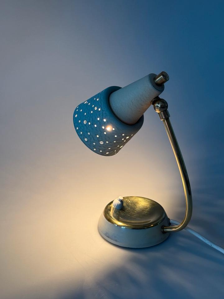 Kleine Tischleuchte aus Metall, Deutschland, 1950er Jahre. Für die 50er typische Formgebung mit mintgrünem und warmweißen Schrumpflack, Messinghals mit Kugelgelenk, der Schirm mit Lochmusterung.