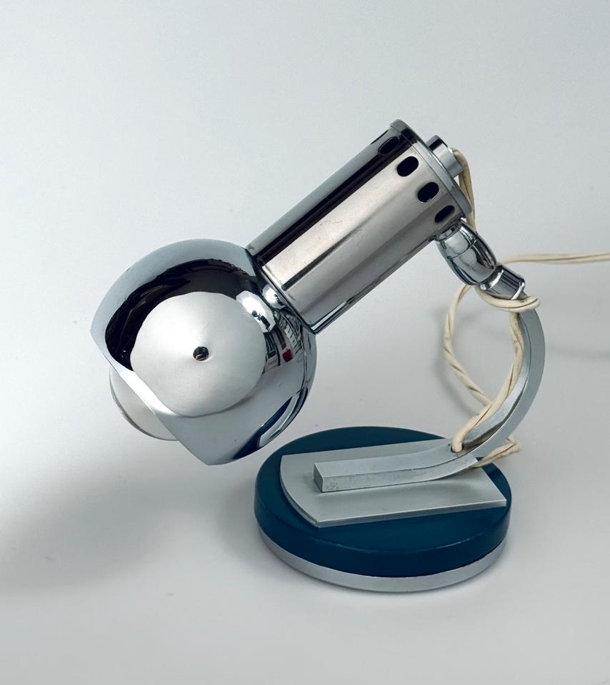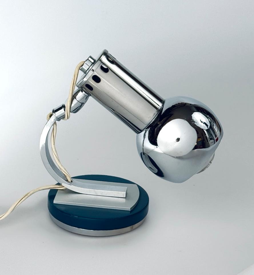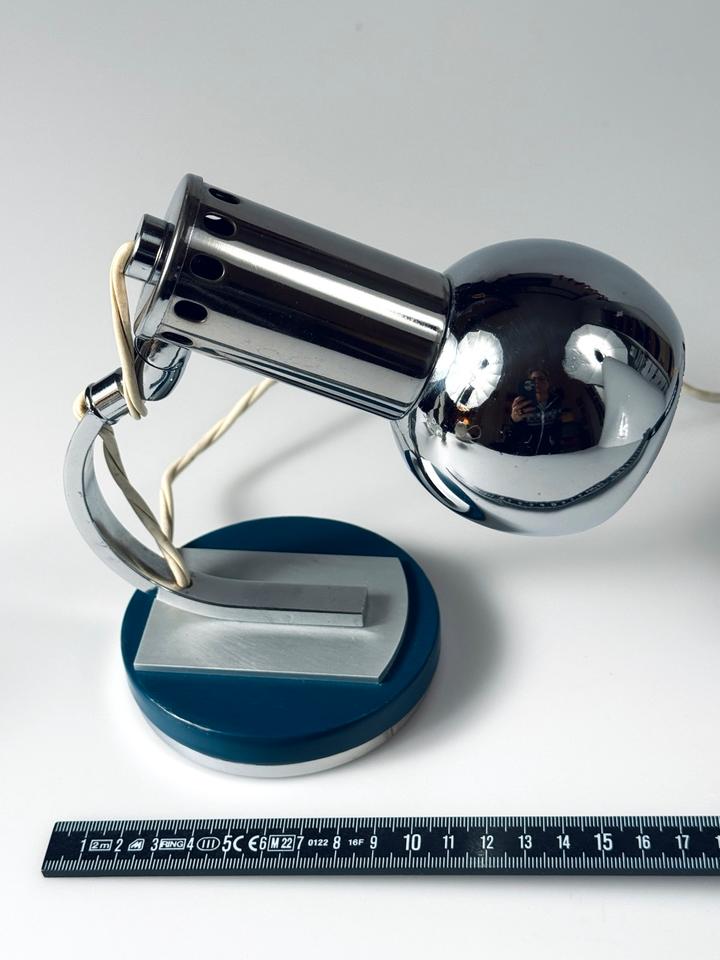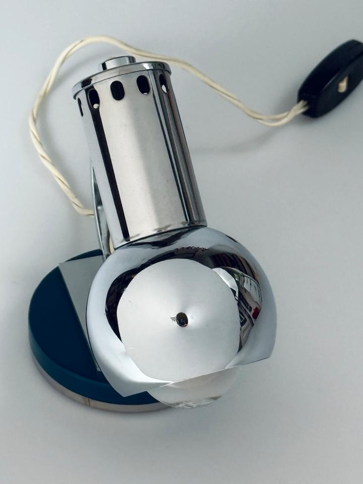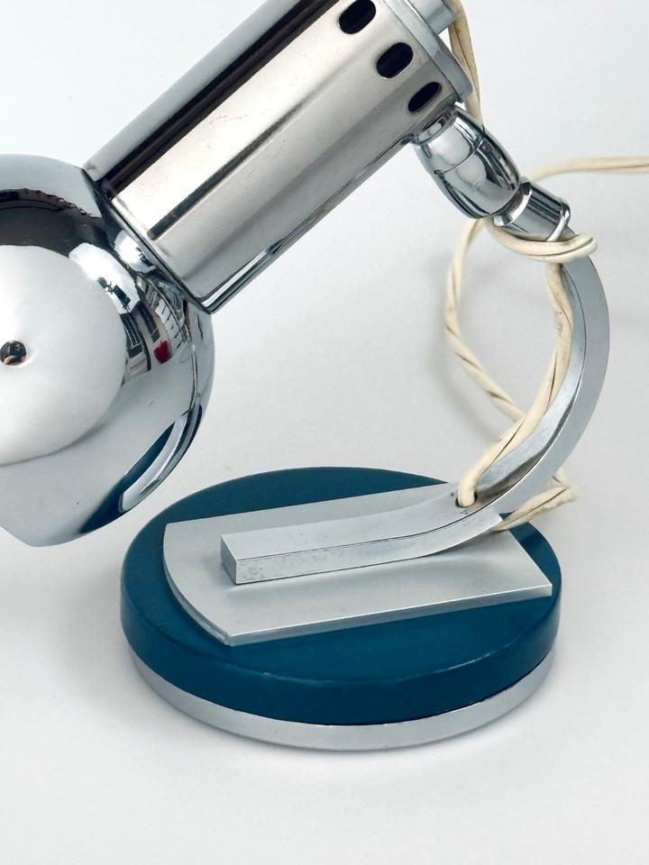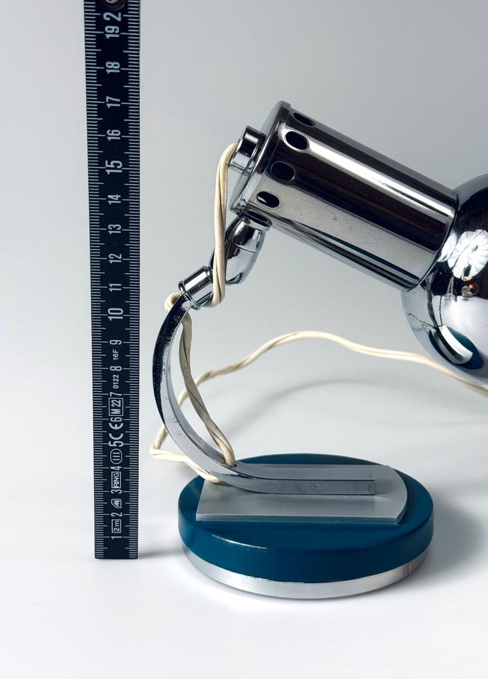 Die Leuchte aus verchromtem Metall auf einer runden mit petrolfarbenem Lack versehenen Basis aus Holz und Metall zeigt Spuren des Alters und Gebrauchs in Form von Kratzern und Oxidation, siehe Bilder.