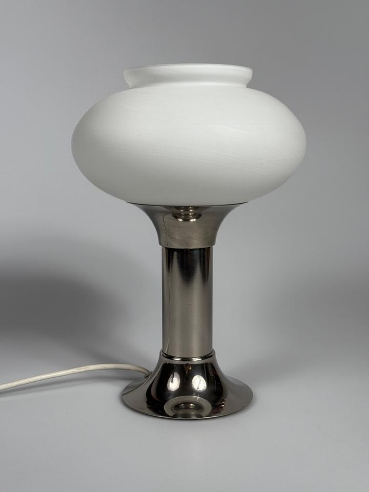 Tischleuchte von VEB Narva Lengefeld, DDR, 1970er Jahre. Sie besteht aus einem verchromten Fuss, der von einem elliptischen Opalglasschirm gekrönt wird. Der Glasschirm hat keinerlei Beschädigungen, lediglich der Rand ist etwas unregelmäßig. Die Leuchte befindet sich in einem guten, alterstypischen Zustand. Sie ist voll funktionsfähig und wurde gereinigt und poliert.