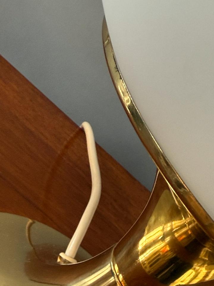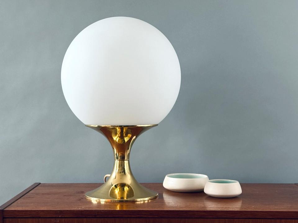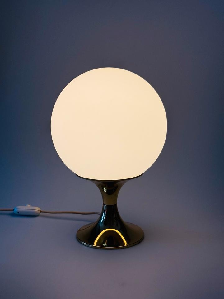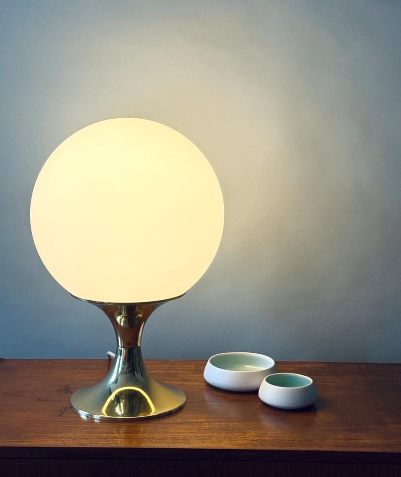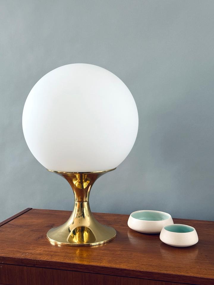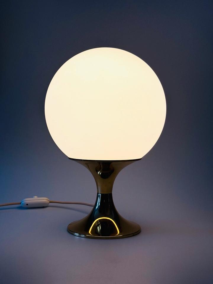 Tischleuchte von Leclaire & Schäfer, Deutschland, 1970er Jahre. Die hochwertig verarbeitete Leuchte besteht aus einer schweren goldfarbenen Basis aus Metall, der Schirm aus schwerem mattierten Opalglas. Sie ist funktionsfähig und in gutem Zustand mit Zeichen des Alters und Gebrauchs wie geringfügigen Kratzern, wie auf den Fotos ersichtlich. Das Glas hat keine Beschädigungen, das Kabel zeigt Vergilbungsspuren. Sie kann mit handelsüblichen LED-Leuchtmitteln für eine E27 Fassung bestückt werden.