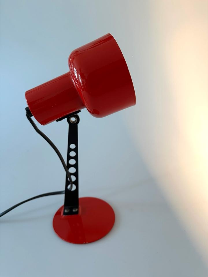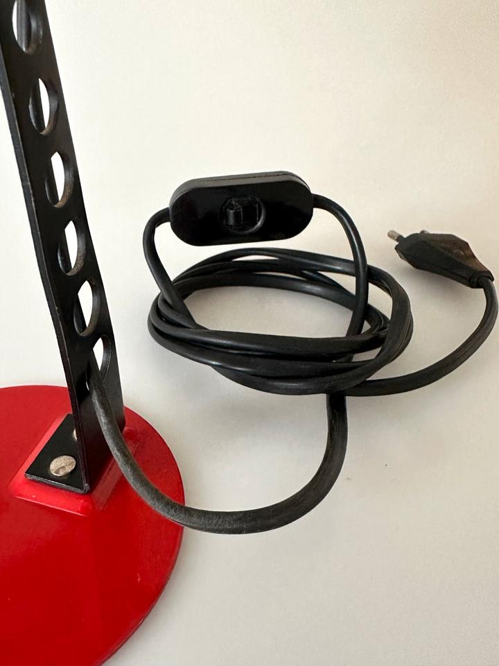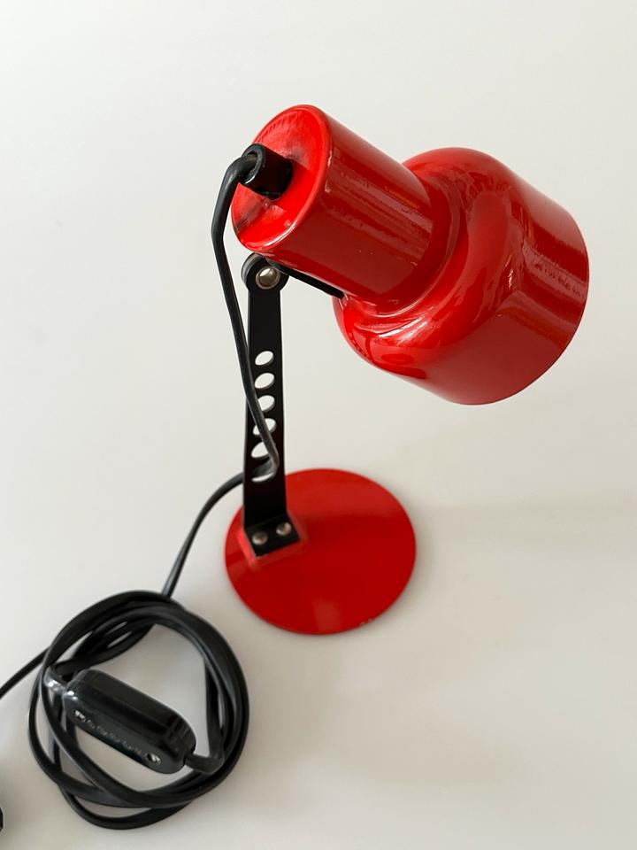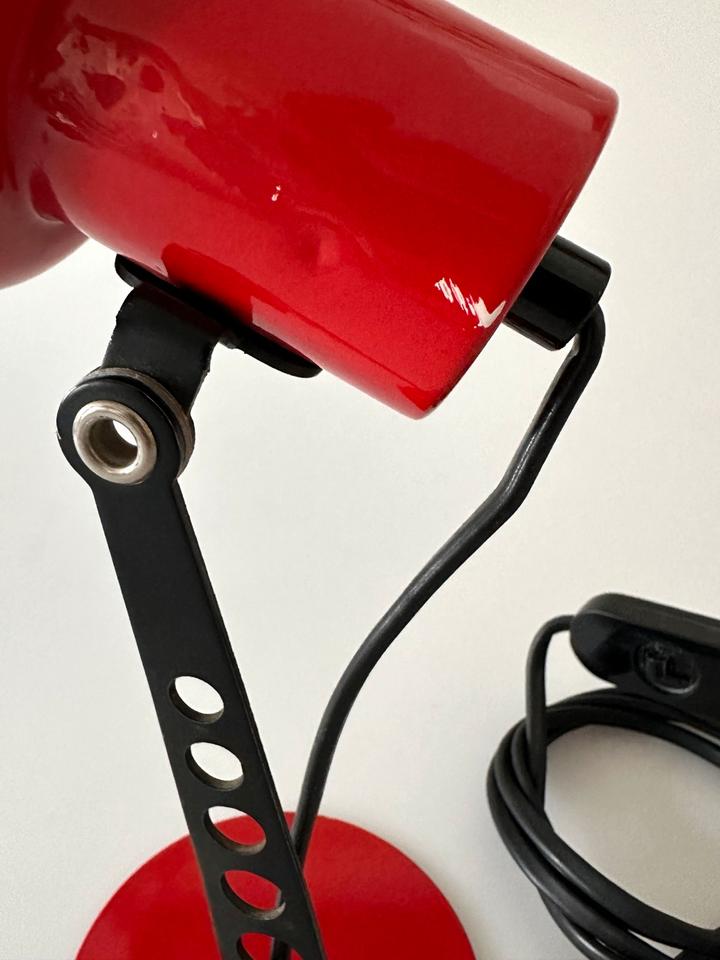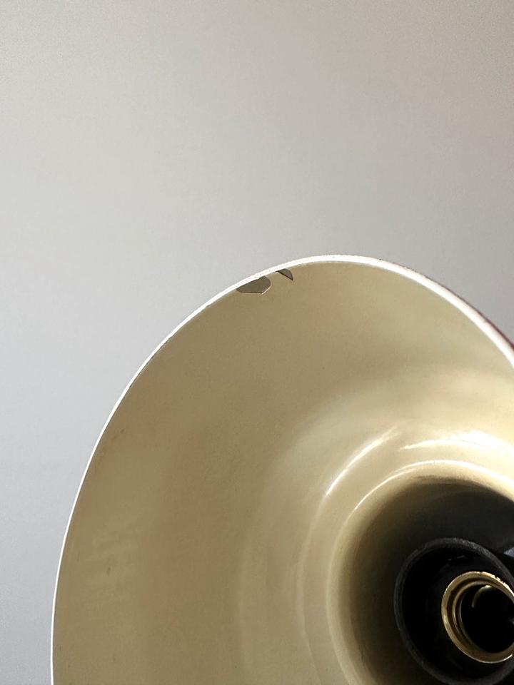 Der Zustand ist gut, die Leuchte zeigt moderate Gebrauchsspuren in Form von Lackabrieb, einer minimalen Delle und Kratzern, siehe Bilder. Sie ist voll funktionsfähig. Sie verfügt über eine E-14 Fassung, die mit gängigen LED-Leuchtmitteln bestückt werden kann. Sie wurde gereinigt und poliert.