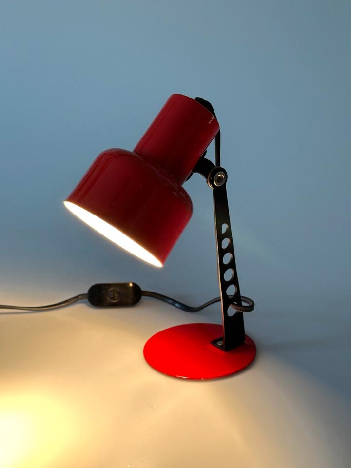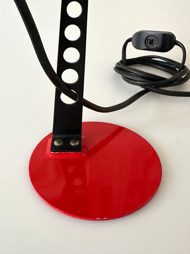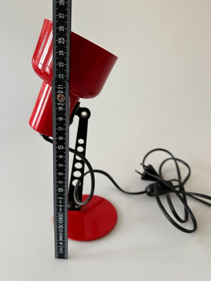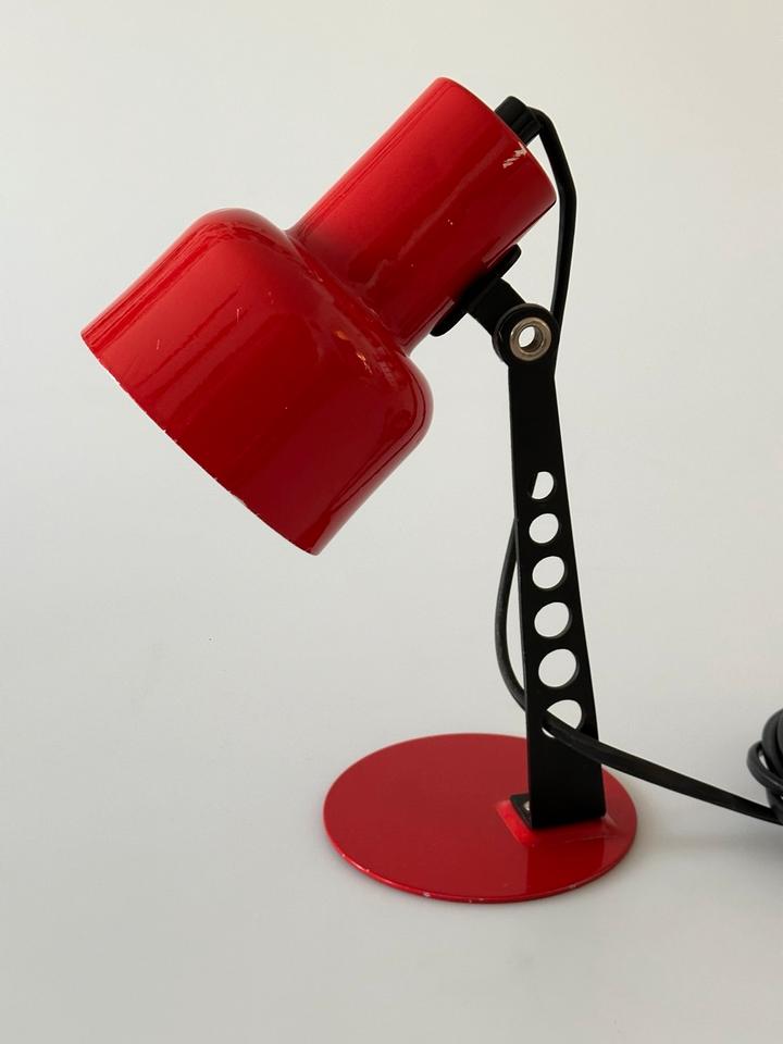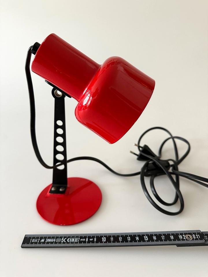 Der Zustand ist gut, die Leuchte zeigt moderate Gebrauchsspuren in Form von Lackabrieb, einer minimalen Delle und Kratzern, siehe Bilder. Sie ist voll funktionsfähig. Sie verfügt über eine E-14 Fassung, die mit gängigen LED-Leuchtmitteln bestückt werden kann. Sie wurde gereinigt und poliert.